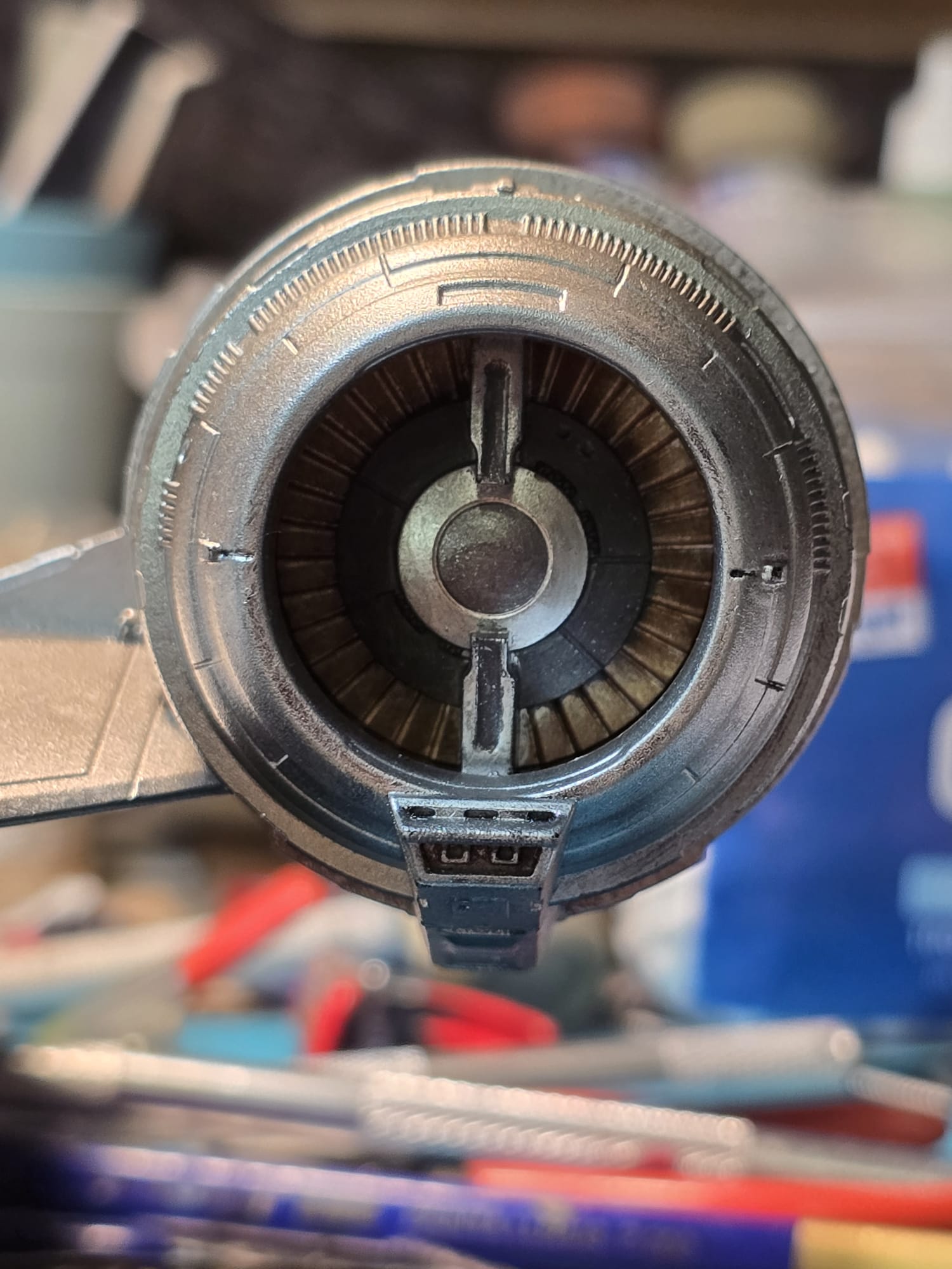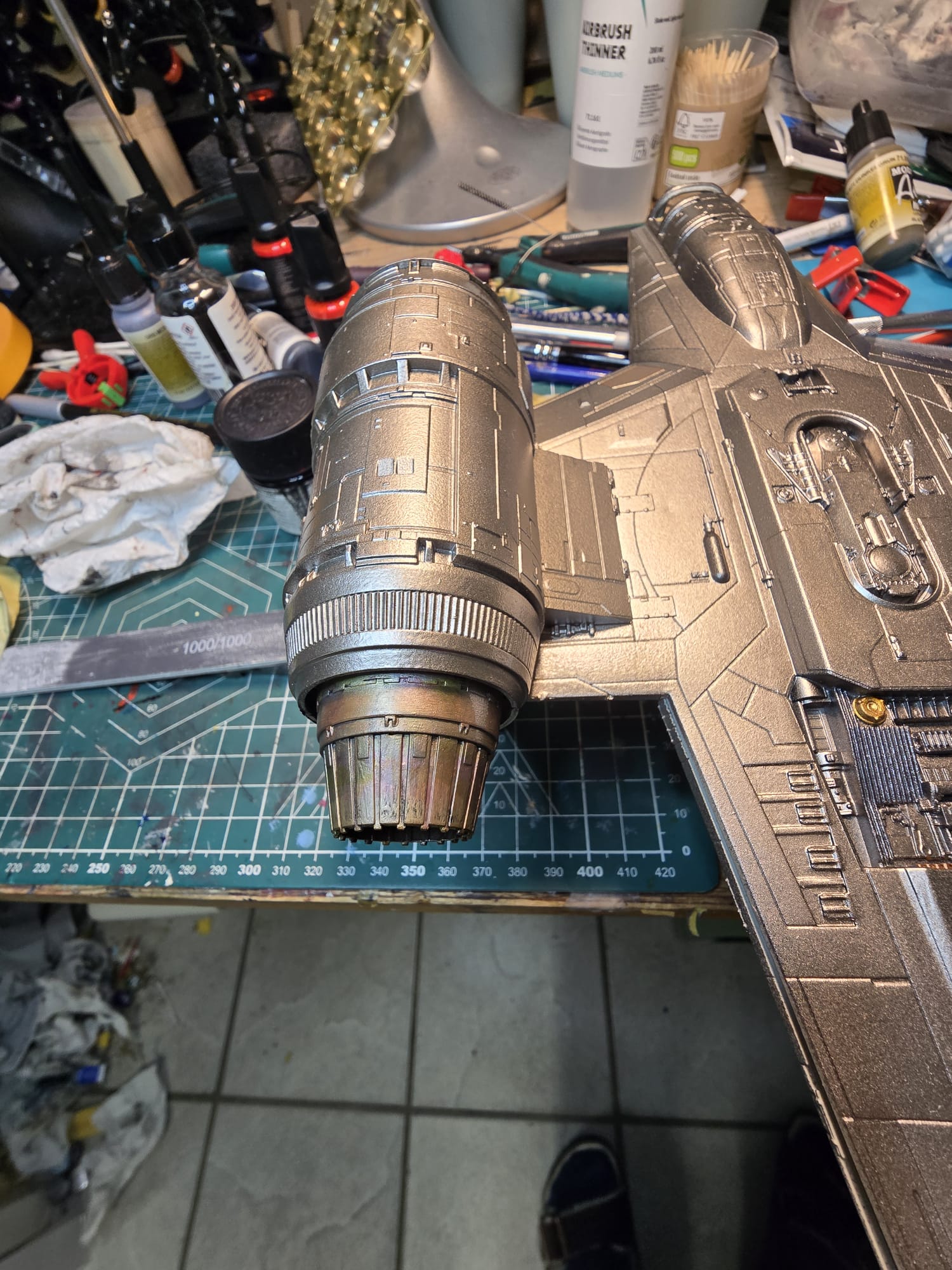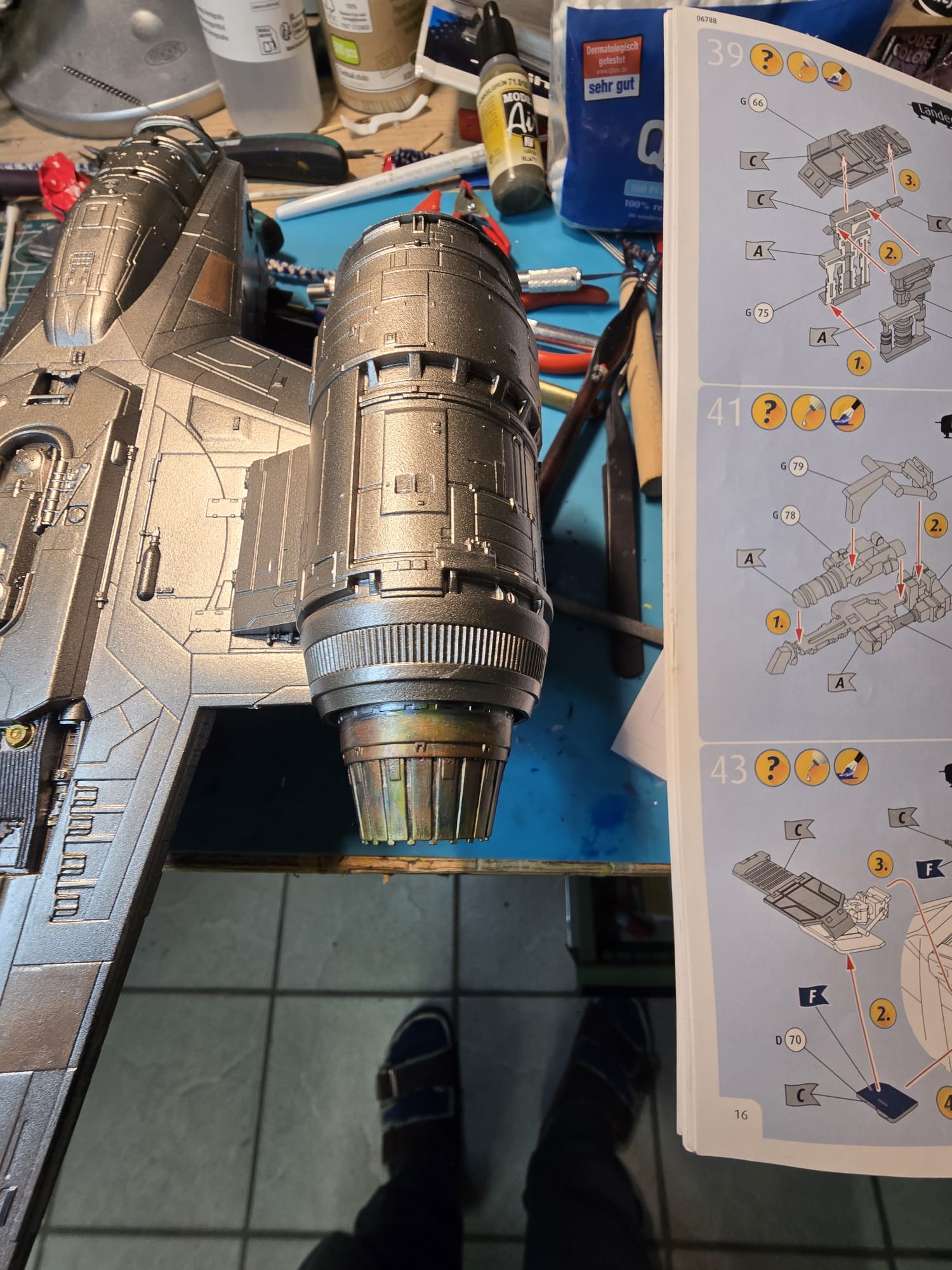 Servus..... ich hänge natürlich immer noch an den zig winzigen PE Teilen und brauchte mal ne Pause davon. Dafür habe ich das Oberteil mit den Triebwerkgondeln gebaut und lackiert. Alles schwarz grundiert, dann mit Vallejo Steel und dann noch eine hauchdünne Schicht Kaleido Titanium Alloy drüber. Das gibt dem ganzen eine leicht bräunlichen Teint 😜