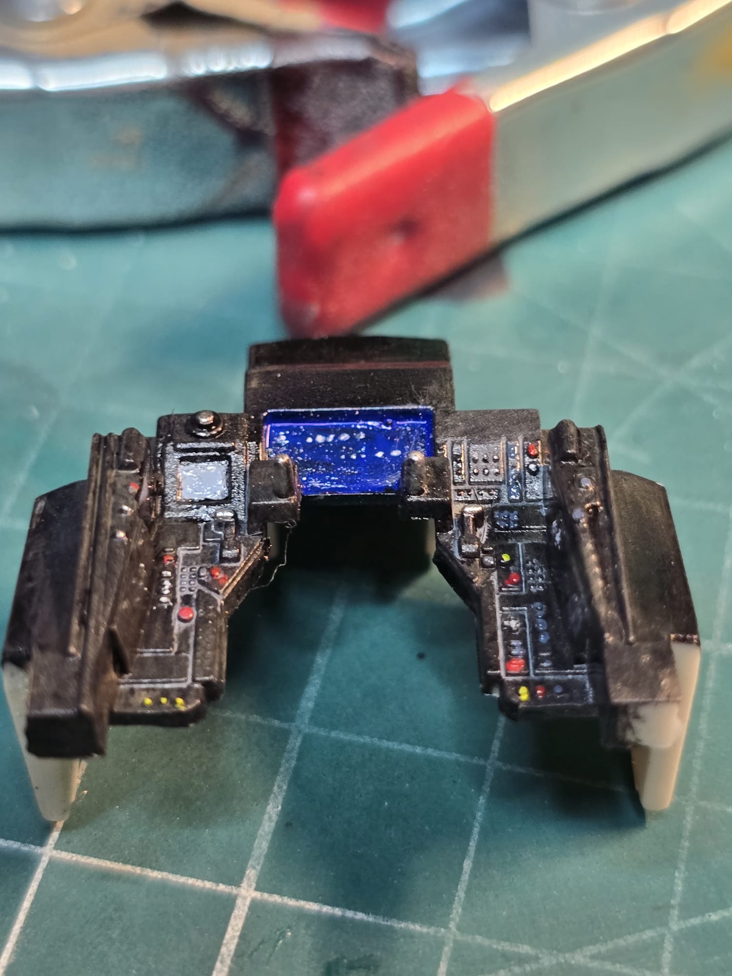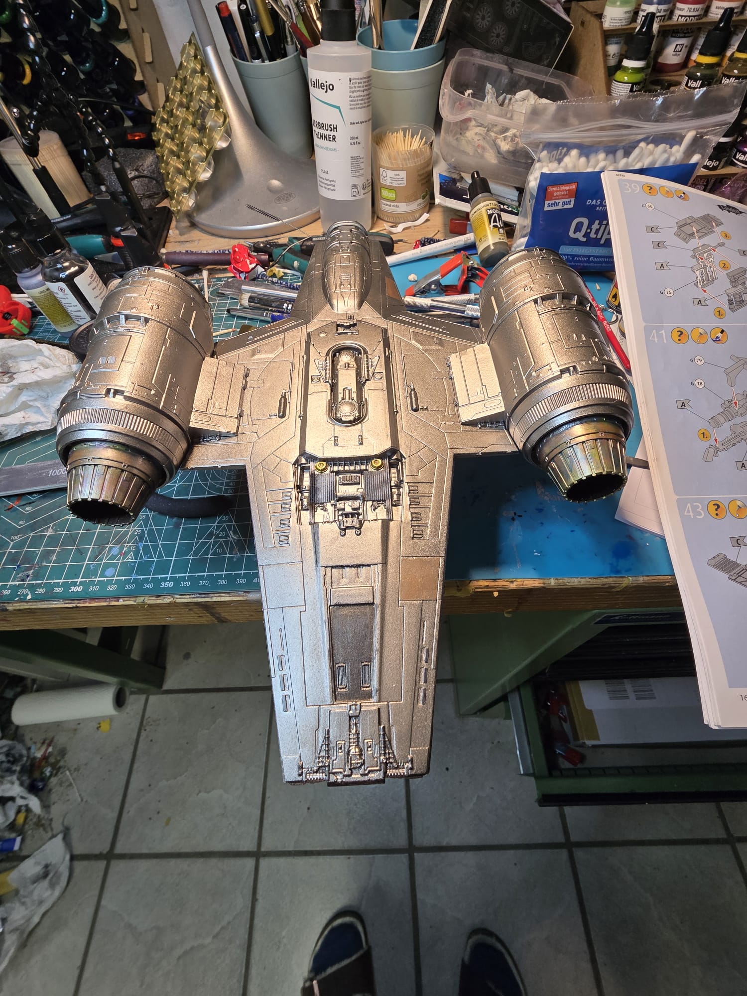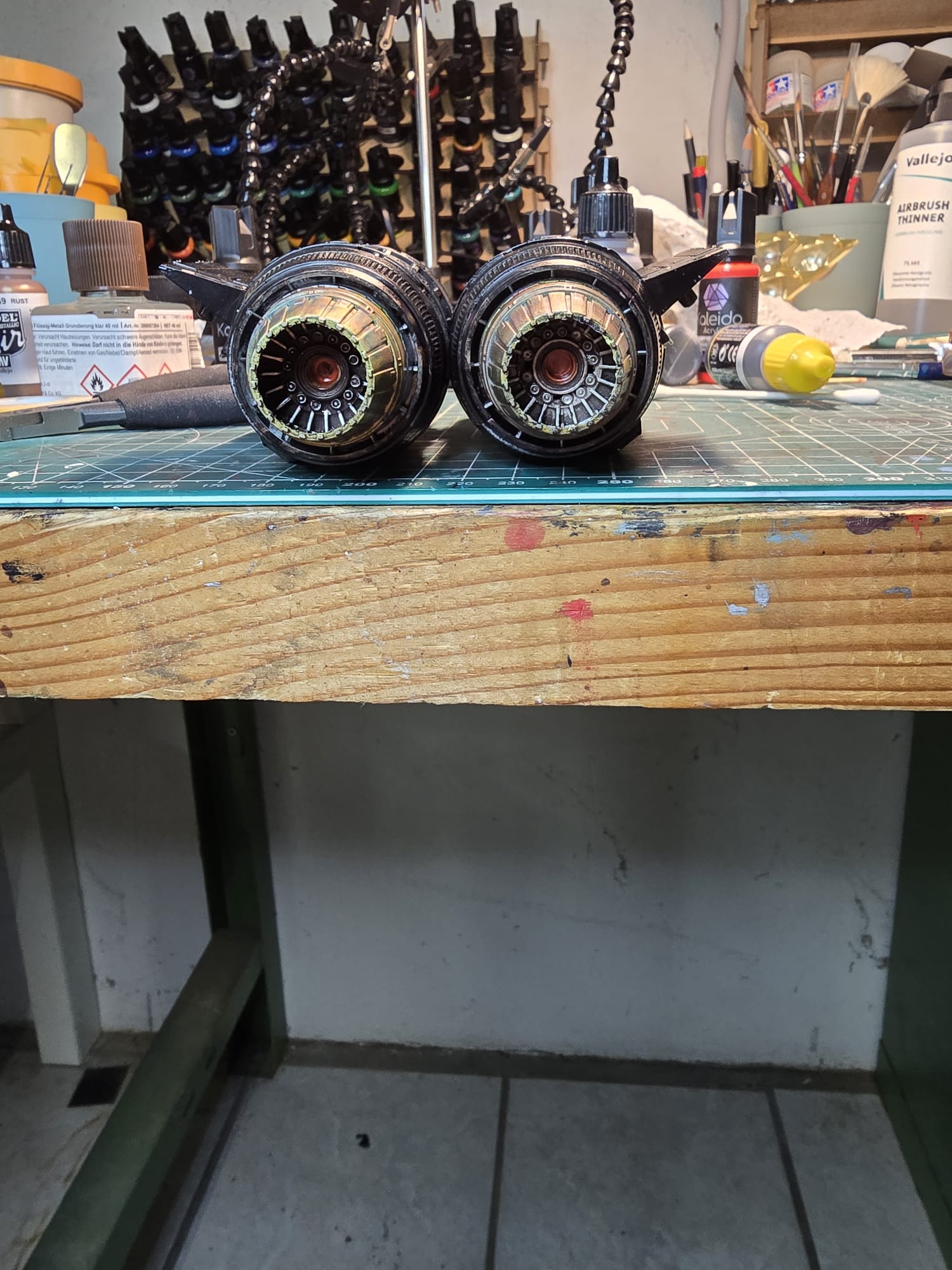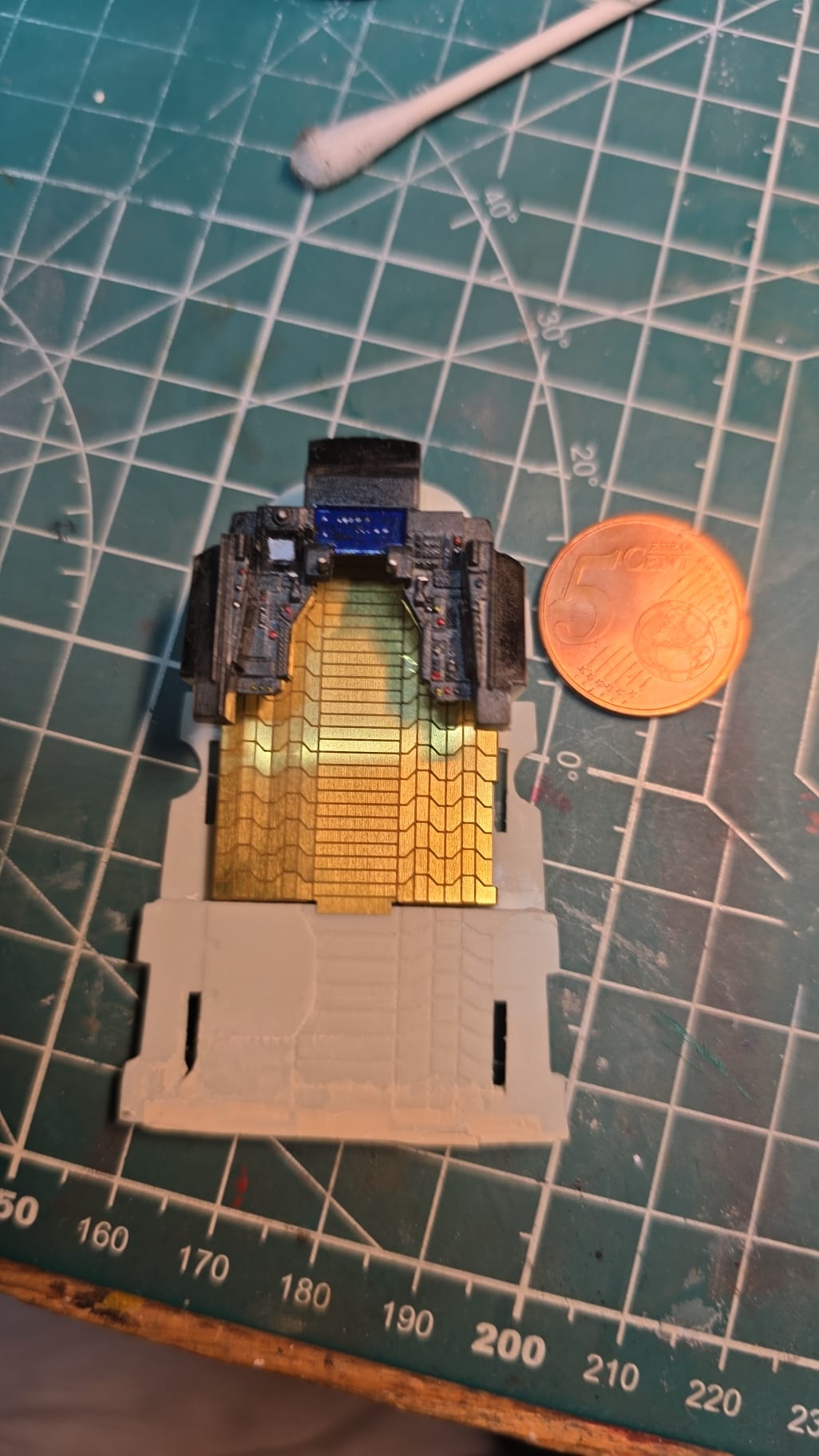 Servus..... ich hänge natürlich immer noch an den zig winzigen PE Teilen und brauchte mal ne Pause davon. Dafür habe ich das Oberteil mit den Triebwerkgondeln gebaut und lackiert. Alles schwarz grundiert, dann mit Vallejo Steel und dann noch eine hauchdünne Schicht Kaleido Titanium Alloy drüber. Das gibt dem ganzen eine leicht bräunlichen Teint 😜