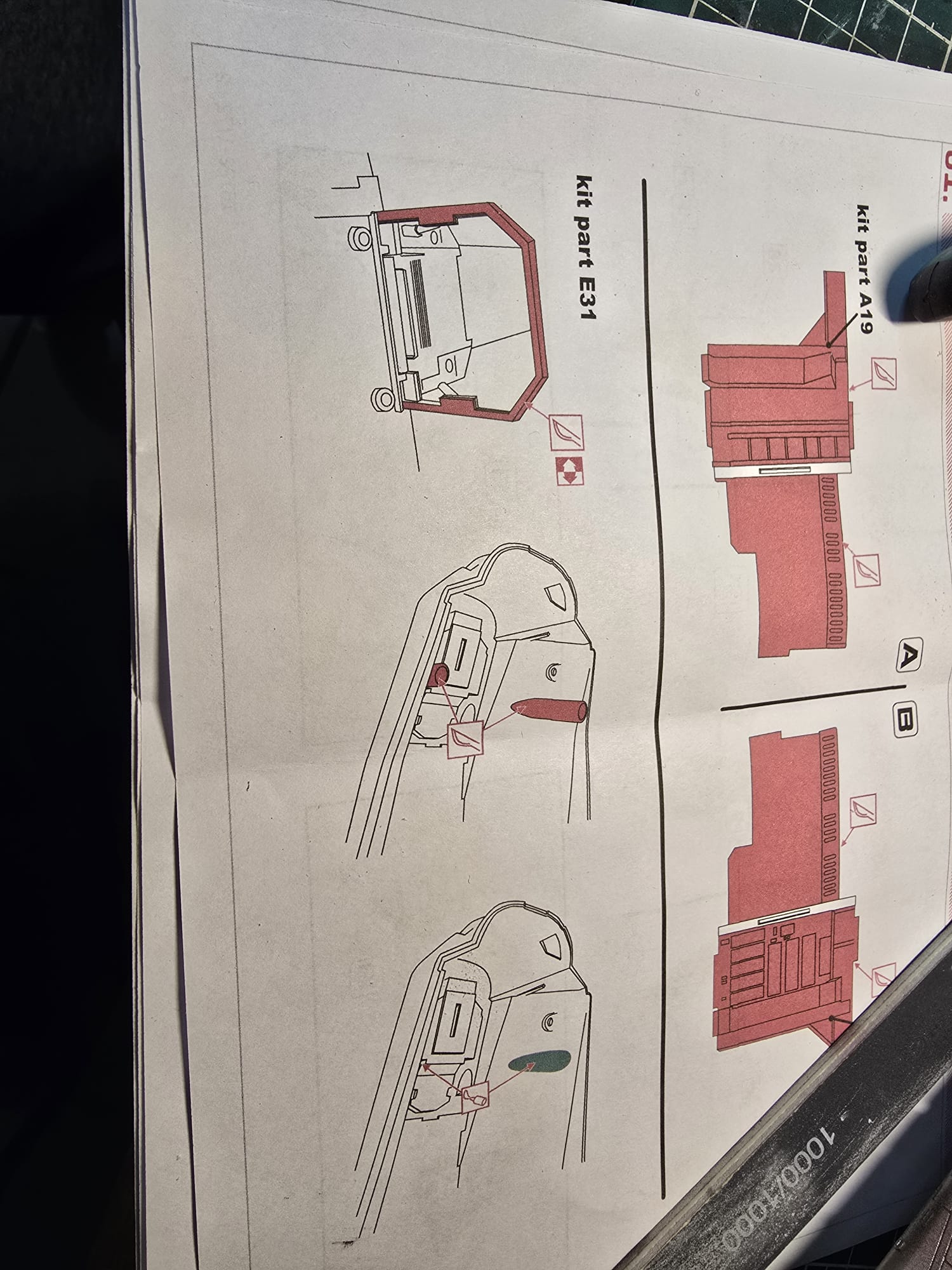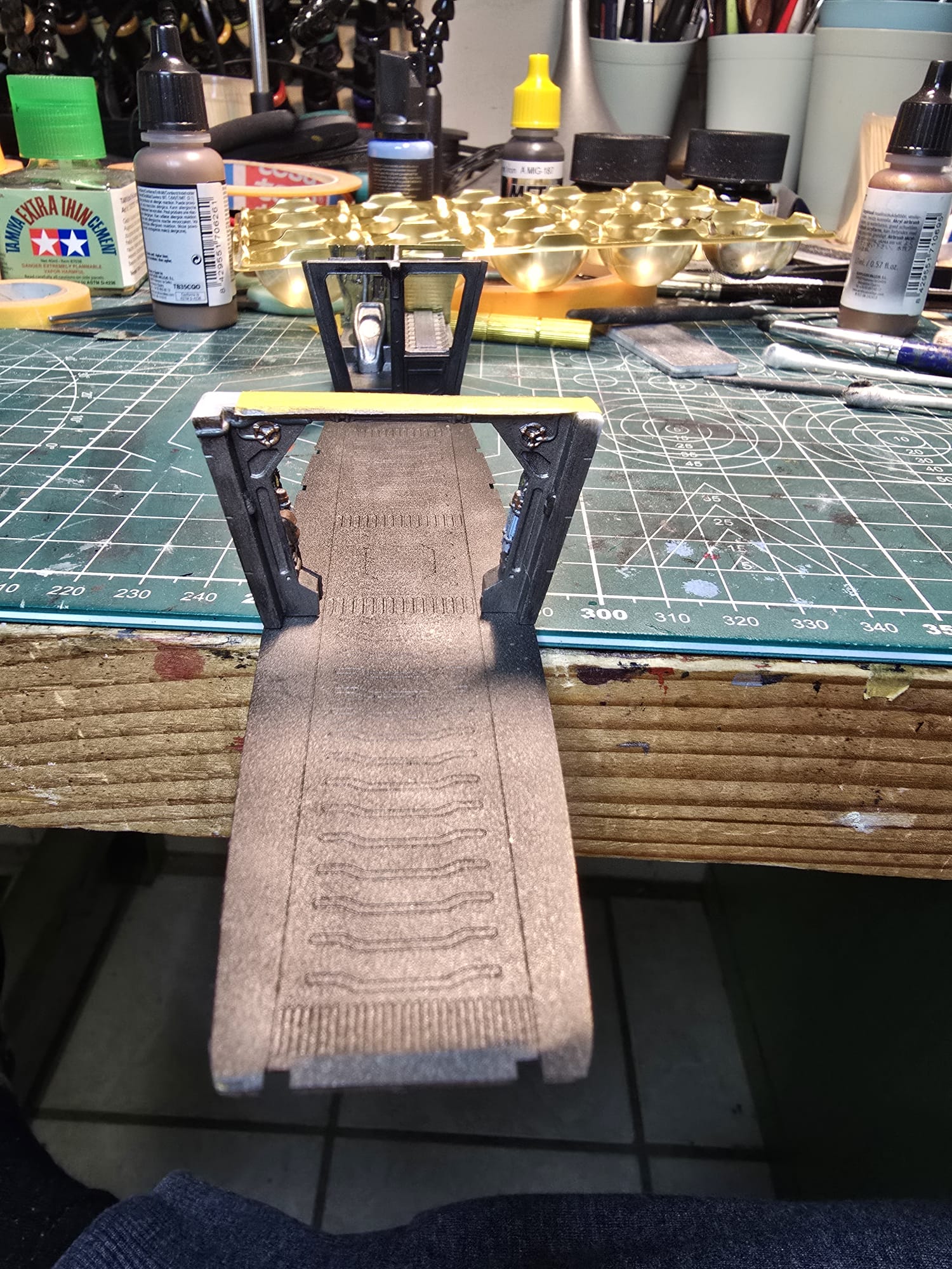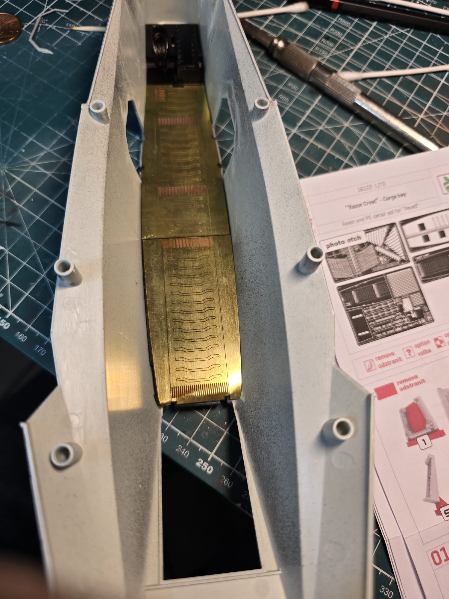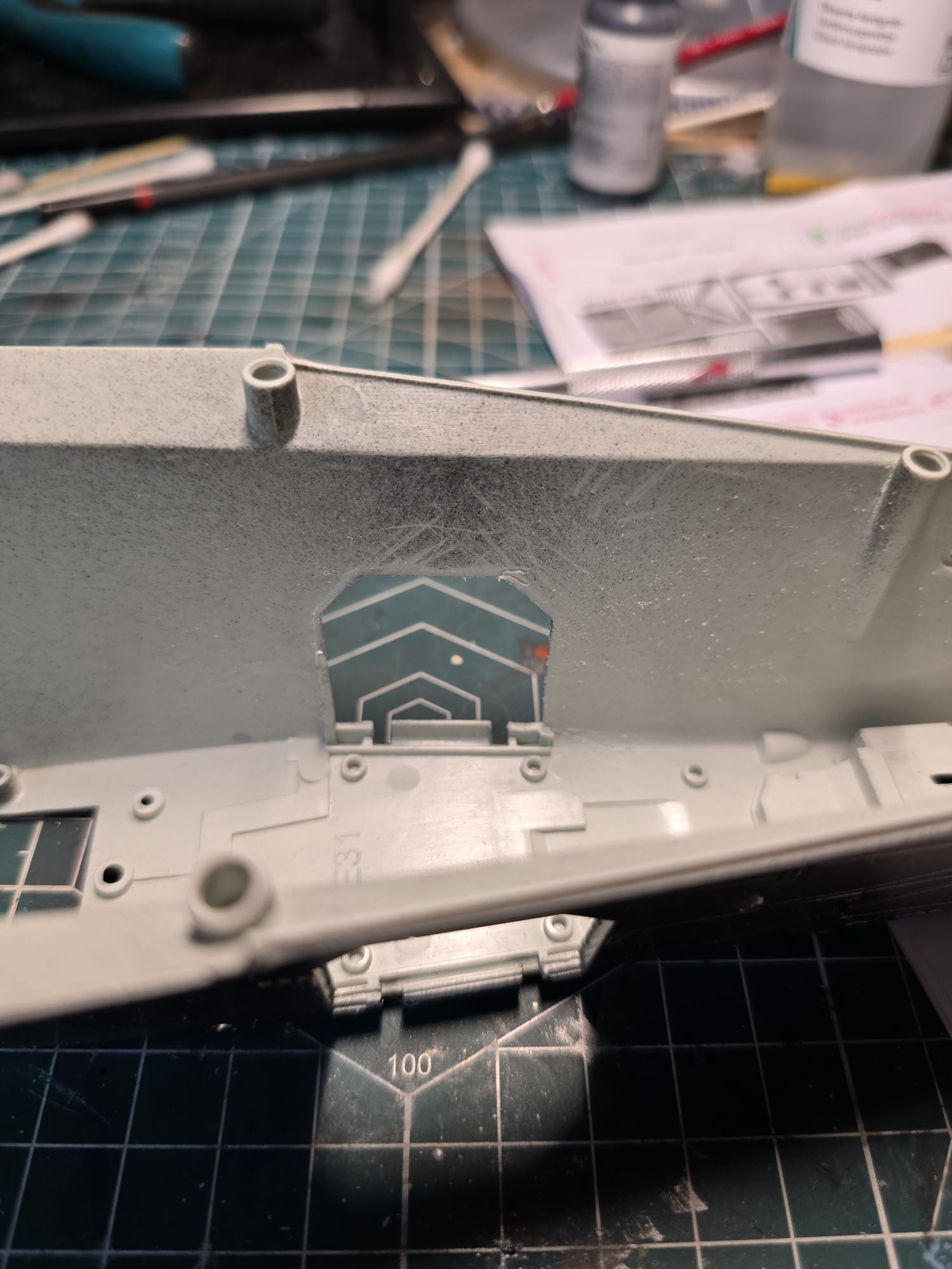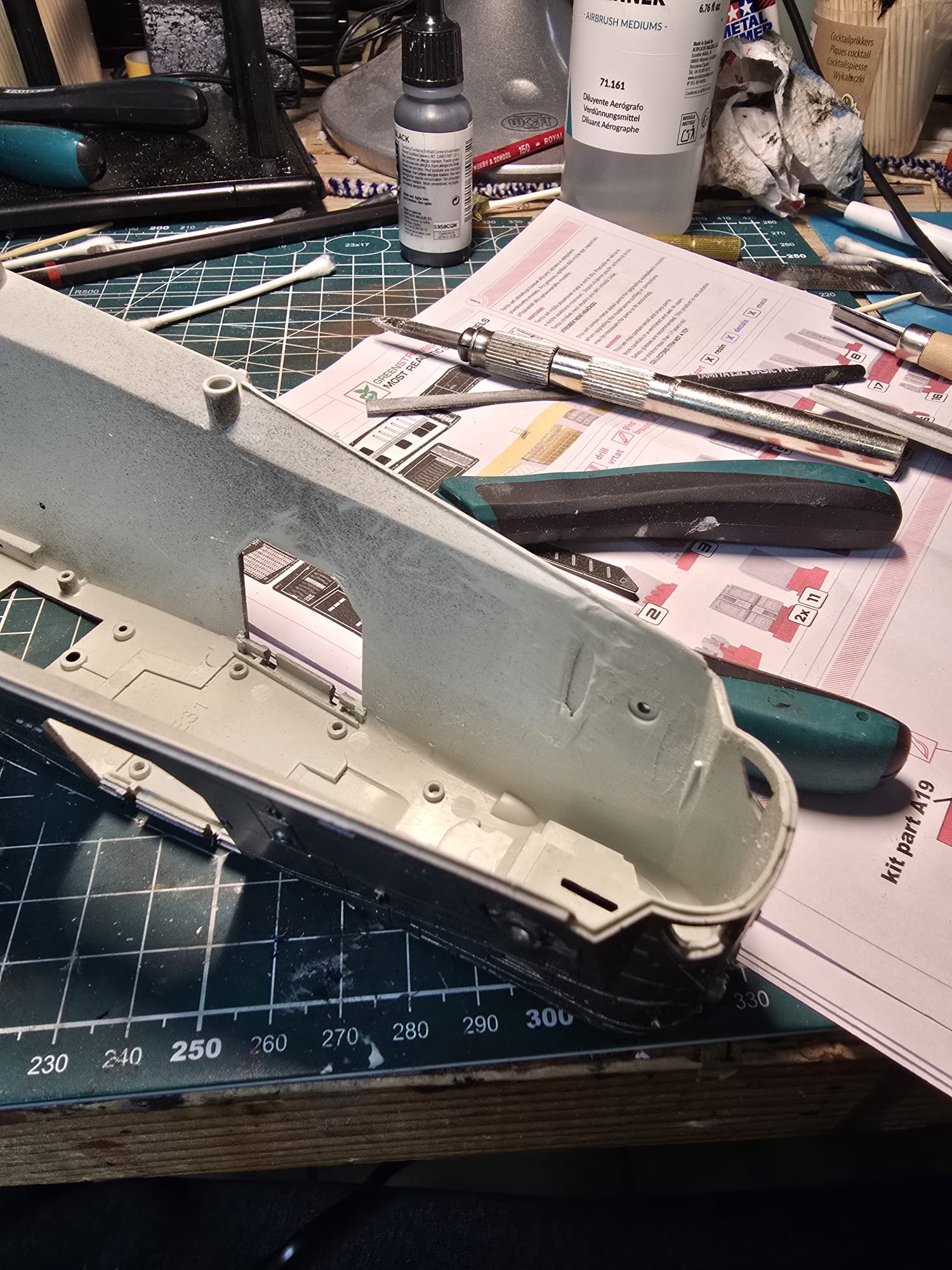 Was habe ich mir da nur angetan..... mit den fieseligen PE Teilen ist es ja nicht getan..... ich muss aus dem Modell auch koch Teile wegschneiden.... mal sehen, ob ich es gut hinkriege.... ehrlich, da geht mir die Muffe. Die ersten Teile sind weg und zwar die Ladeluken und die Steckverbinder der Wanne zum Oberteil. Dank der Tamya Sägeblätter ging das sogar erstaunlich gut. Nur halten die dann nicht lange und verbiegen sich.