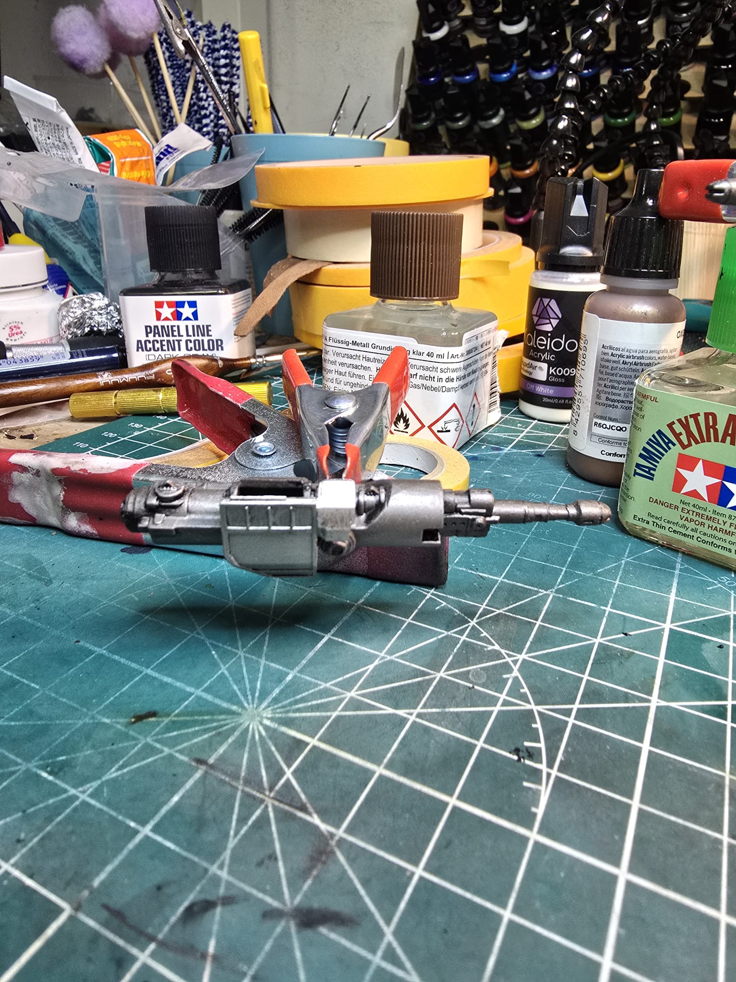Natürlich mit der Airbrush ! Griff in dunklem Holz und der Rest in GunMetal. Dann die Kannten noch etwas mit Silber trockenmalen . :D