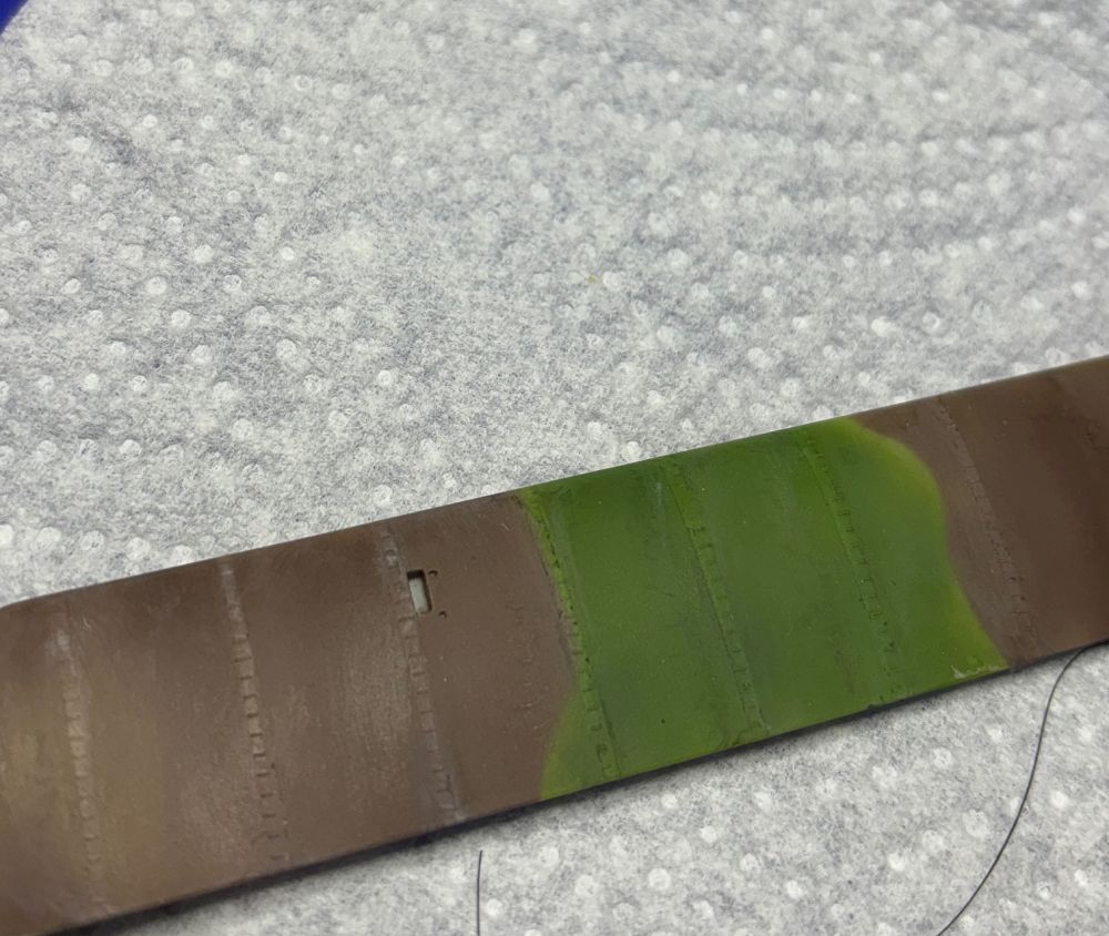 Um später die Stützen gut verkleben zu können, habe ich vorsichtig etwas Farbentferner in die Löcher getupft und die Farbe entfernt.