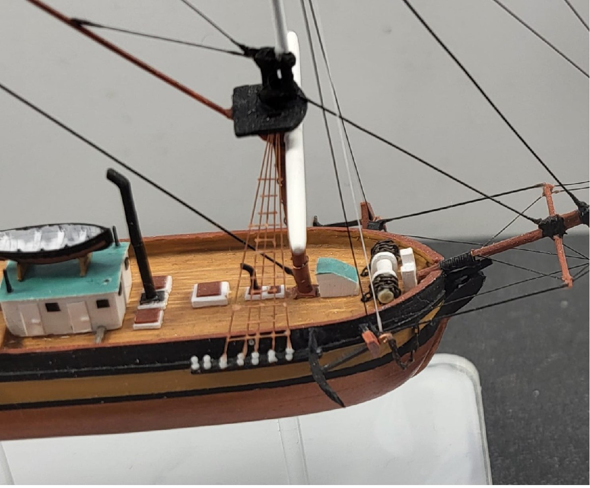 Die Segelstangen wirken so sofort eleganter und filigraner und zur Dimension des Bugspriets passend.