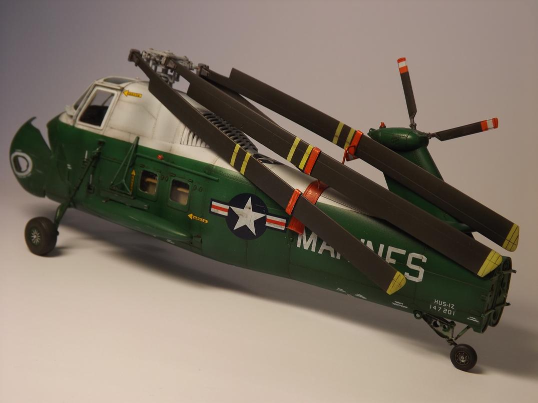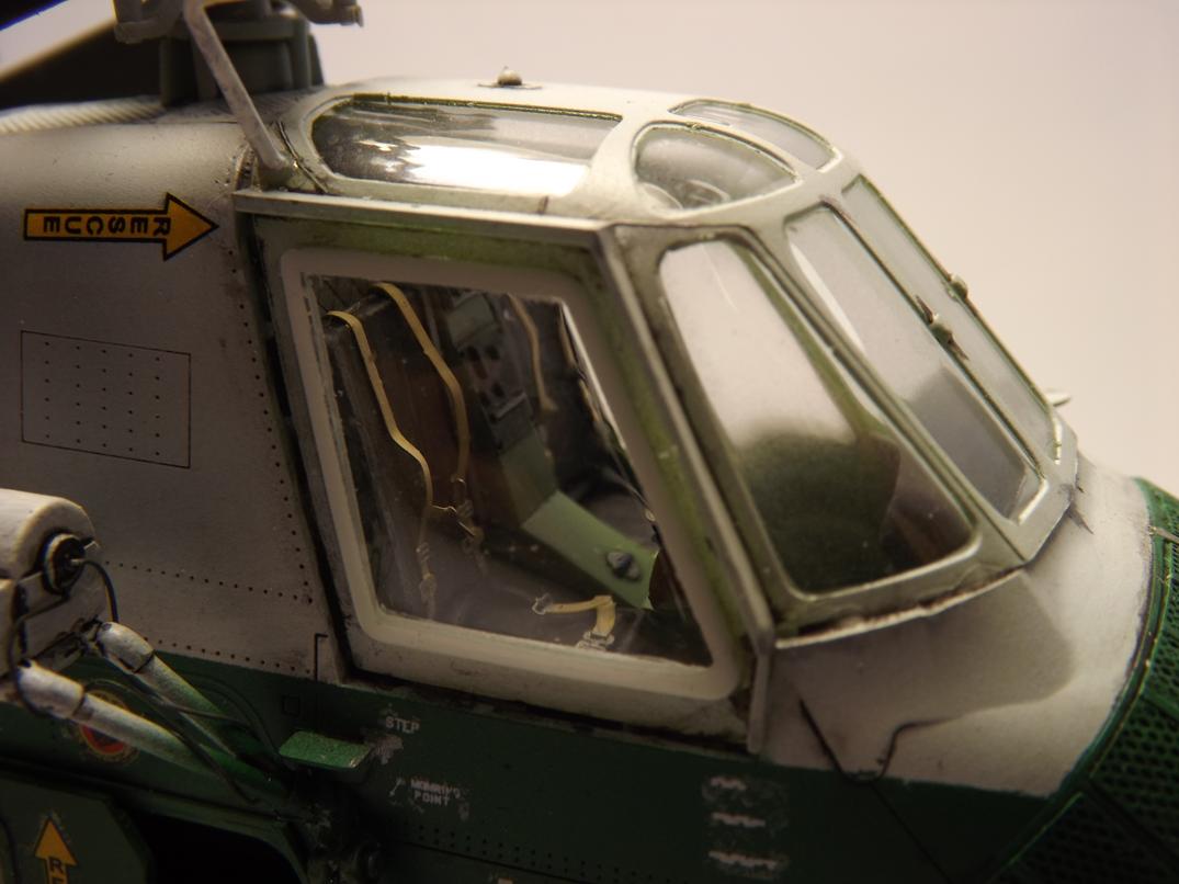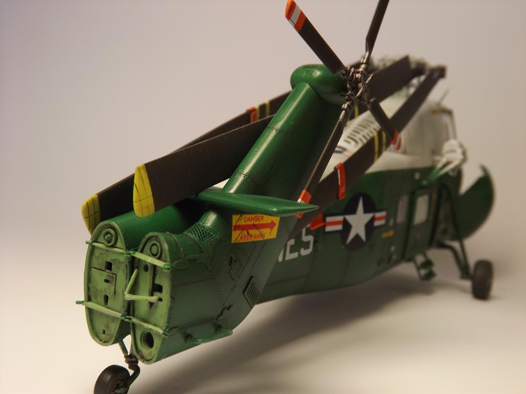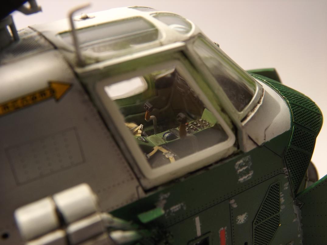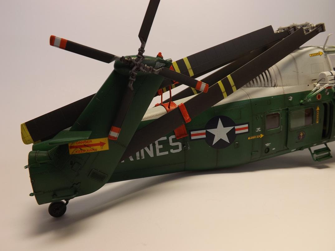 Was mich anfangs etwas ratlos machte, war der Platzbedarf wegen des Rotors, was meine Hoffnung auf weniger Platz in der Vitrine fest beseitigte. Doch beim Stöbern im www fand ich Bilder mit eingeklappten Rotorblättern und angelegtem Heckteil. Die Halterungen versuchte ich mit dicker Alufolie und Draht scratch nachzubilden. Ich finde, das klappte so lala, ist aber für künftige Projekte noch ausbaufähig.