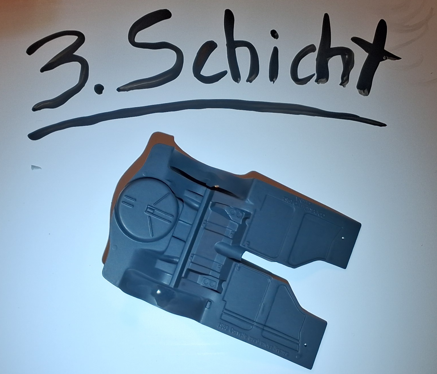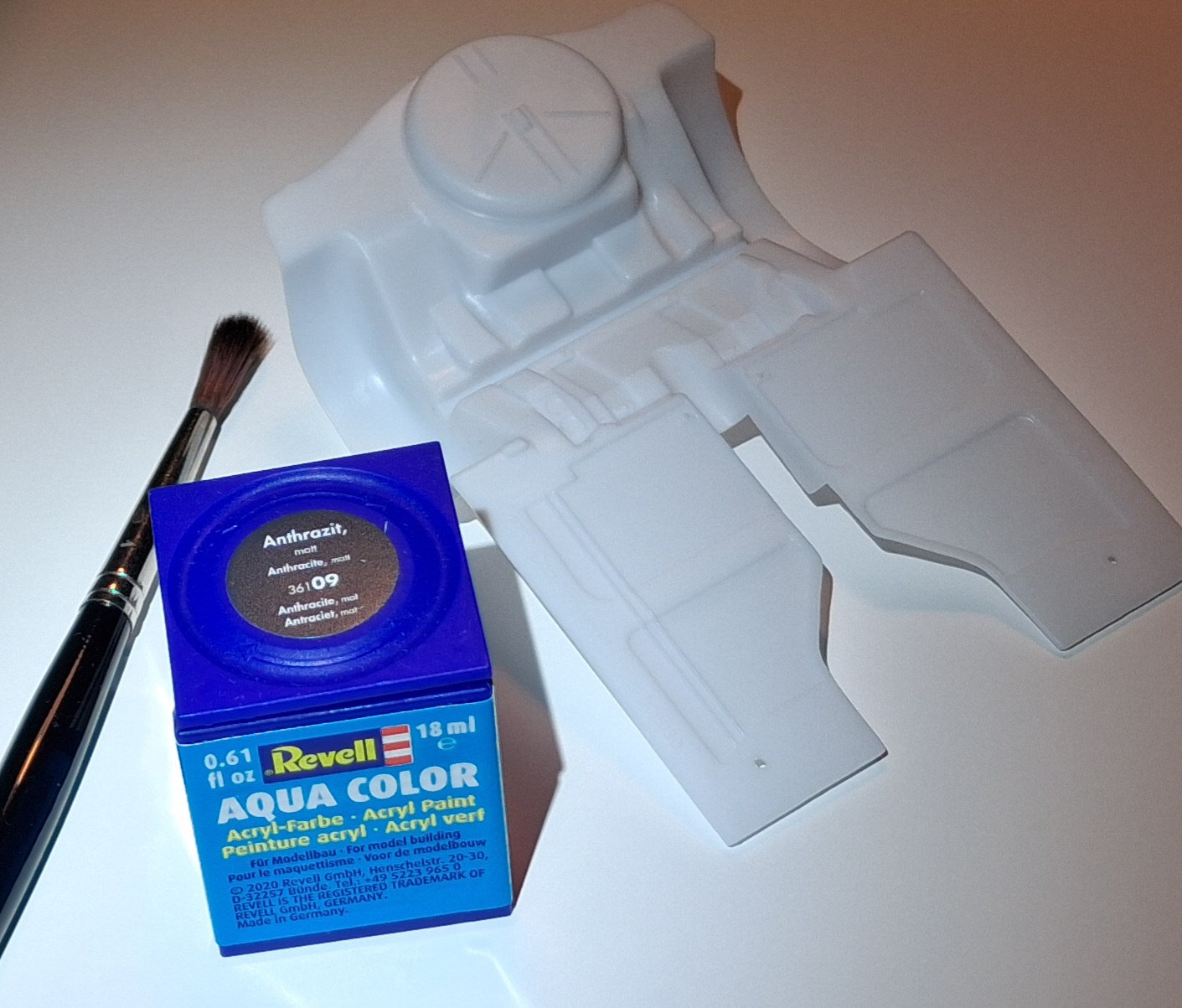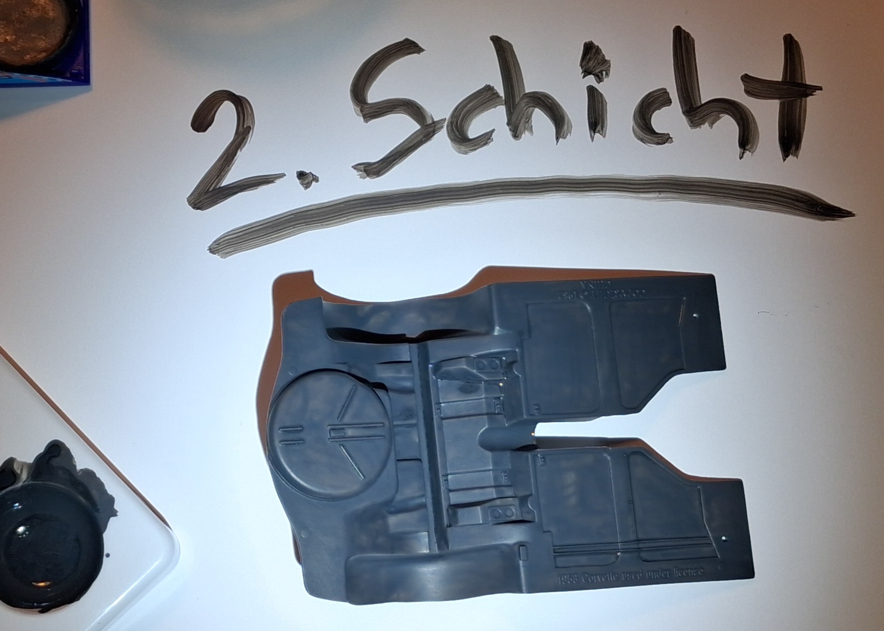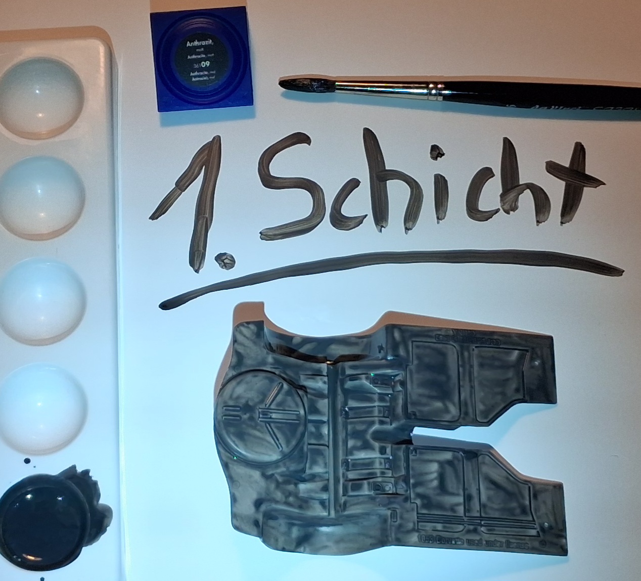 Es ging wieder einen kleinen Schritt weiter. Da ja der ein oder andere von euch genauere Bilder zum Thema Pinsel wollte, habe ich mir mal den Unterboden als erstes Beispiel ausgesucht. Gemalt wurde mit Aquas von Revell, Anthrazit in bisher drei Schichten. Die Dritte ist noch etwas frisch wie man vielleicht erkennen kann aber durchaus vorzeigbar.