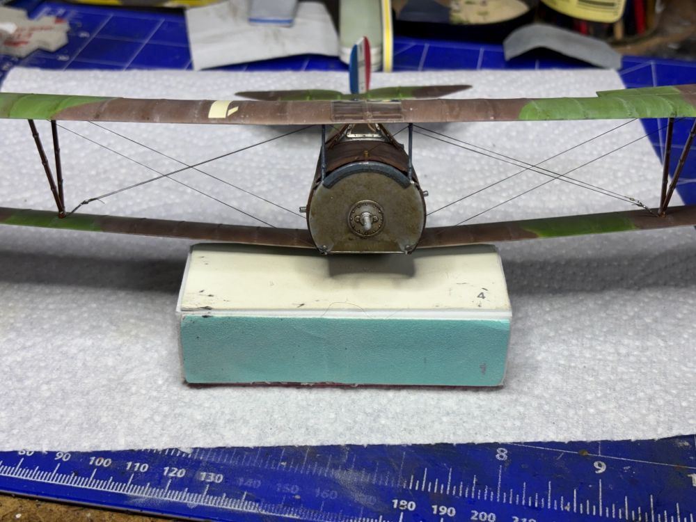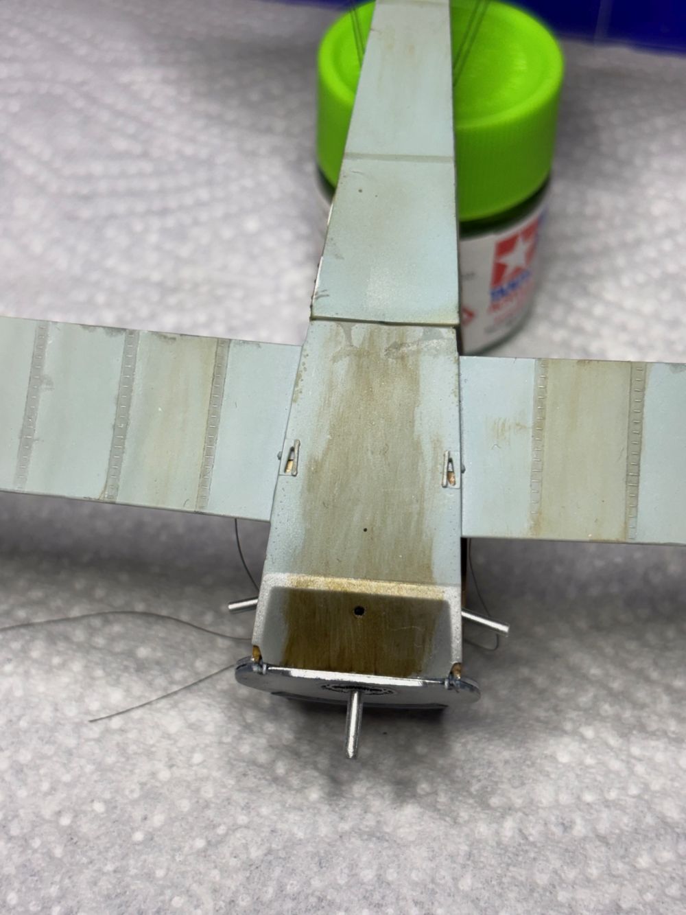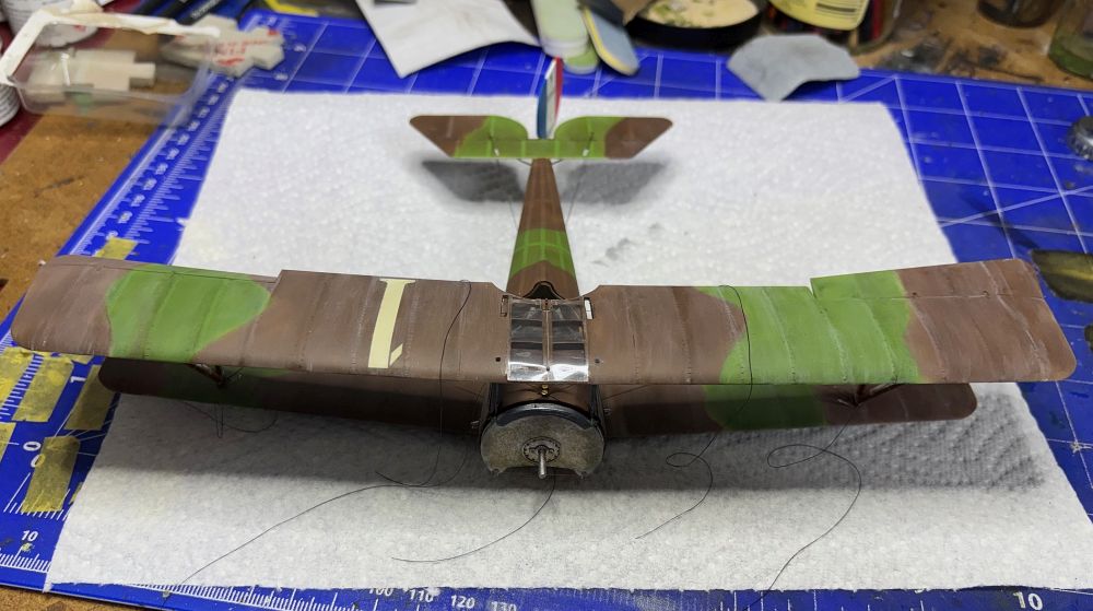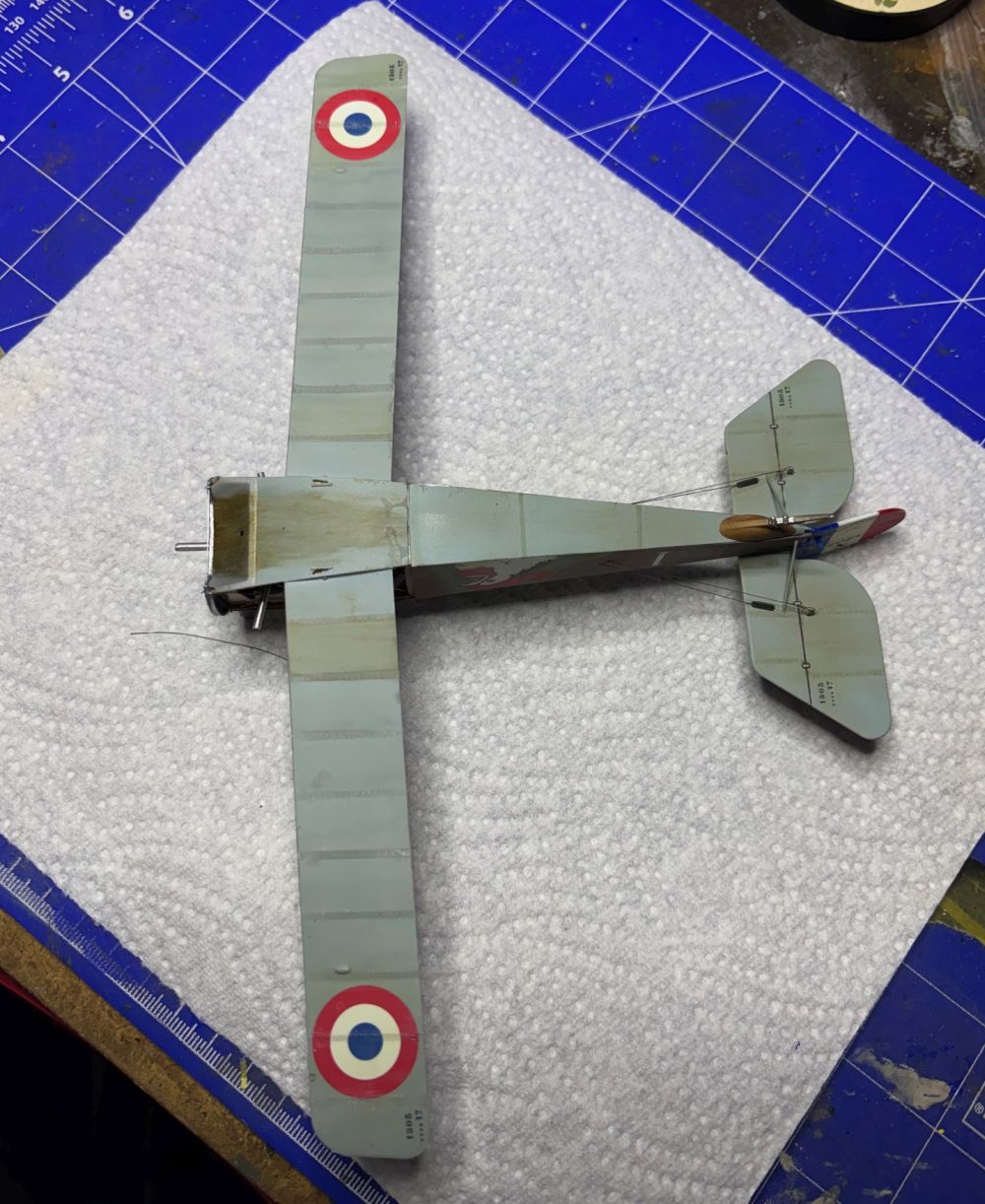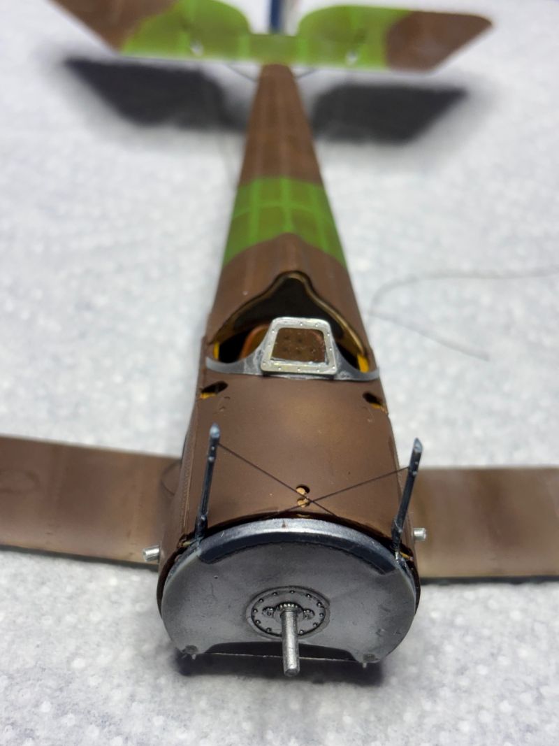 Nach der Trocknung habe ich die Unterseite direkt mit Öl verdreckt. Schließlich haben die Rhone Umlaufmotoren ordentlich rumgesaut.