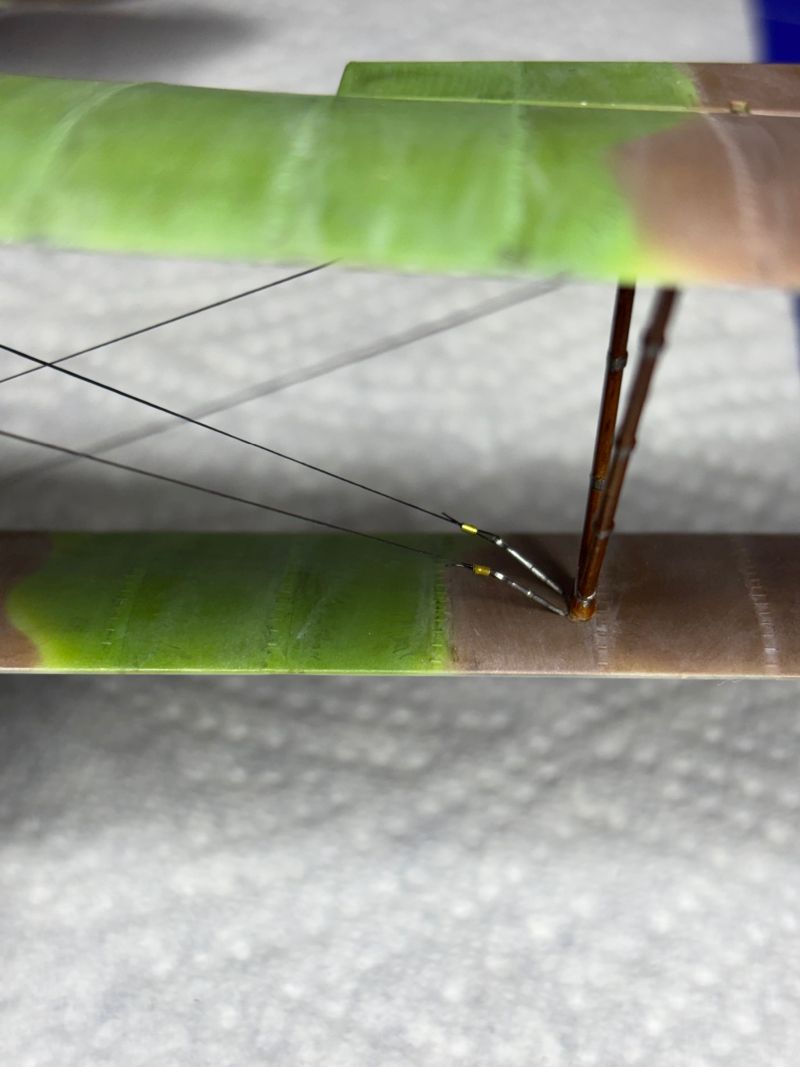 Die Montage des Oberflügels verlangte einiges an Ausrichtung und Geduld. Letztendlich verklebte ich erst die äußeren Streben und justierte dann die Mittleren. Zum Schluß saß alles perfekt und durfte aushärten.