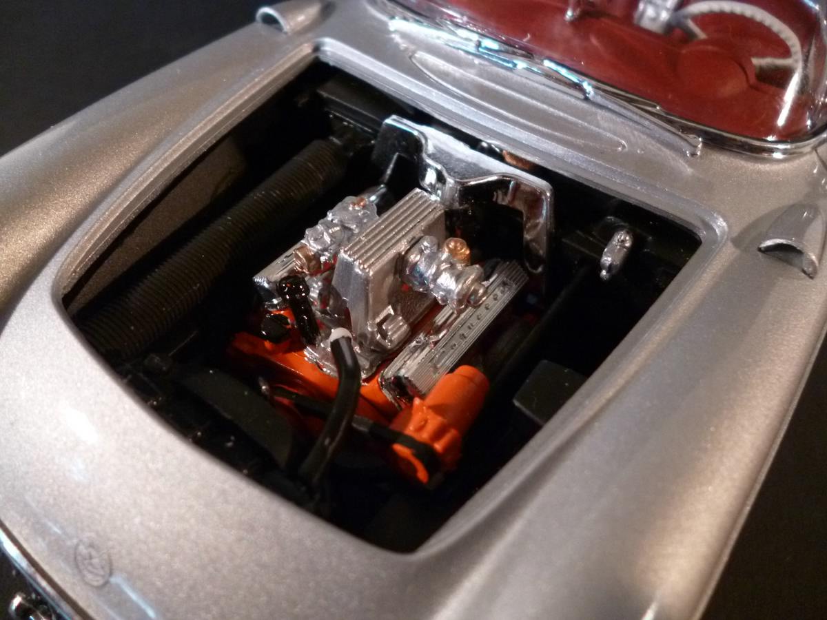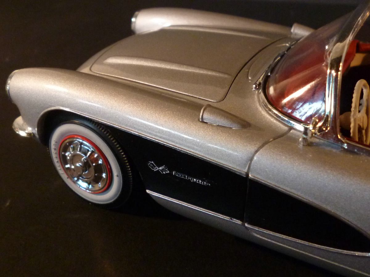 Die 1957er Corvette kam mit ersten großen Veränderungen daher. Die Größte seinerzeit war wohl: ab sofort ist der V8 erhältlich, was der Corvette einen ordentlichen Vortrieb bescherte. Für meine Collection noch ein weiterer Vorteil: sie war ab sofort silber erhältlich. Jedoch nicht die schwarzen Flanken: diese waren in graumetallic erhältlich. Nicht in schwarz. Also habe ich hier die Innenausstattung auch wieder rot gemacht.