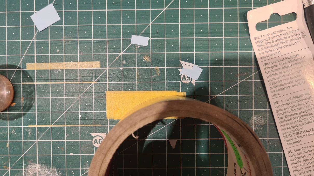 Noch einmal mit schwarz drüber, damit keine Deckfarbe unter das Tape läuft. Danach mit Alclad II Messing drüber: