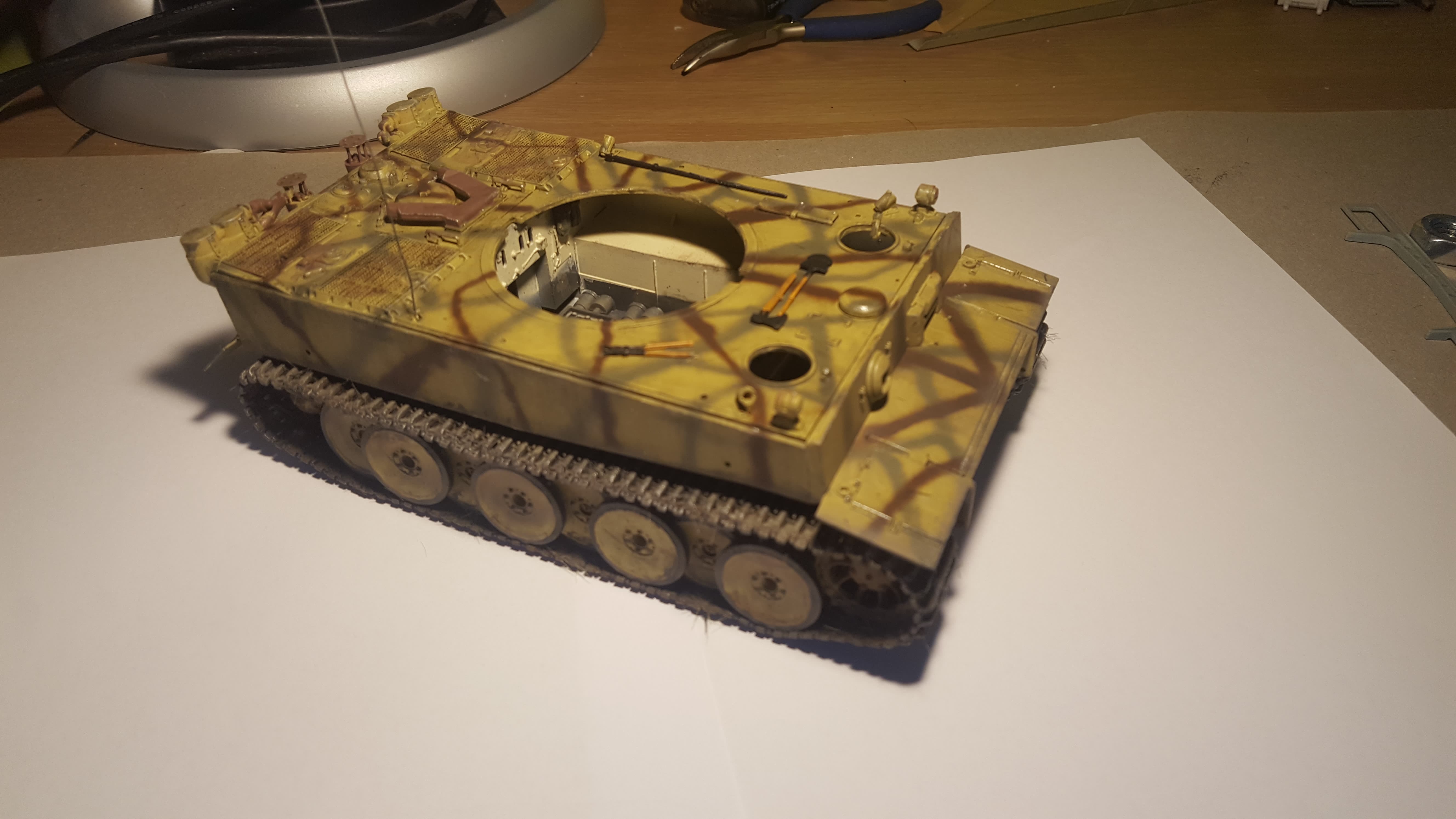 Ich wollte auch nochmal zeigen woran ich aktuell arbeite. Der jagdpahnter wird auch bald fertig habe jetzt eine kette. Gerade habe ich auf dem Kasten Tisch den Tiger 1 Early von airfix mit Innenraum.
