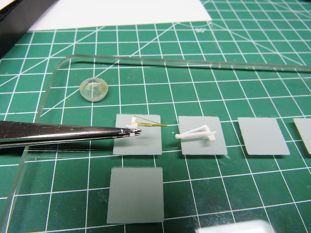 Ich benutze hierzu den superelastischen Faden von Uschi van der Rosten ; den kann man sehr schön straff spannnen, ohne das ein großartiger Zug auf die Bauteile ausgeübt wird. Den benutze ich für alle Takelarbeiten im 700er Maßstab.