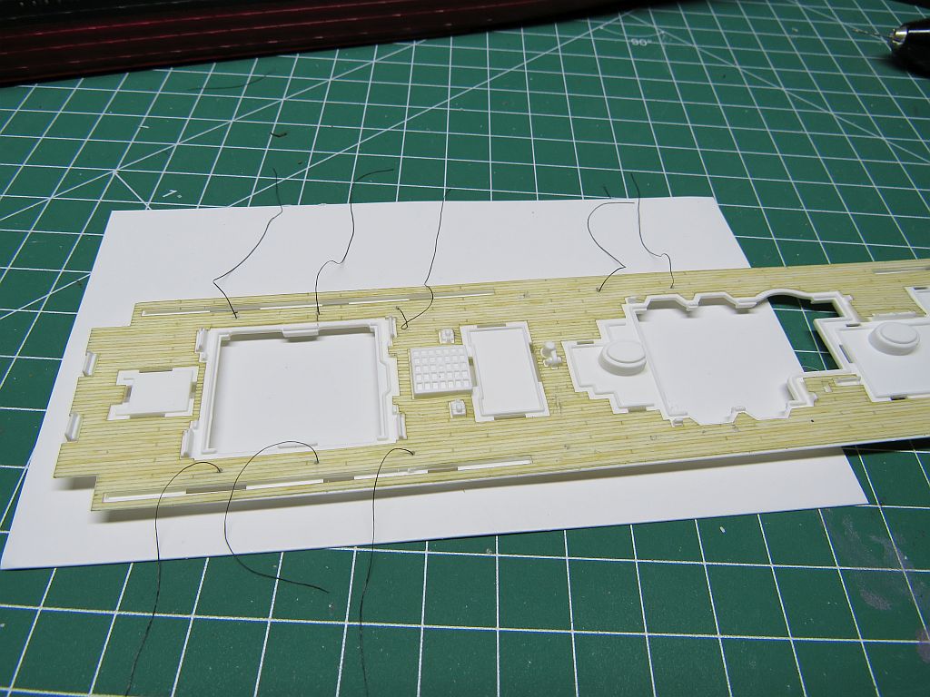 Bevor das obere Deck eingebaut werden kann, muss ich noch die Abspannleinen für die Schornsteine anbringen. Hierzu müssen Löcher gebohrt und Fäden durchgezogen werden, eine fürchterliche Fummelarbeit: