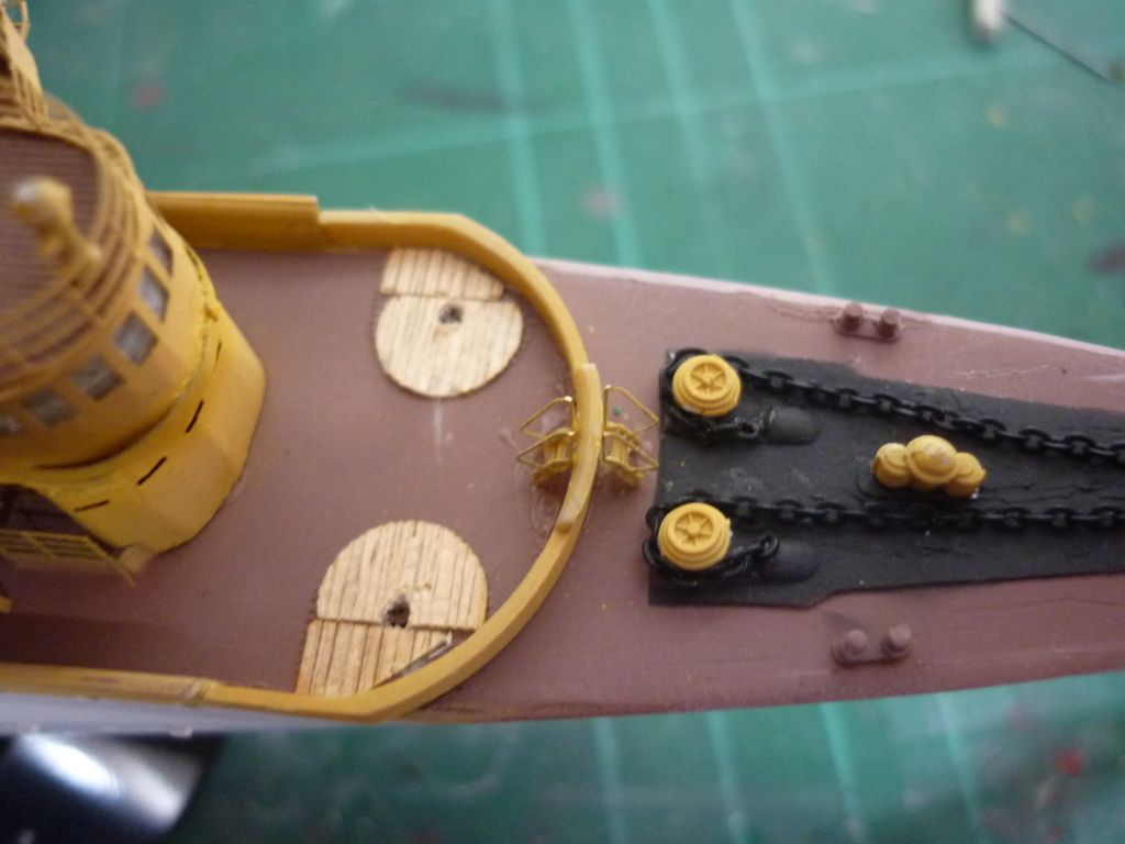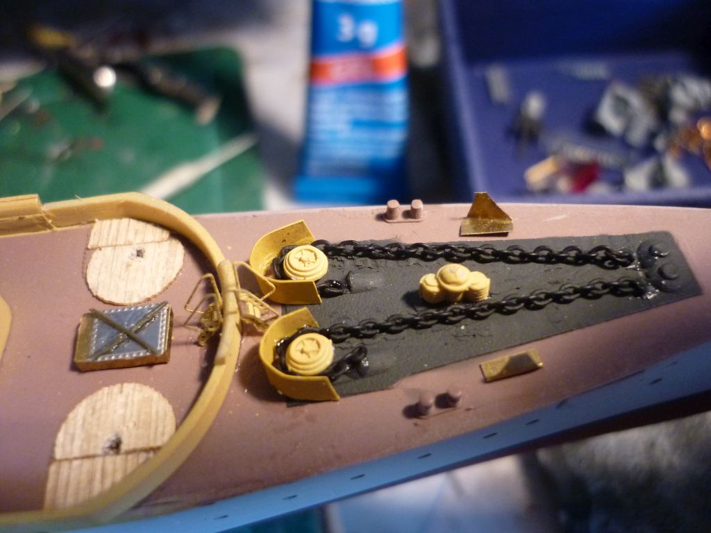 mit der Detailierung des Vorschiffes. Da ich nur den Eduard Teil 1 Photoätzteile erworben habe ,und ich auch gerne scratche habe ich mir in der Restekiste Metallteile zusammen gesucht um die Munitionskiste zwischen den vorderen Geschützen darzustellen. Weiterhin habe ich die Leit und Führungsbleche für die Ankerkette (gelb Lackiert) gebogen und einmal aufgestellt.
