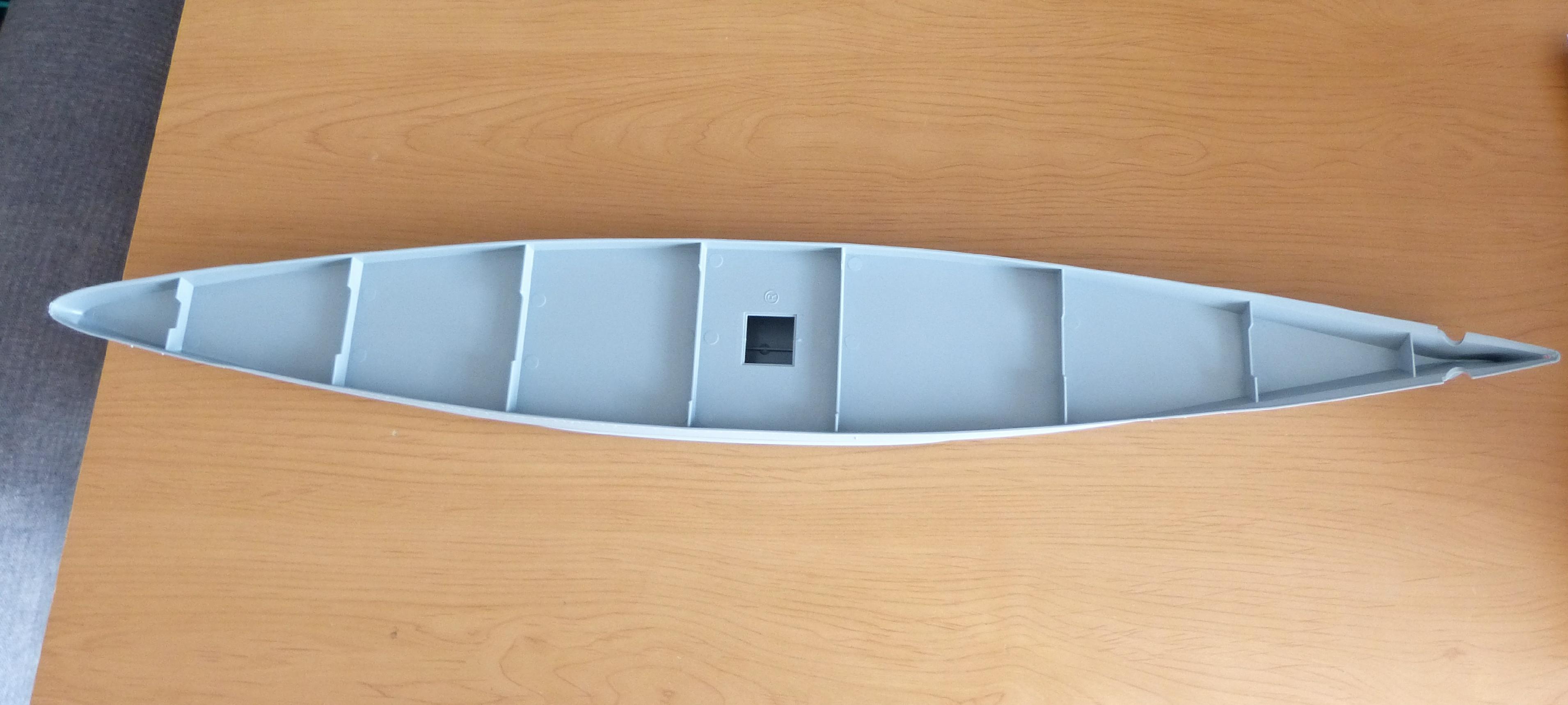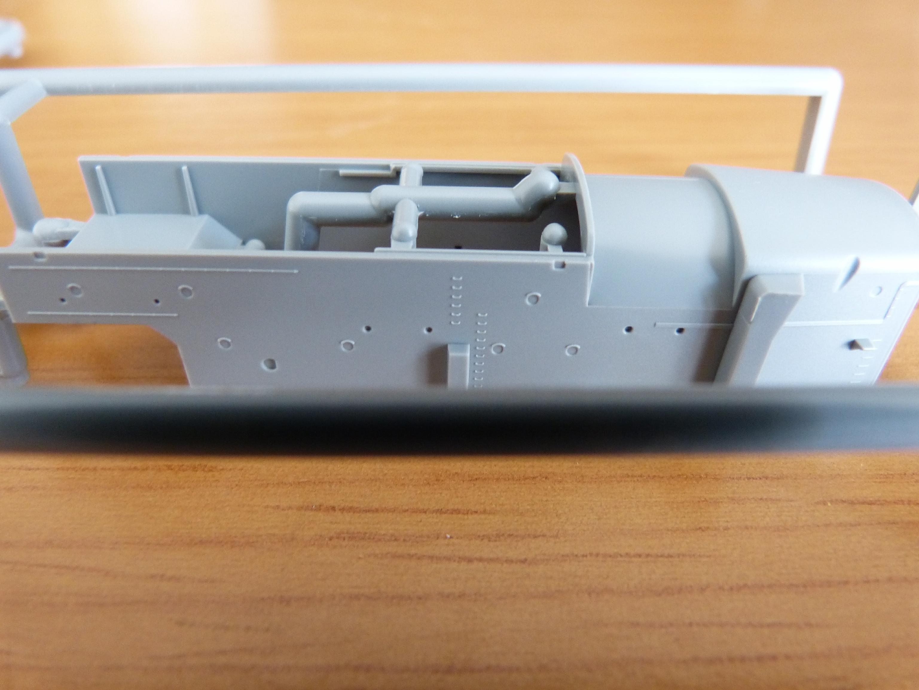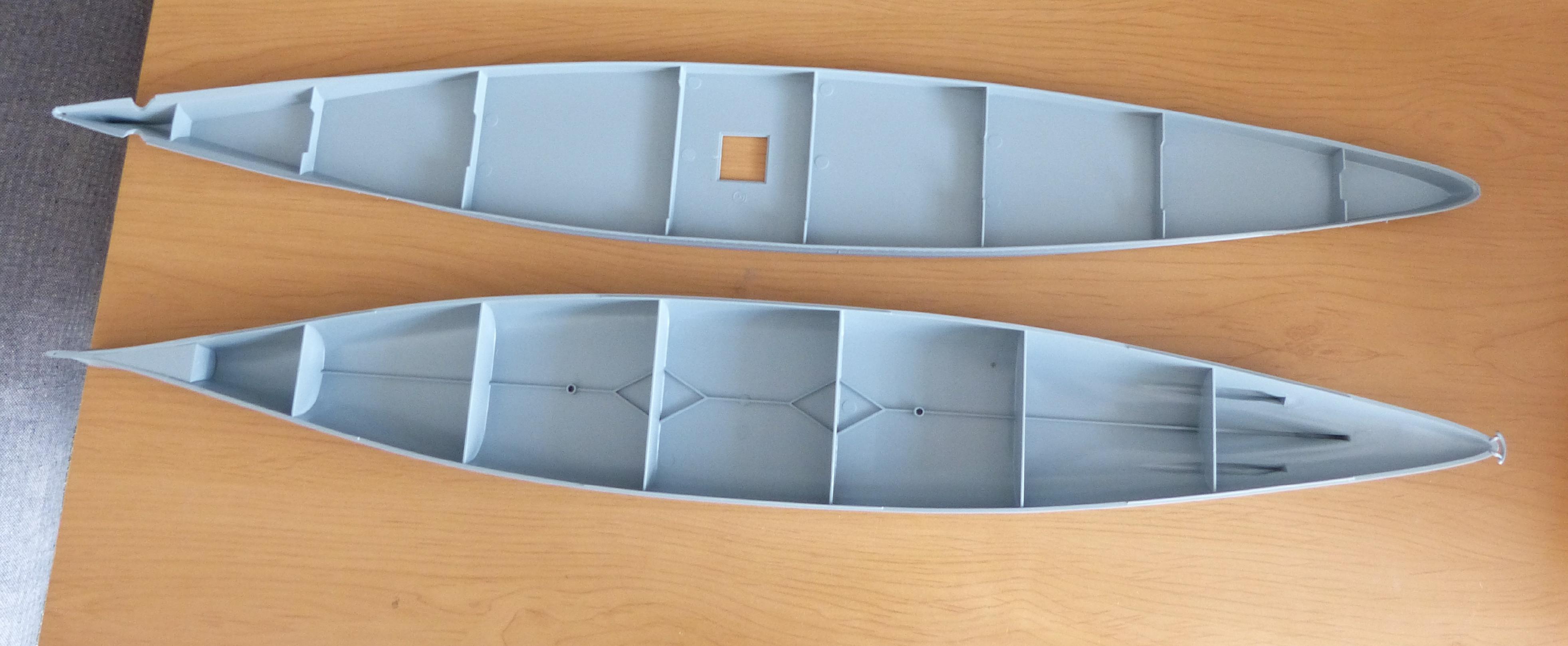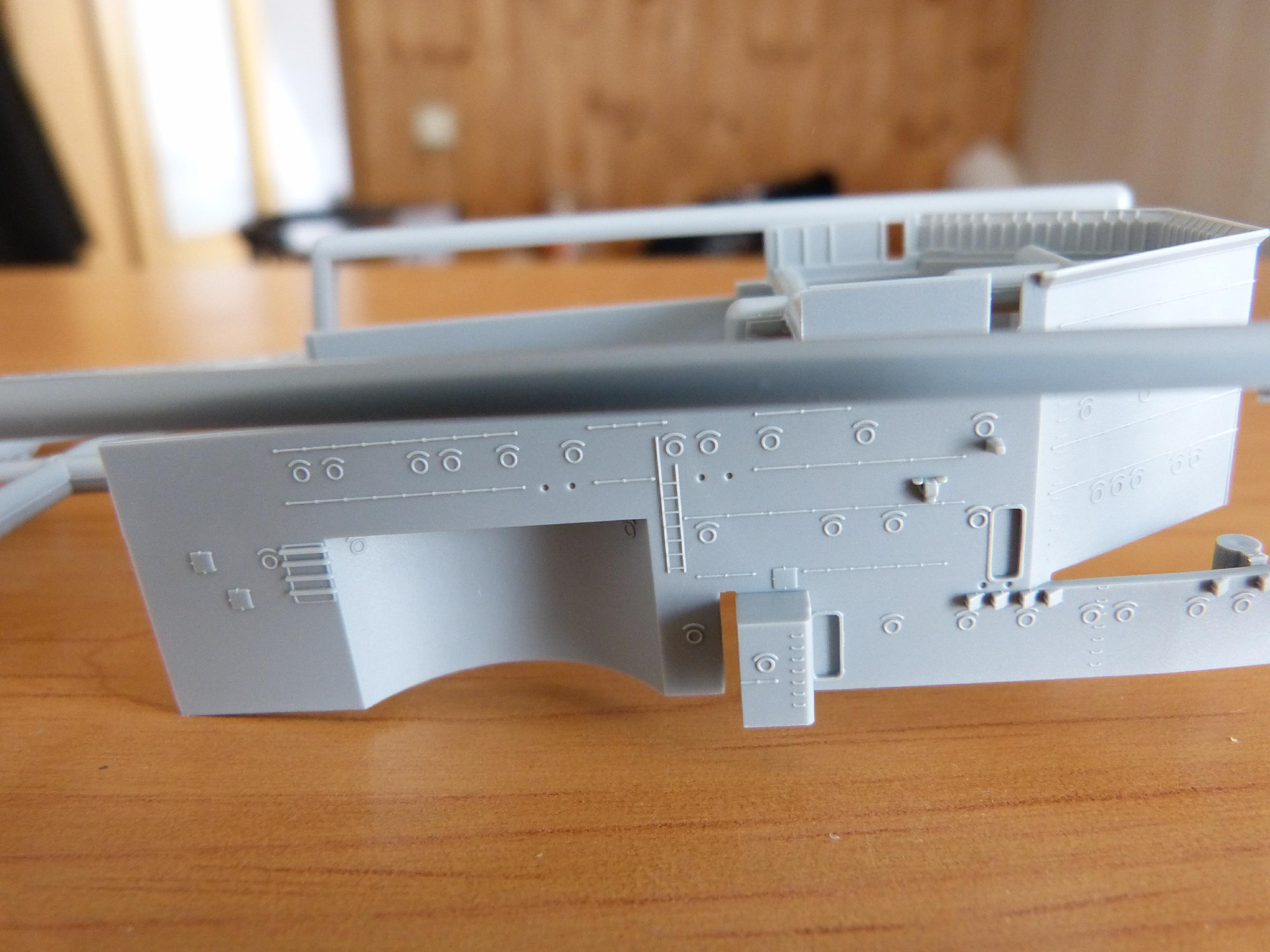 Der Rumpf erscheint sehr robust und besteht aus 2 Teilen, wobei der untere Teil in Sachen Details sehr stiefmütterlich behandelt wurde, er bietet keinerlei Strukturen. Es gibt keine Bugschallanlage (wie bei allen Bausatzherstellern) und kein Horchgerät (bei BS/TP-Revell wenigstens als gutgemeintes Decal). Kann man aber alles improvisieren. Schwieriger wird es mit den Auslässen für die Turbinen, die hat Dragon komplett ignoriert (3 Stück bei SH vorhanden) – bei Revell BS und TP vorbildlich dargestellt, sogar bei beiden Schiffen originalgetreu unterschiedlich. Was auch fehlt ist die MES-Kabel-Schleife am Rumpf (beispielsweise bei PG-Trumpeter mit dargestellt).