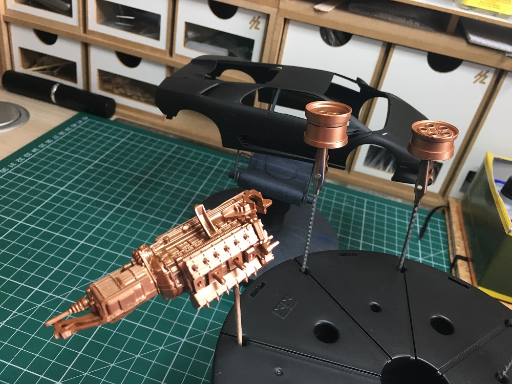 Die alten Chromteile habe ich in Messing-Metallic angefangen zu lackieren – und die Karosserie hat die erste Schicht schwarze Grundierung.