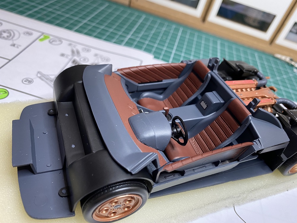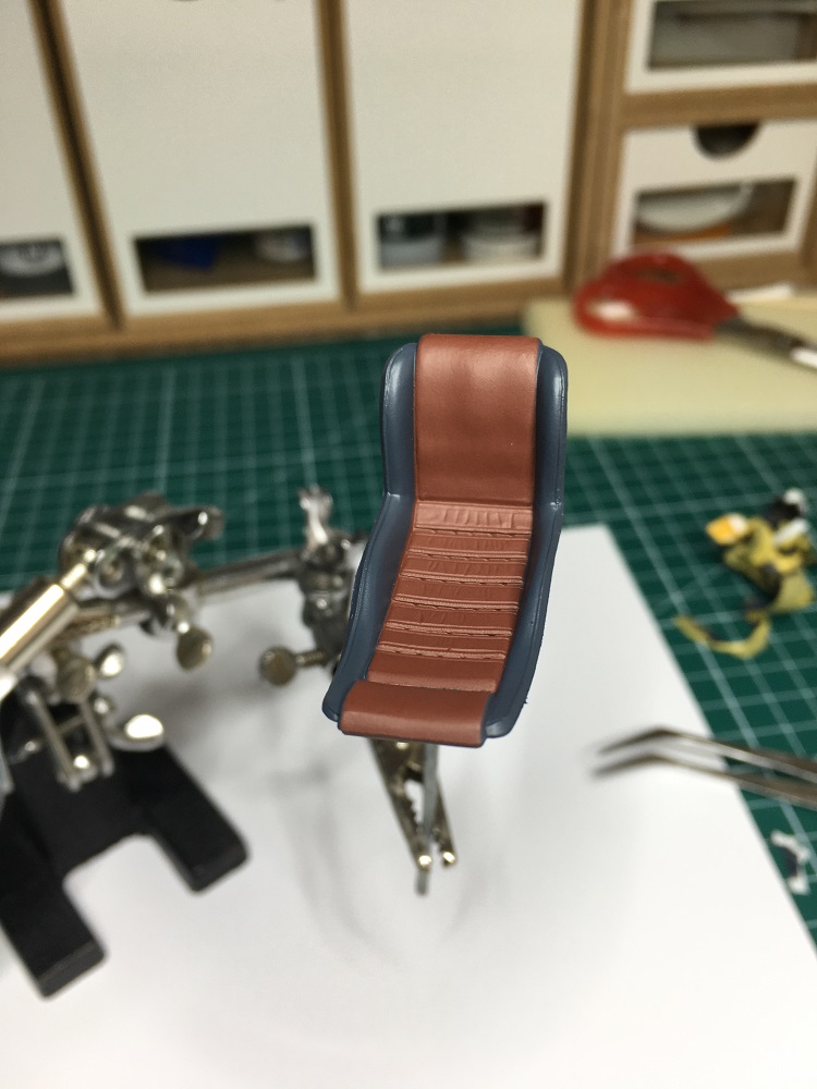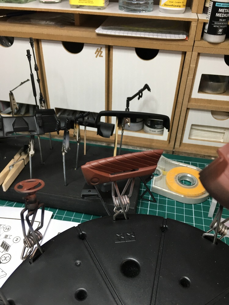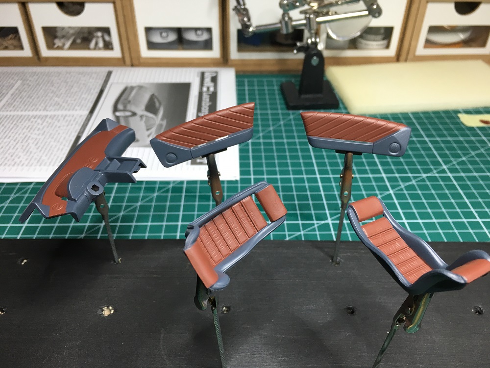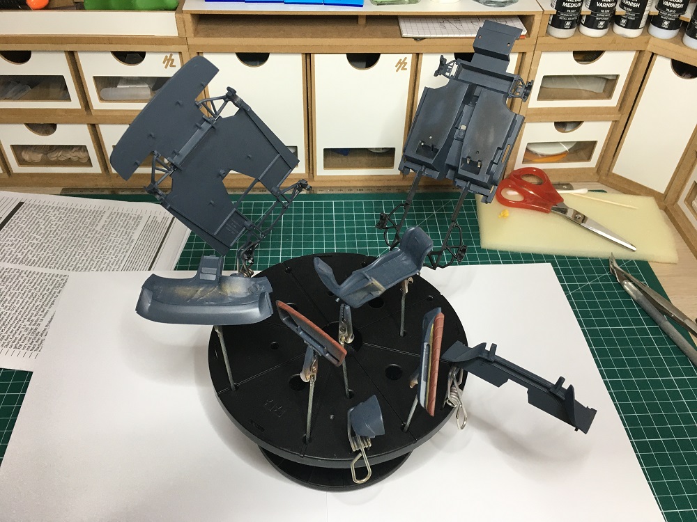 Dann kam die Inneneinrichtung dran. Hier habe ich mir ein dunkles Braun ausgesucht was etwas in die Richtung von Leder aussehen soll in Kombination mit einem dunklen Grau. Hier war die große Herausforderung die Teile ordentlich mit Klebeband vor dem Airbrushen sauber abzukleben. War eine ordentlich lange Fummelei – aber fürs erste mal recht gut gelungen.