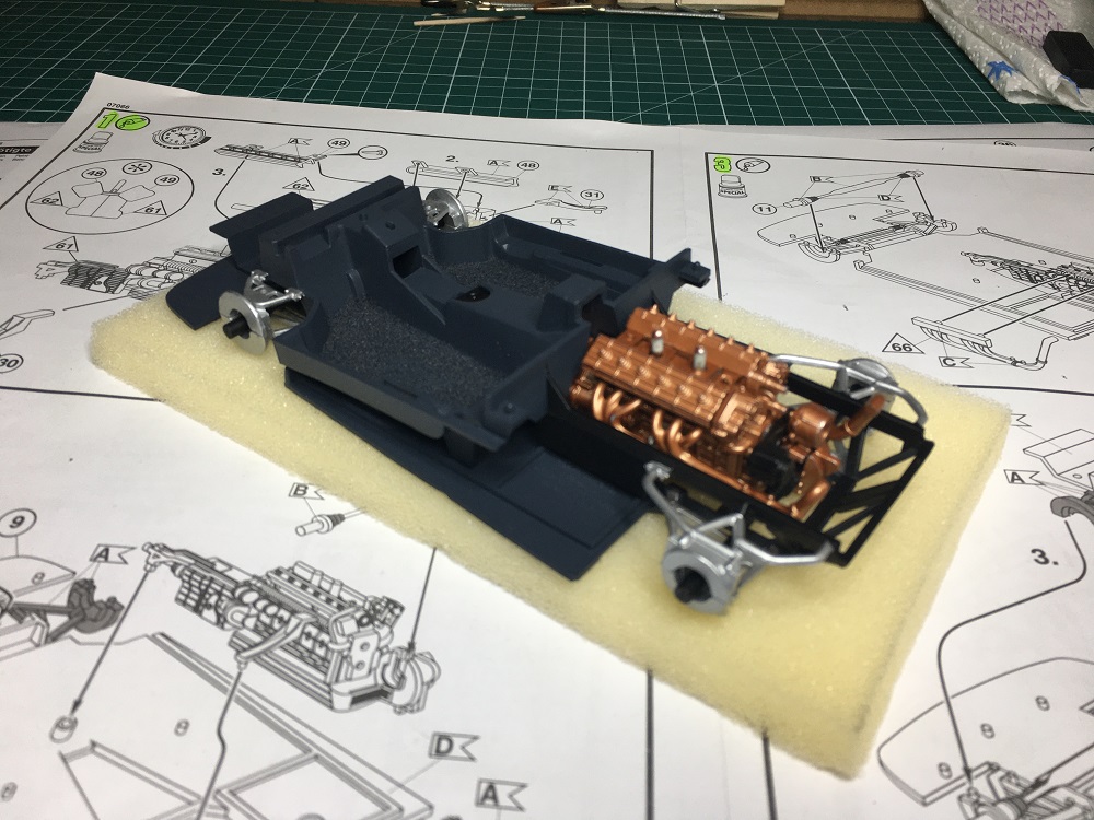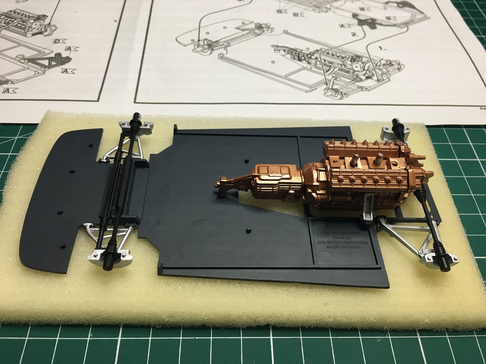 Der fertig lackierte Motor durfte jetzt auf die Bodenplatte – und die silbernen Teile wurden mit dem Pinsel gestrichen.