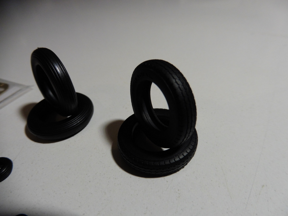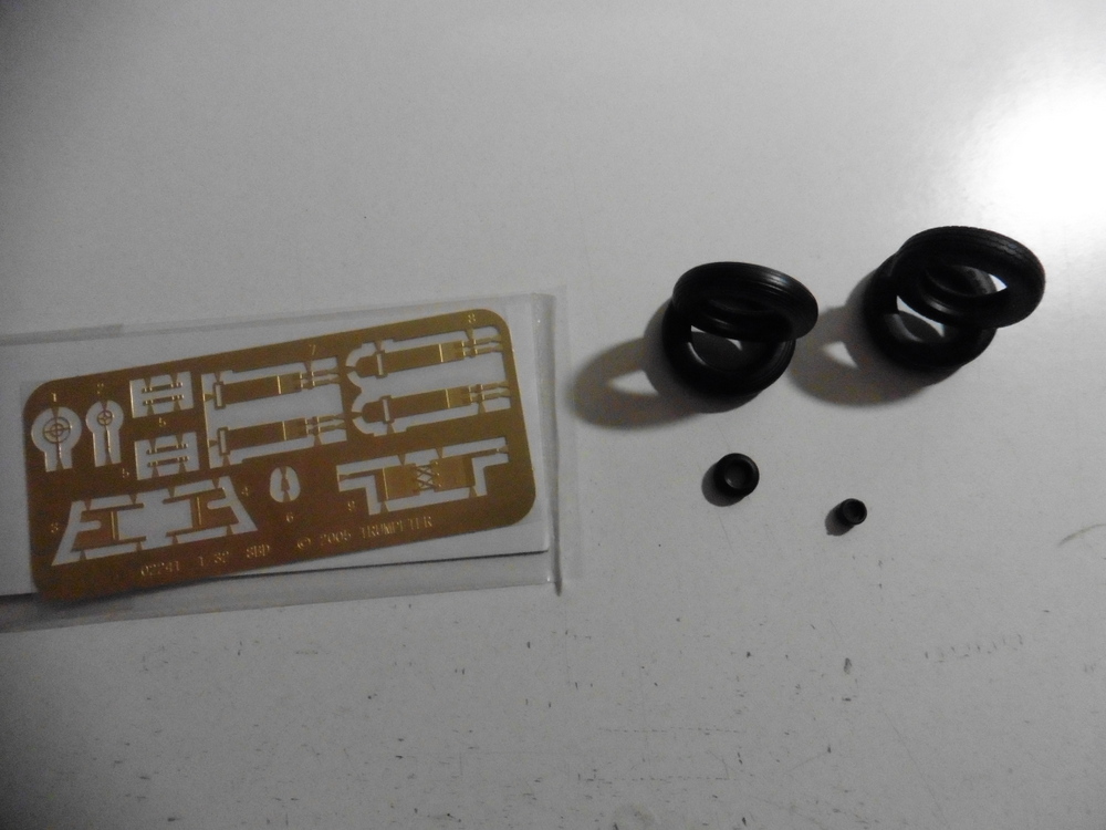 Dem Modell liegen ein paar Ätzteile bei . Weiterhin sind 2 paar Gummireifen dabei . Einmal mit Profil für landgestützte Flieger und einmal längsgerillte Reifen für den Trägereinsatz.