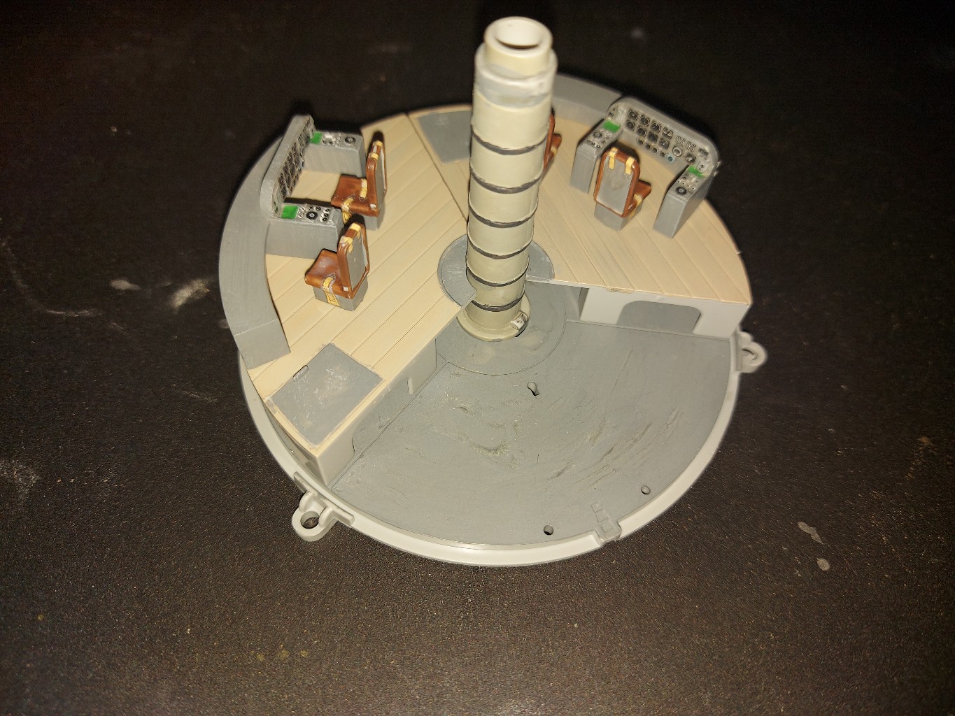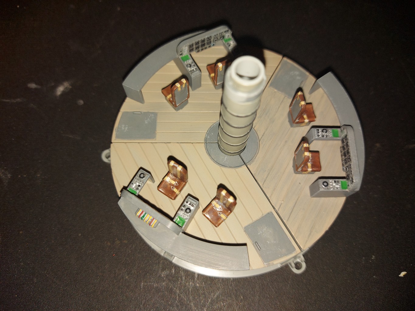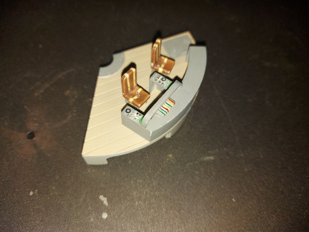 So hier kommt nun das Update. Zunächst habe ich die Gurte an den Sitzen angebracht. Anschließend sind die Gurte und die Steuerkonsolen auf die Cockpitböden angebaut wurden.