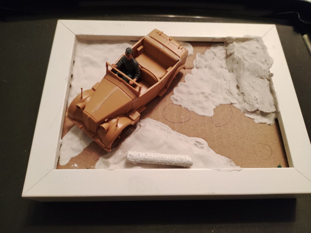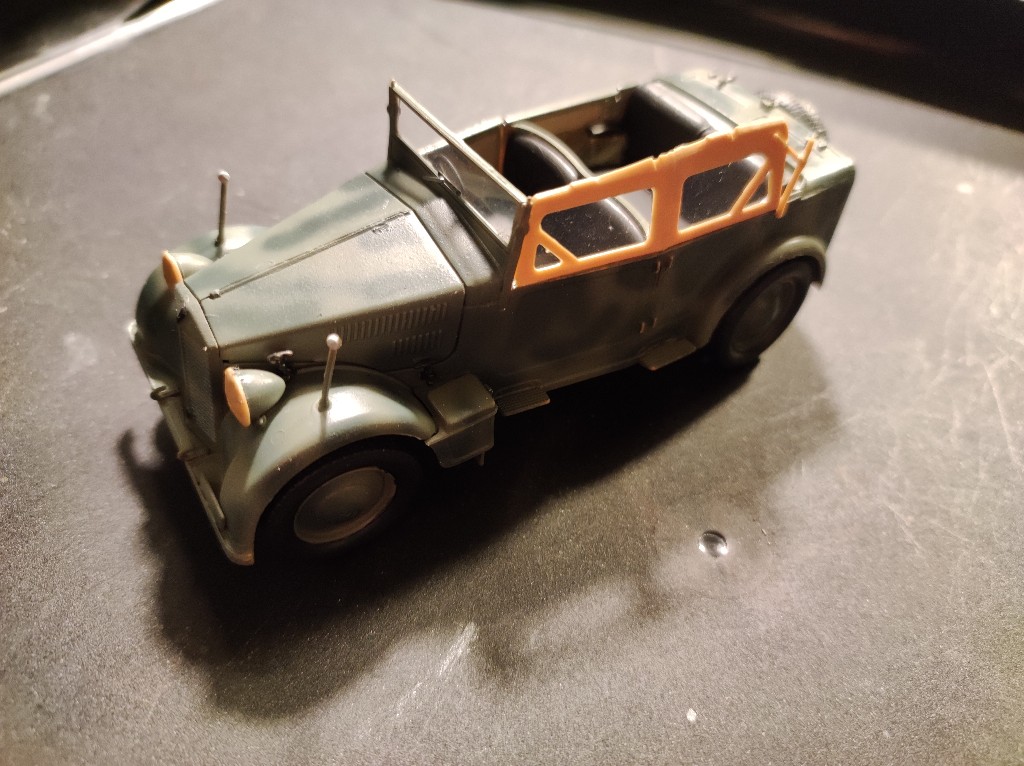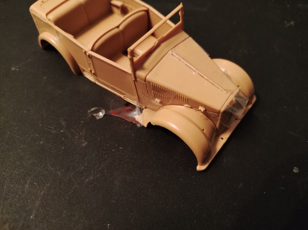 Um später einen Blick in den Motor zu ermöglichen soll die Motorhaube nur aufliegen, dafür habe ich die beiden Hälften verklebt und mit Klebeband so fixiert, dass der Winkel stimmt.