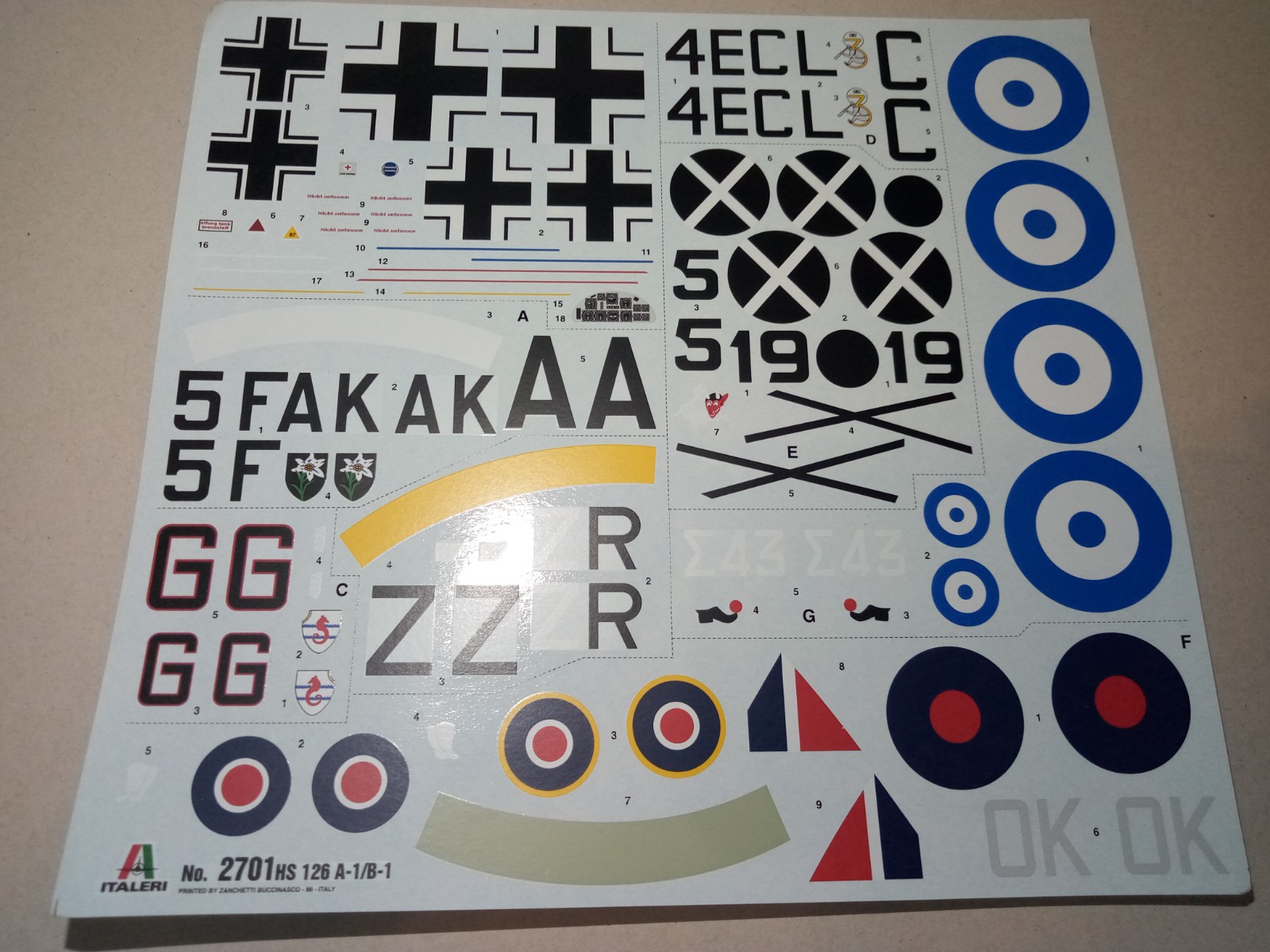 Der Decalbogen umfasst sieben Varianten der Henschel bzw. deren Kennung. Darunter auch eine britische Beutemaschine und ein Flugzeug der griechischen Luftwaffe. Historisch interessant dürfte auch das Schleppflugzeug sein, welches zusammen mit einem DFS 230 Lastensegler das damalige „Rettungspaket“ für Benito Mussolini ergab.