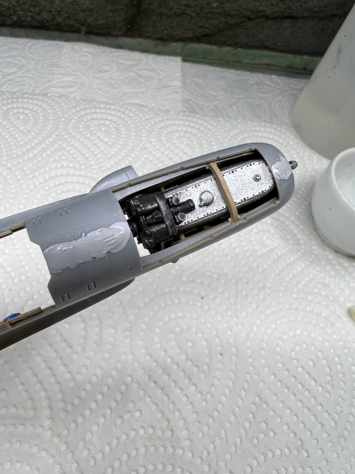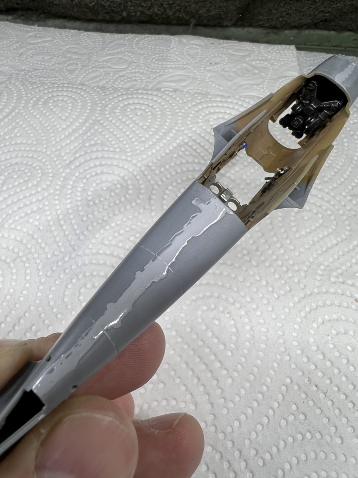 Die Rumpfhälften wurden dann geklebt, die mittlere Spalte habe ich mit Mr. Surfacer 500 gespachtelt