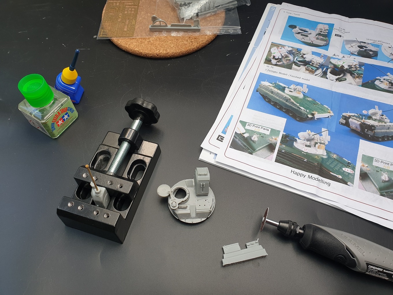 Die Tage werde ich wie schon erwähnt die restlichen Nebeltöpfe verbauen und den Optikblock des Richtschützen anbringen. Wenn alles klappt kann ich dann Farbe auftragen und den Panzerturm mit der Wanne verheiraten.