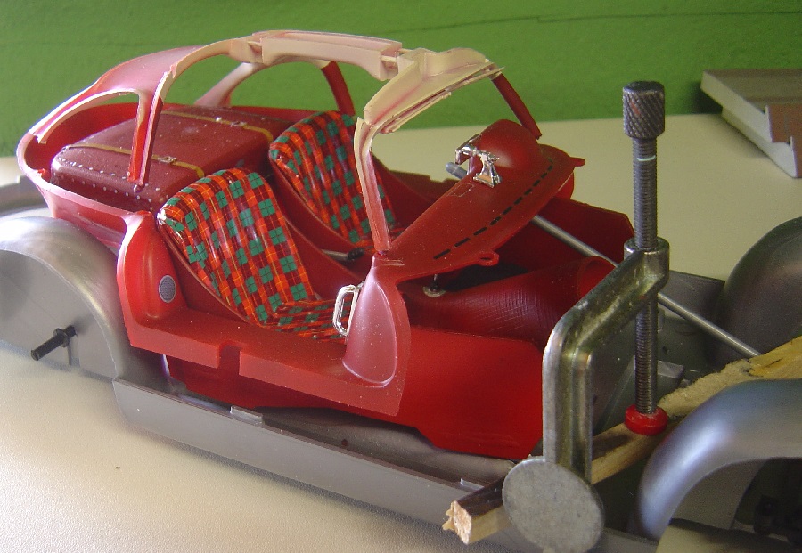 Die Abziehbilder für die Polster waren zum Abgewöhnen. Und ich mußte das halbe Hinterradgetriebe wegschneiden. Da lag der Innenraum auf.