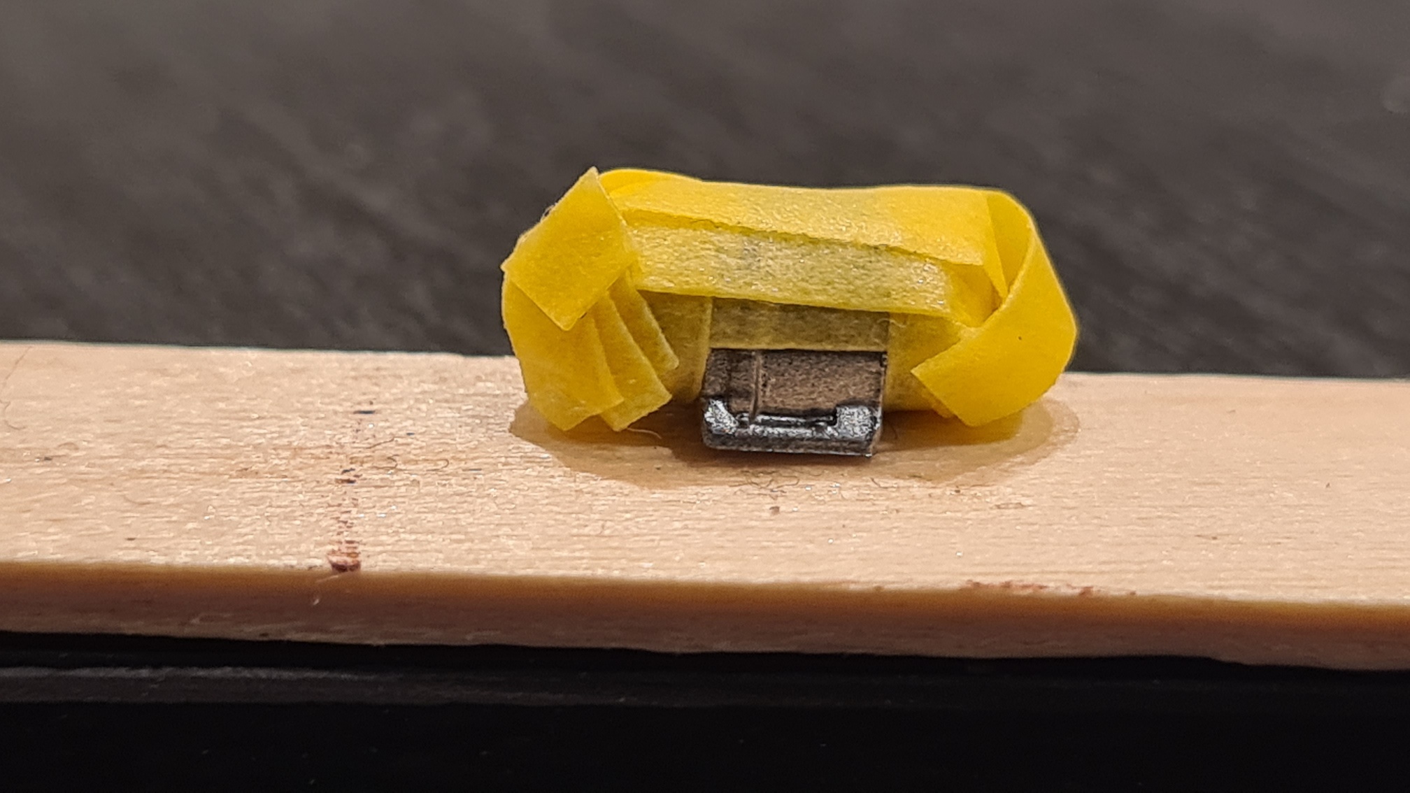 Das ist fast sofort trocken und es kam eine Schicht aus Clear Orange (10 Tropfen) und Schwarz (1 Tropfen aus der Vallejo Flasche) drauf.