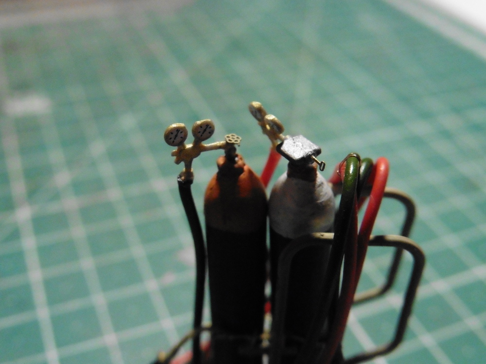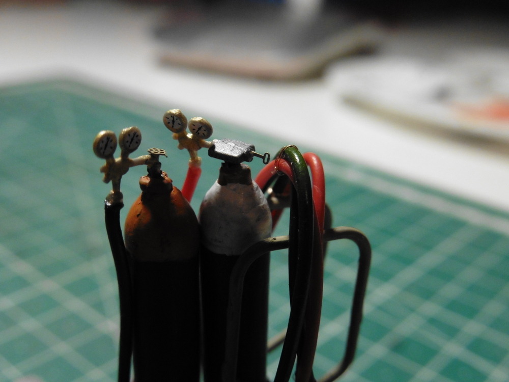 Was nur fehlt ist der Knauf an der Acetylen Flasche und der Drehgriff an der Sauerstofflasche. Außerdem hast Du die Farben vertauscht passend zu den Anschlüssen. Acetylen war früher gelb, heute braun. Sauerstoff früher blau, heute weiß. Und das Gewinde der Deckel muß noch rostig sein.