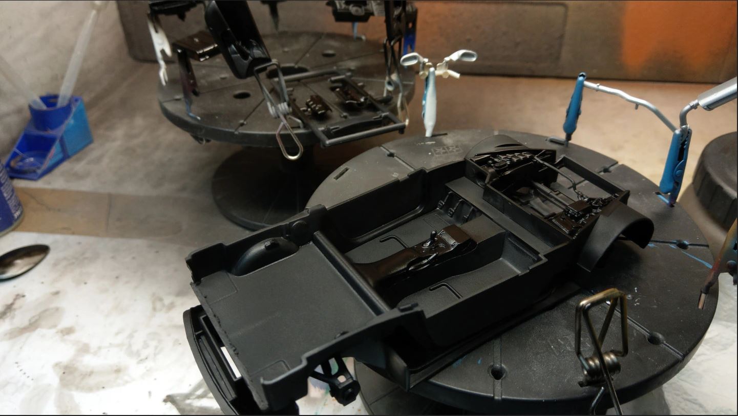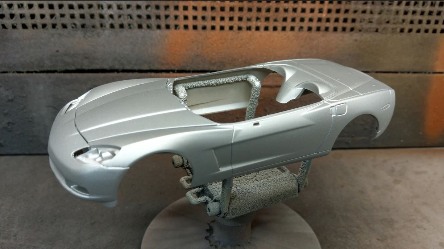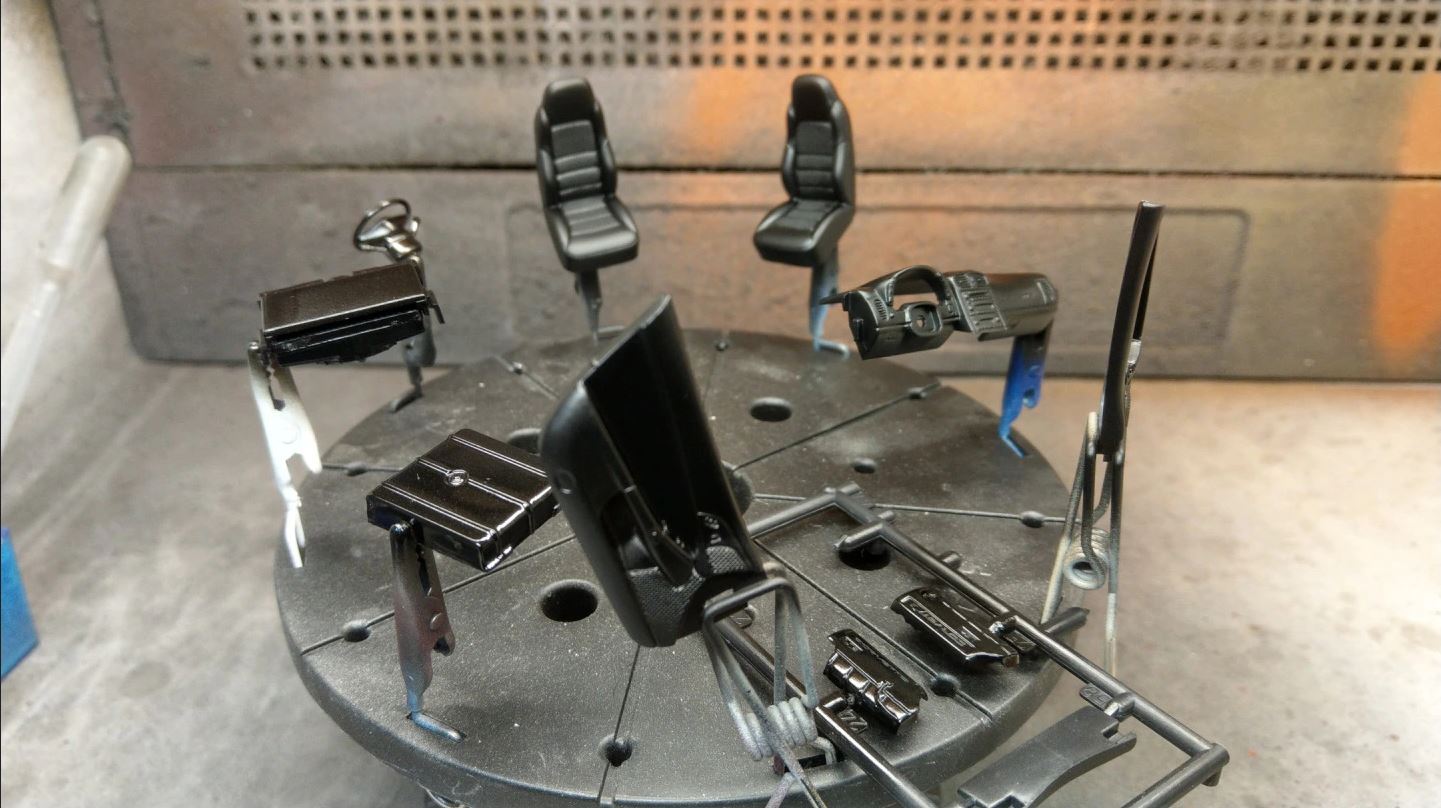 Gestern habe ich die restlichen Teile lackiert. Die Karsserie ist zumindest schon silber, Klarlack fehlt noch.