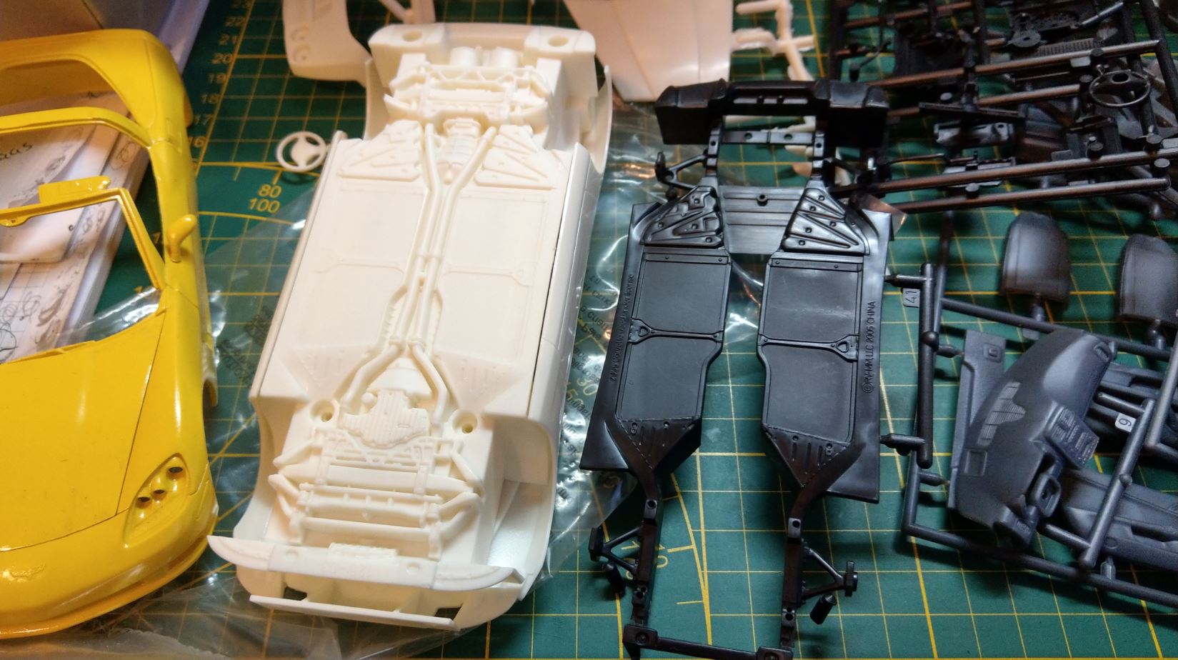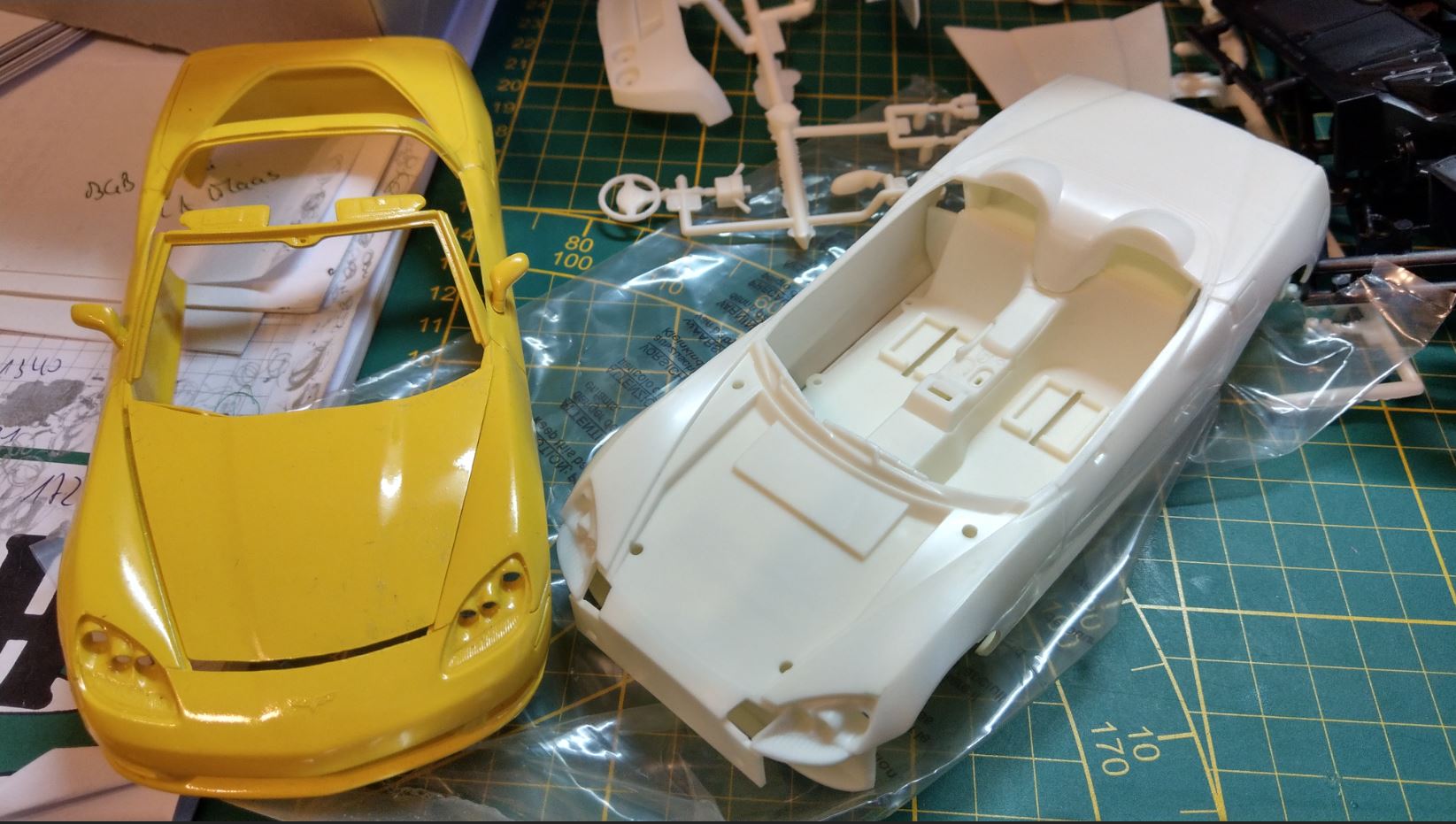 Zur Erinnerung: gelb und schwarz ist Revell, weiß ist AMT. Die Arbeit hier ist, nur die Karosserie von AMT zu verwenden, um ein Cabrio daraus zu erhalten.