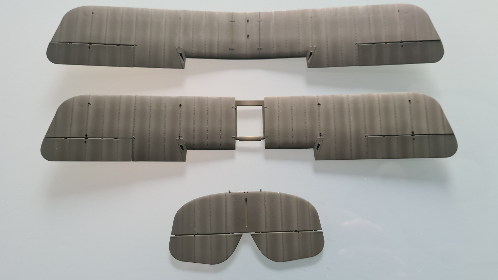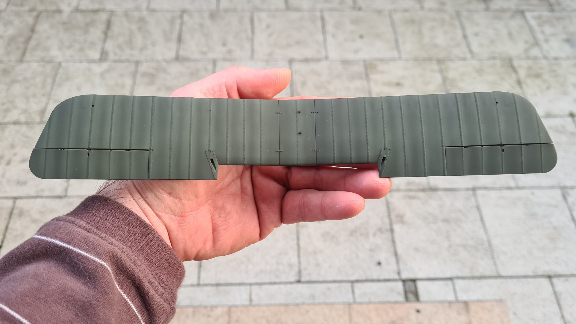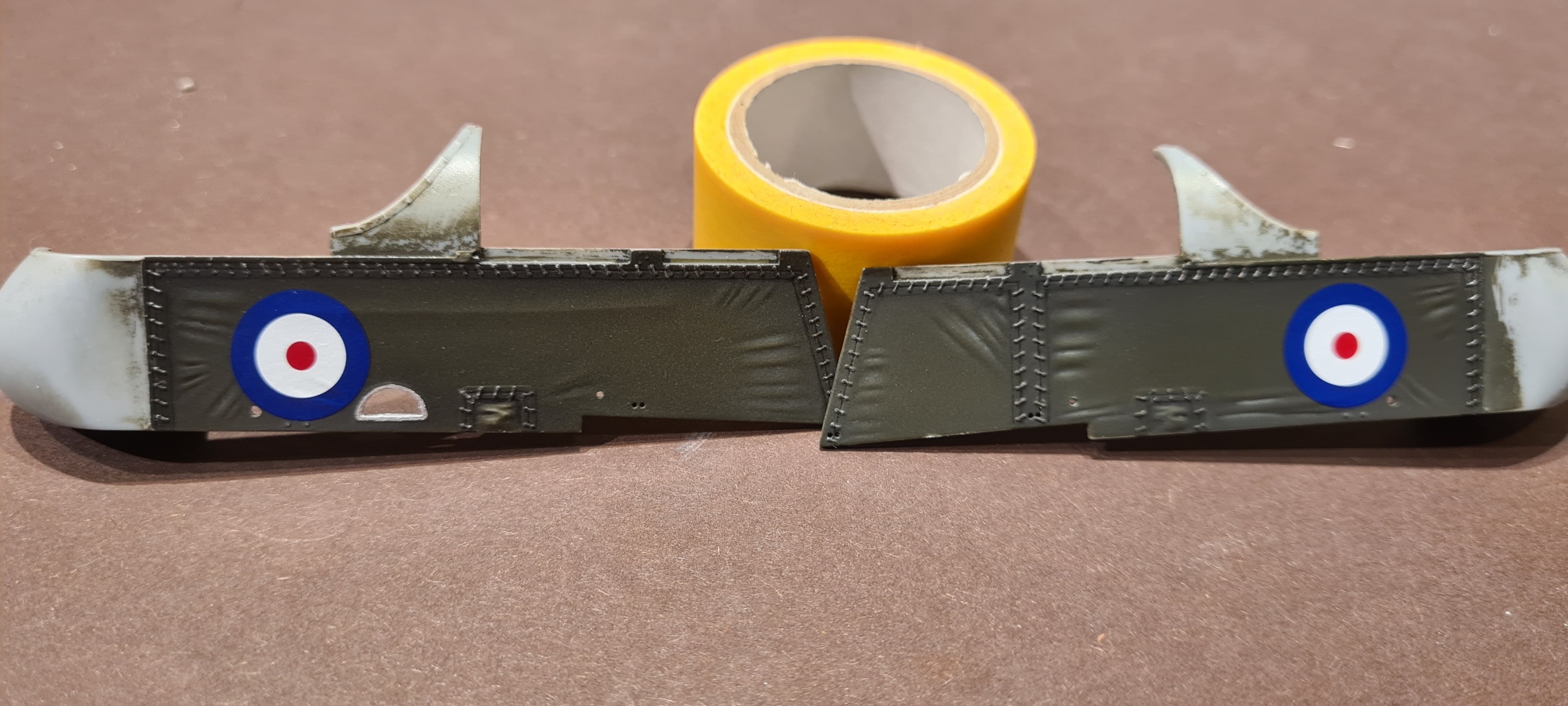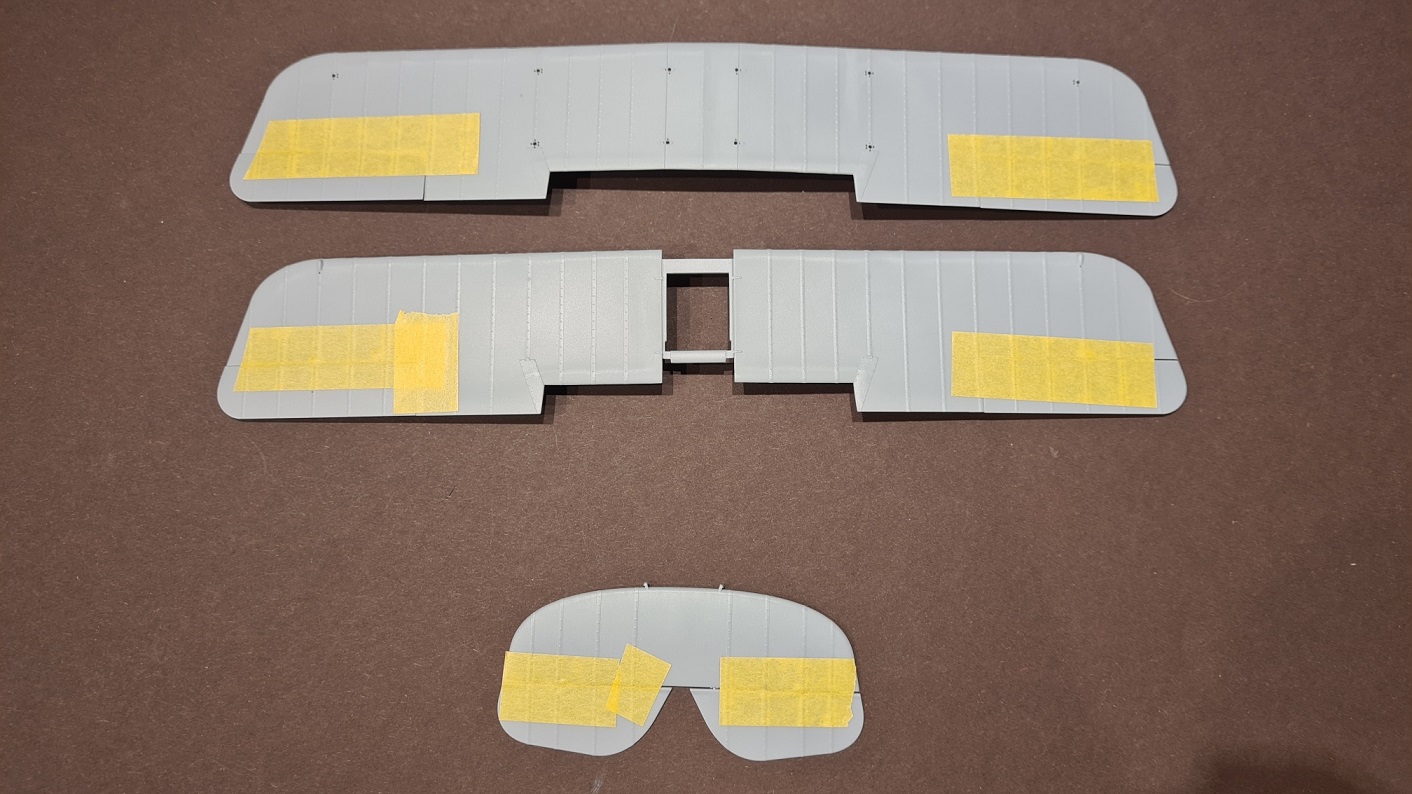 Heute ein Mini-Update. Die Flügeloberseiten wurden so gesprüht, wie ich es an den Mustern weiter oben ausprobiert hatte. Für einen gleichmäßigen Effekt habe ich Höhenruder und Querruder mit Maskierband fixiert.