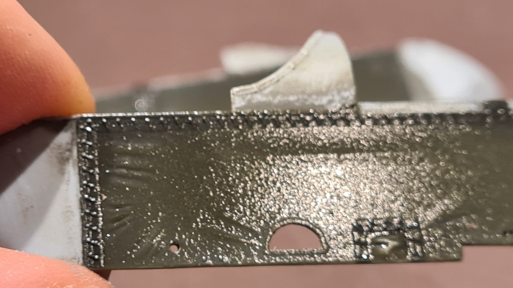 Nachdem die Seitenteile mit Ölfarbe aufgearbeitet wurden, sollte nun Klarlack drauf. Danach dann Decals. Nichtsahnend (und ich glaube, ich dachte, das auch vorher schon an anderer Stelle gemacht zu haben) wurde Vallejo Gloss Varnish drübergesprüht. Schließlich sollen die Decals ja eine schöne glatte Fläche vorfinden. Und dann das hier nach dem ersten Sprühgang :shock: