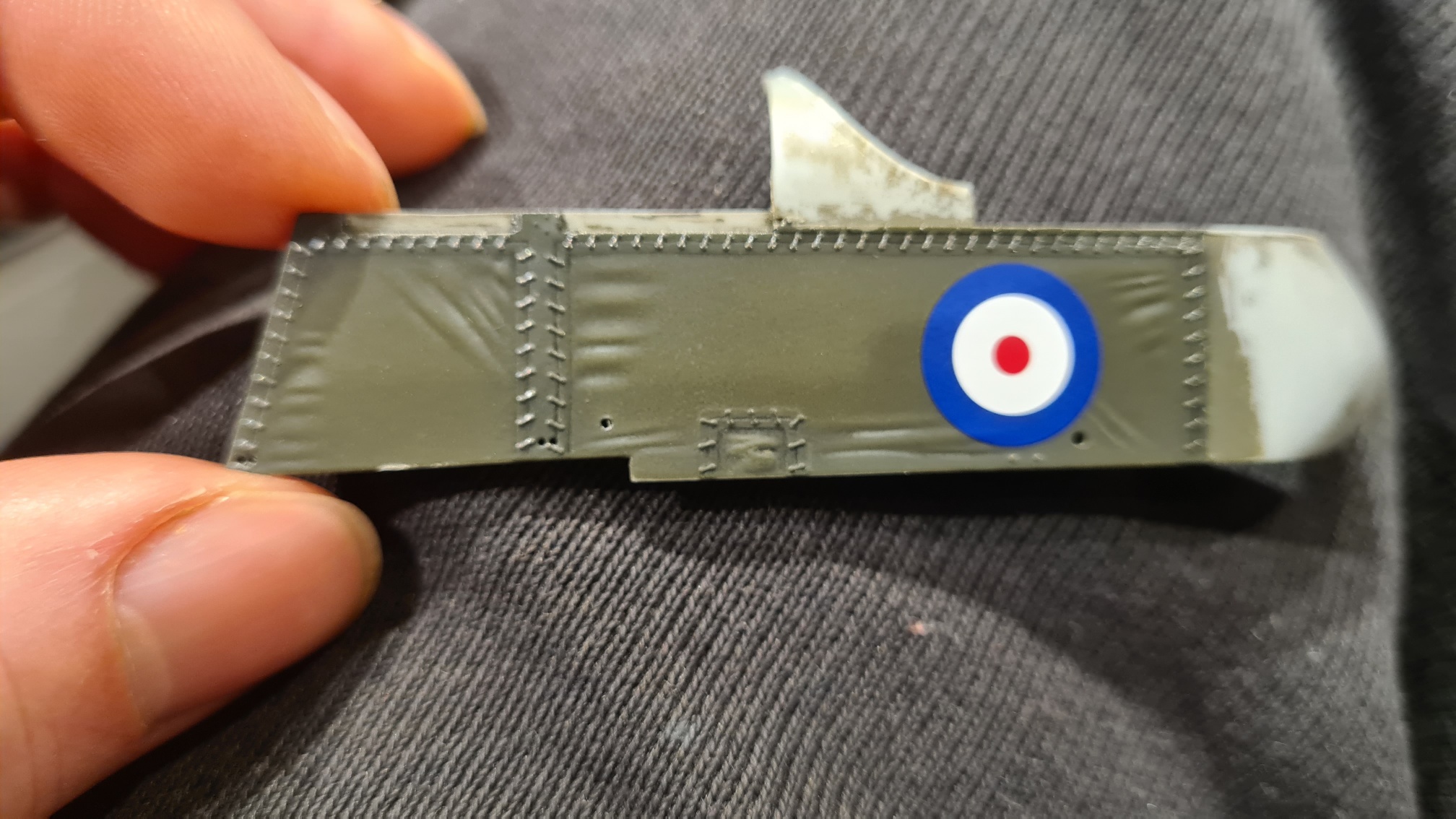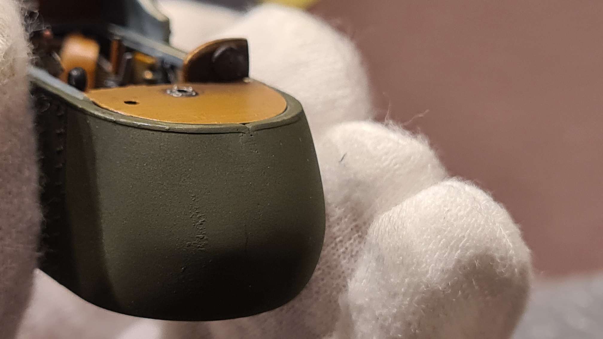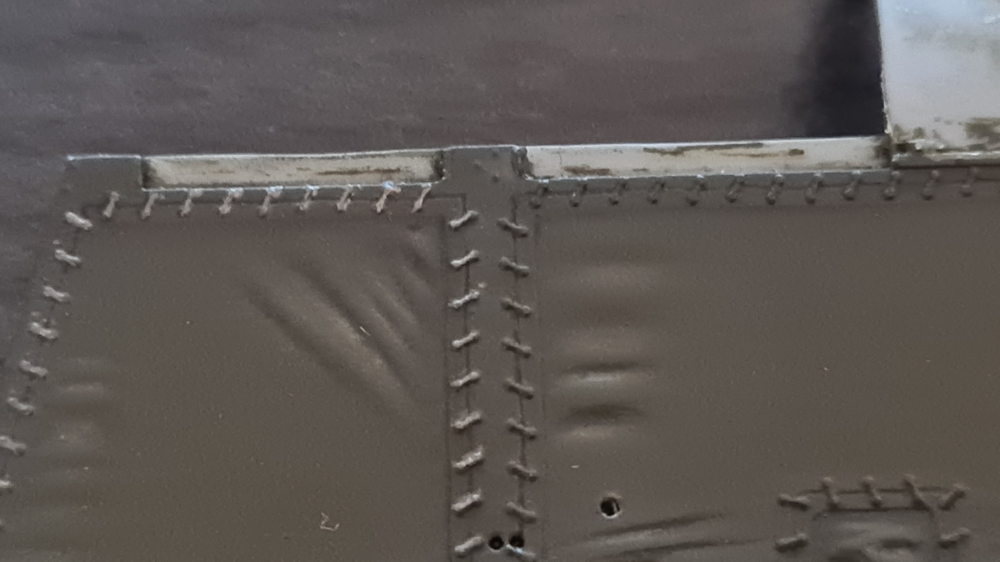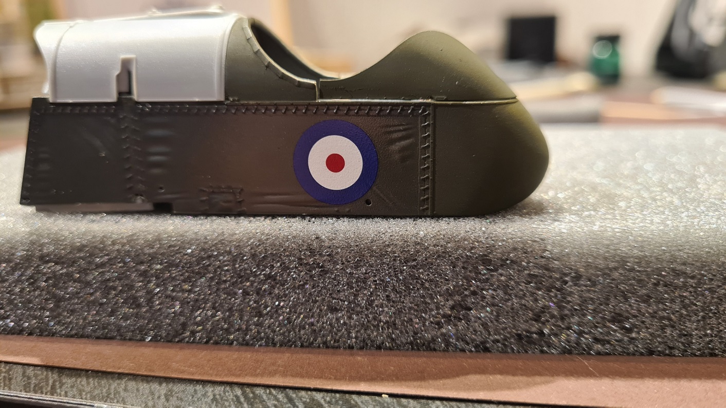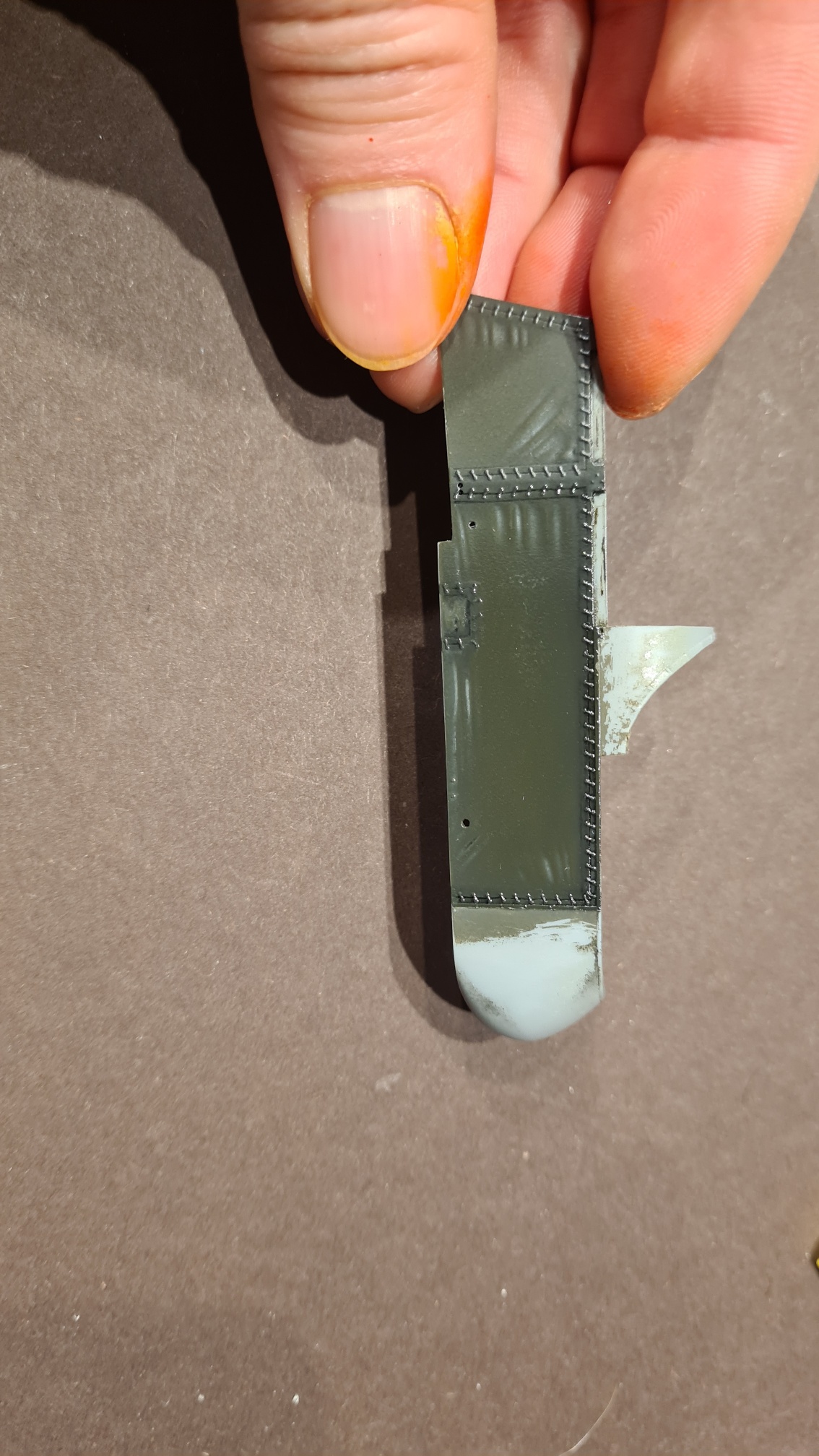 Etwas besser, aber alles andere als glatt. Nach dem Trocknen habe ich dann testweise seidenmatte Lack an der Seite links drübergesprüht (da kommt kein Decal hin) und eigentlich gefiel es mir, dass das Tuch eine etwas andere leder-ähnliche Strucktur hat. Kann man auf dem Foto nicht so recht erkennen.