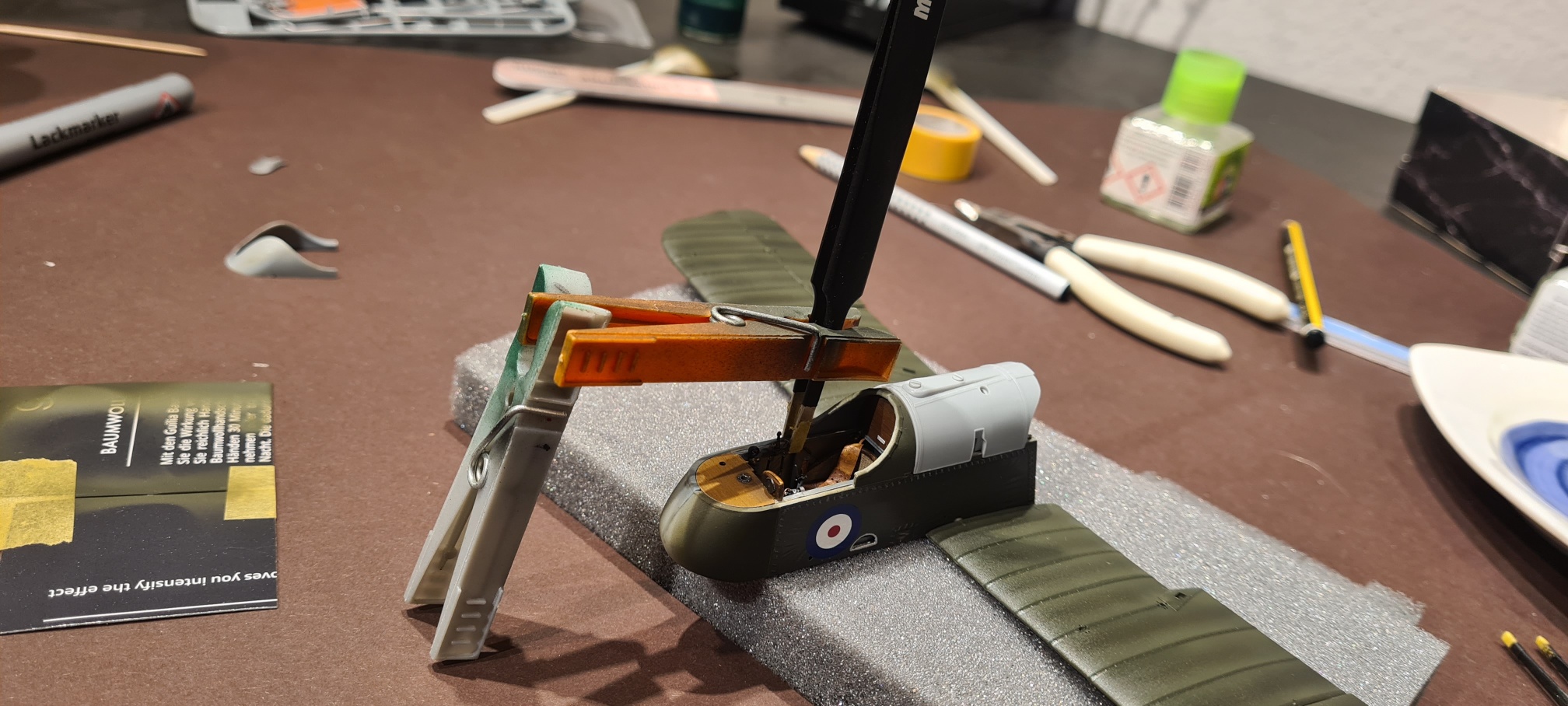 Hier ein lustiges Bild vom Kleben. Flügel unten drunter und unlackierte Motorhaube oben drauf helfen, dass alles ordentlich zusammengehalten wird und aushärten kann. Um die Seitenteile zusammenzudrücken, wurde eine flache Pinzette mit Maskierband beklebt und irgendwie mit Wäscheklammern... naja missbraucht.