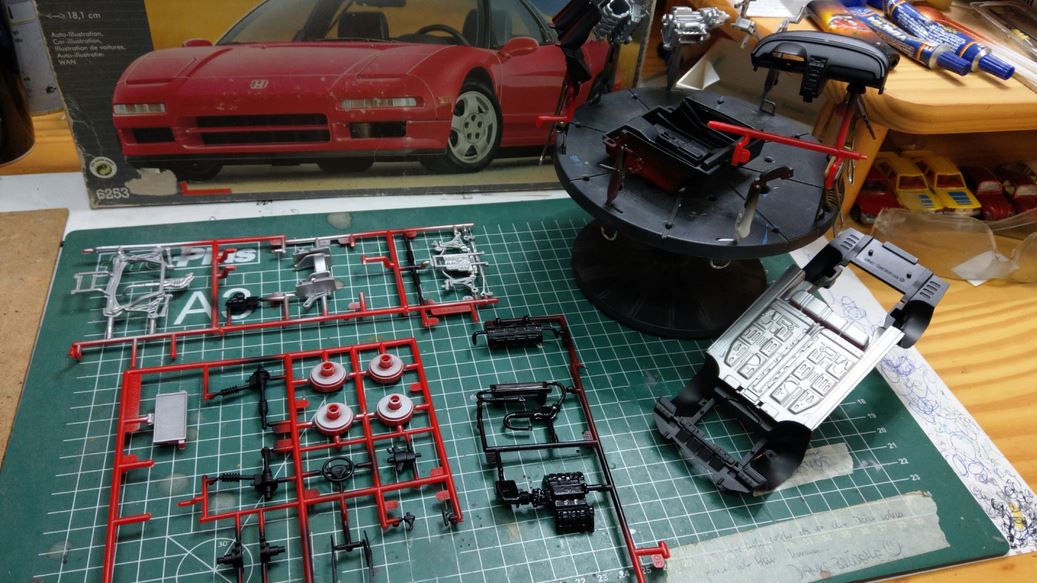 Wenn man die Historie anschaut erkennt man auch, dass der Bausatz zeitgleich mit dem Acura NSX auf den markt kam. Als Steckbausatz.Der selbe Bausatz wurde in den Karton geworfen. Umgelabled und Decals mit "Honda" / H beigelegt. Nur die Karosserie wurde nicht korrigiert oder Zusatzscheinwerfer beigelegt.