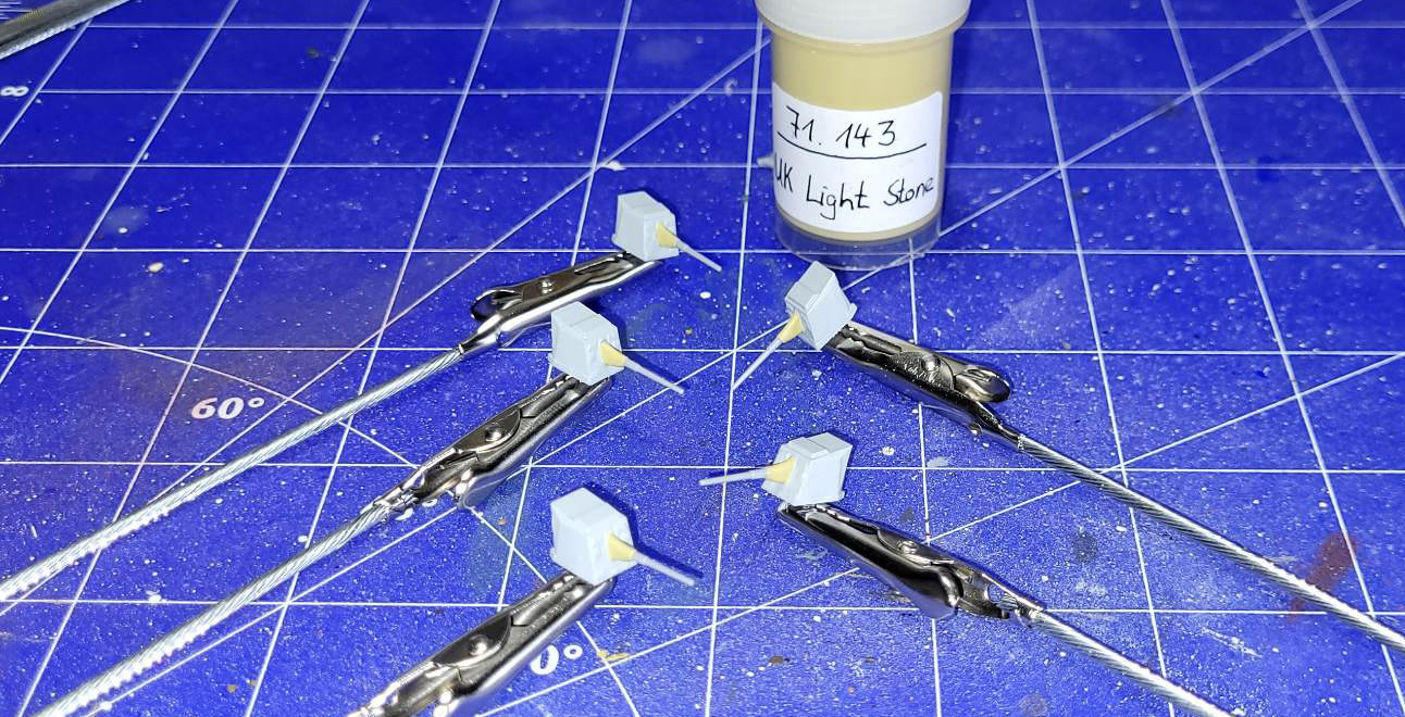 Bei der Farbgebung weiche ich etwas von der Bauanleitung ab. Anstatt die Rohrhosen weiß bzw. hellgrau zu bemalen, habe ich mich für ein sandiges Beige entschieden. Die Rohre und auch die Verschlüsse bekommen mal wieder die Farbe GUNMETAL verpasst (im Bild noch nicht zu sehen).