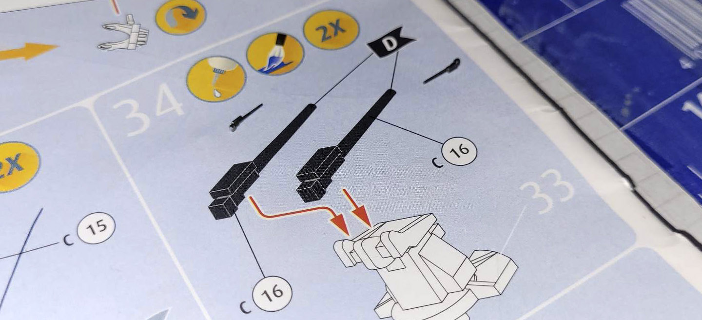 Im Bild kann man gut erkennen, wie klein die 3,7-cm-Rohre sind. In der Bauanleitung wunderbar groß dargestellt - aber beim Aufbringen auf die Lafette echte Schweinehunde!