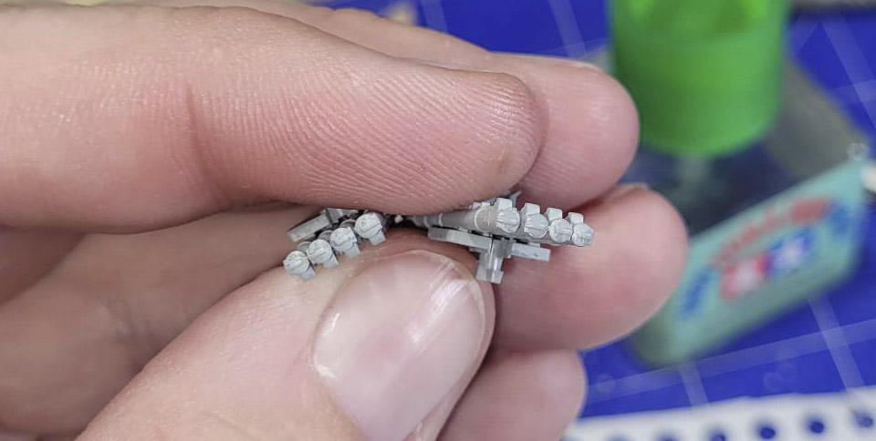 Im Bausatz wird jeder Geschützturm aus jeweils vier Bauteilen zusammengesetzt: ein Bodenstück, das Geschützrohr, der Turm an sich und der darin befindliche Geschützverschluss.