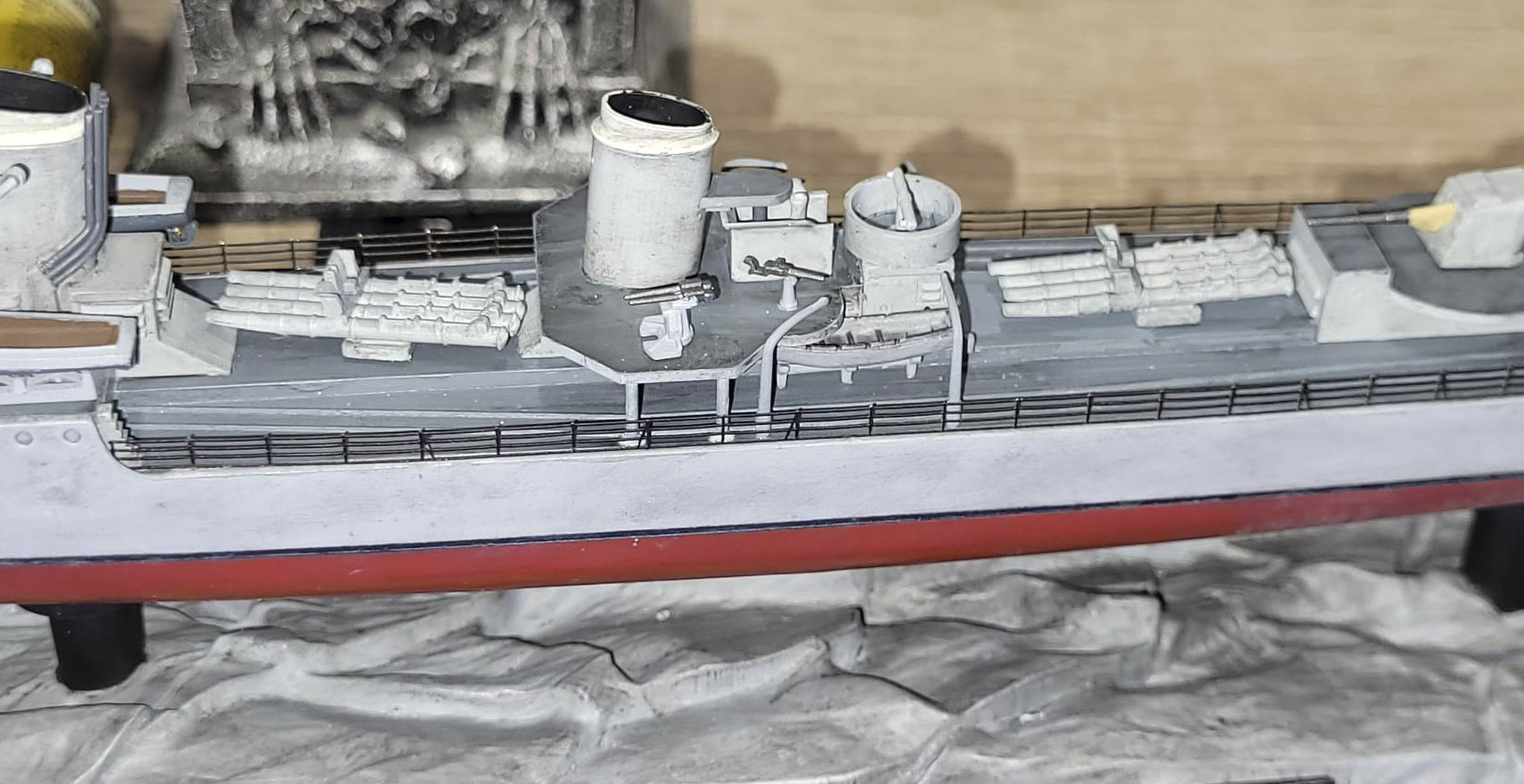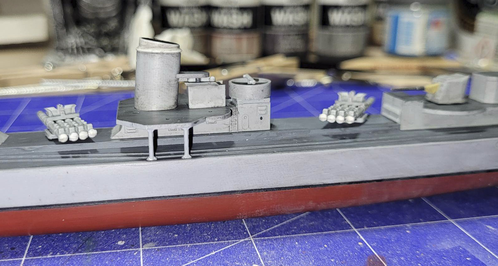 Mittschiffs befinden sich zwei Vierlings-Torpedosätze mit jeweils eigenem Leitstand (oder auch Brücke). Die Verschlüsse der Torpedorohre habe ich mit Weißgrau bemalt.