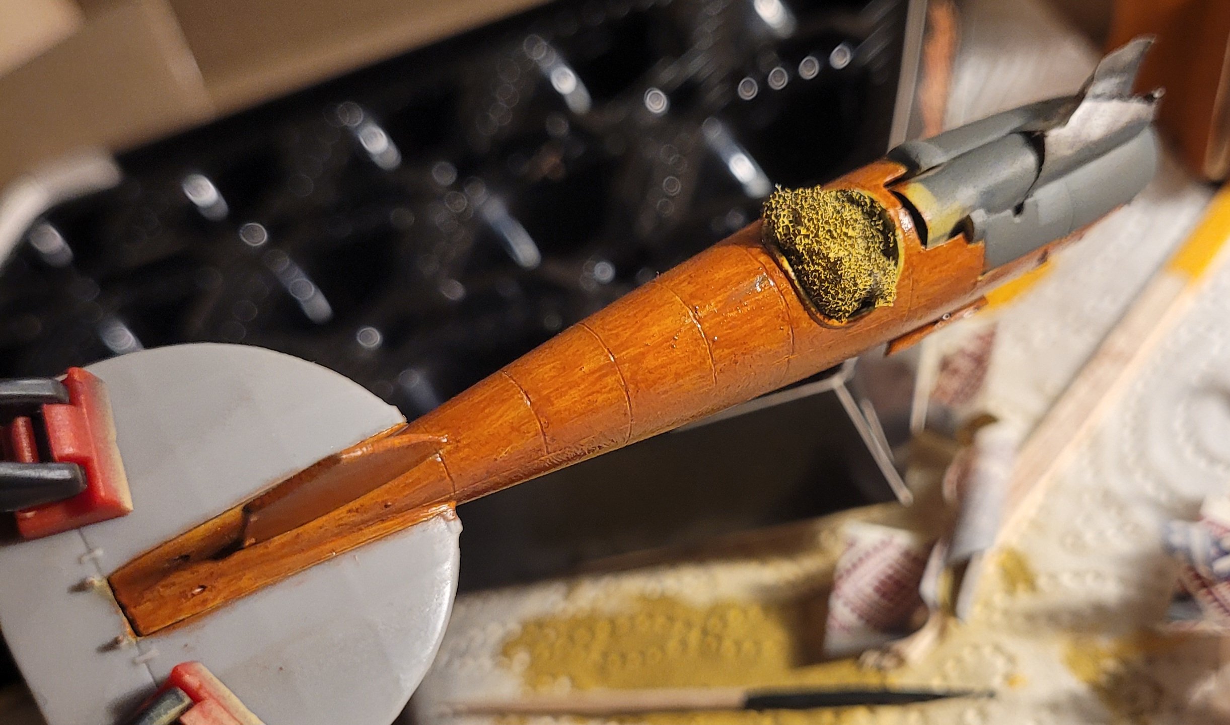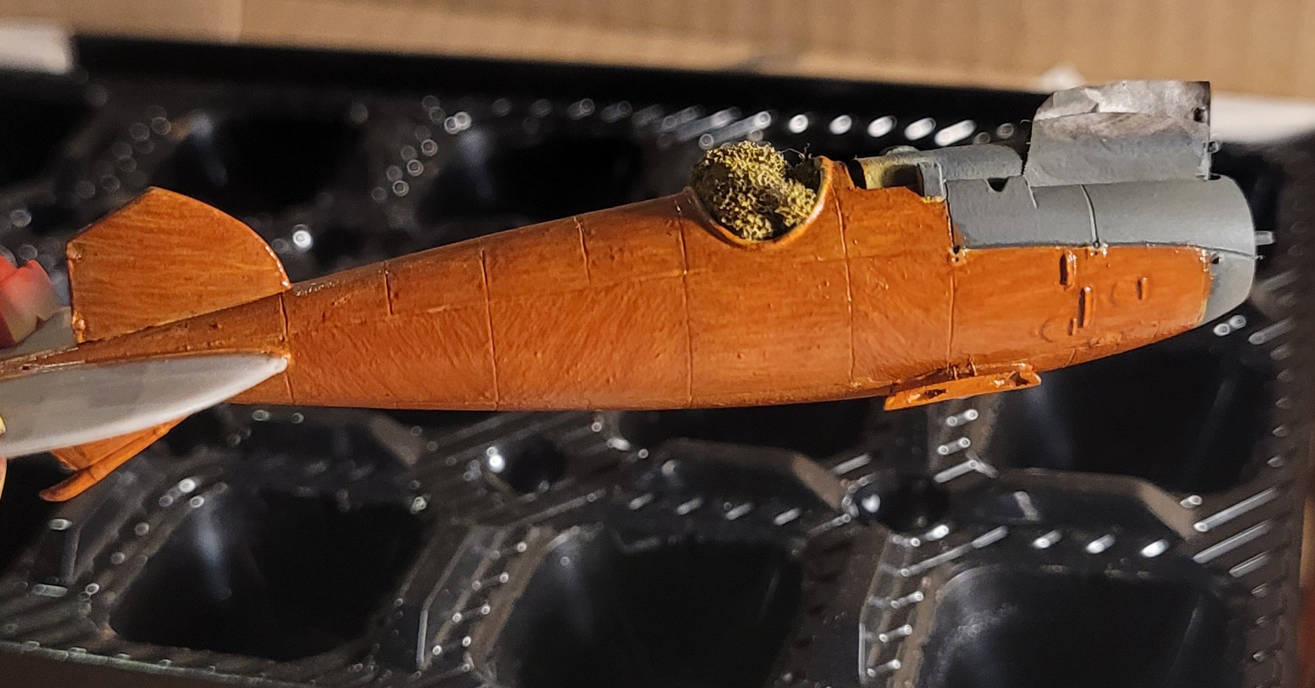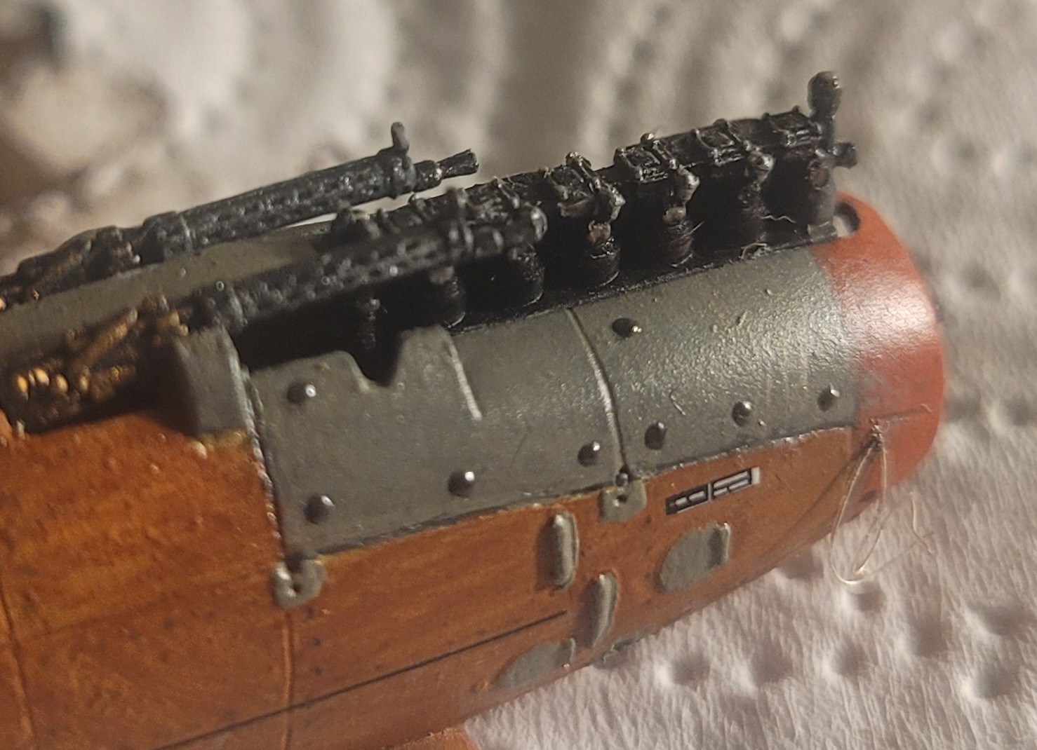Hab den Rumpf inzwischen so ziemlich fertig. Auf der Motorhaube hab ich noch ein paar Nieten nachgebildet, gefällt mir ganz gut. Für die Nieten habe ich dieses Bluefixx (welches ich an anderer Stelle mal vorgestellt hatte) mittels Zahnstocher aufgetragen und dann ausgehärtet.