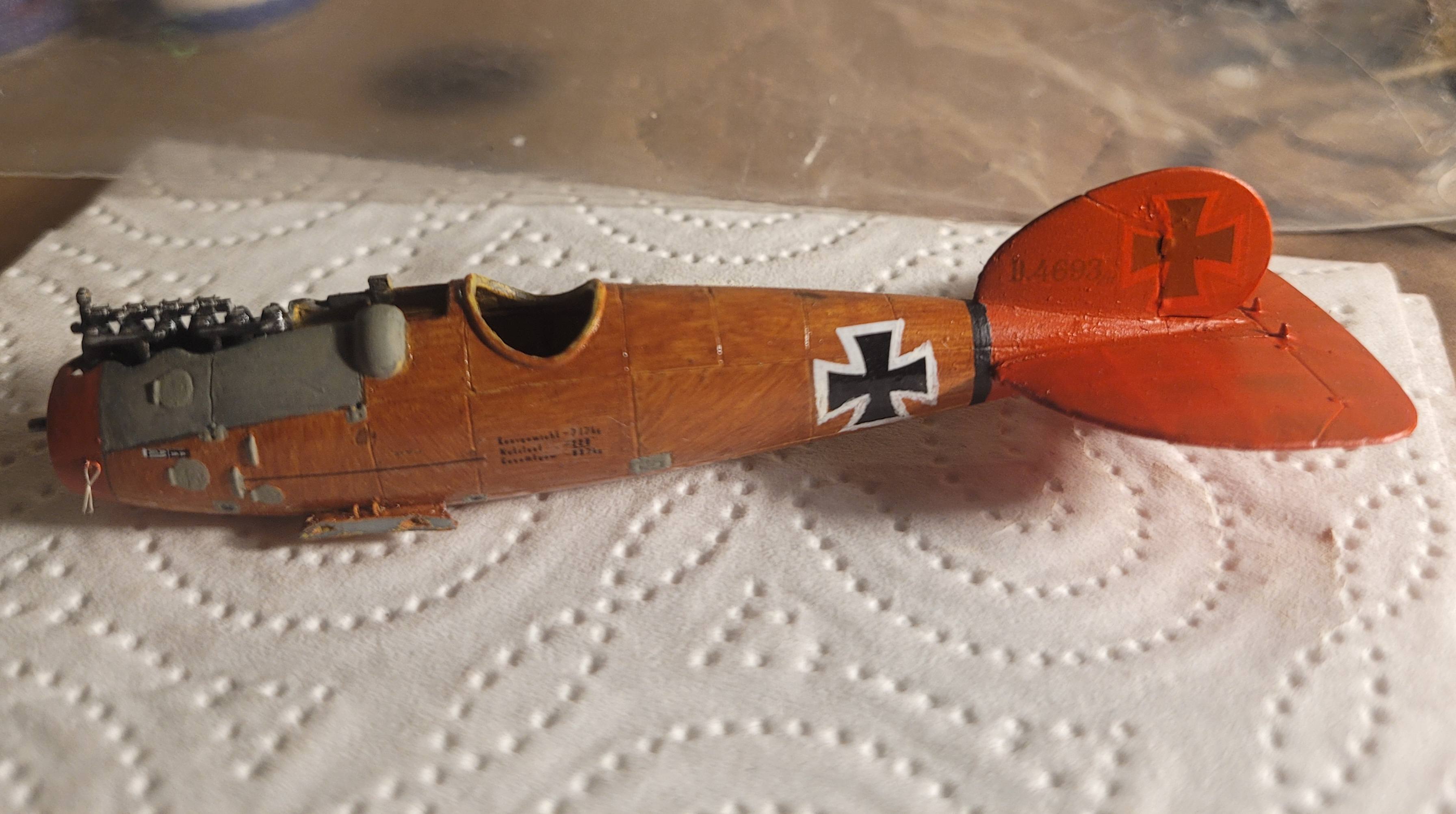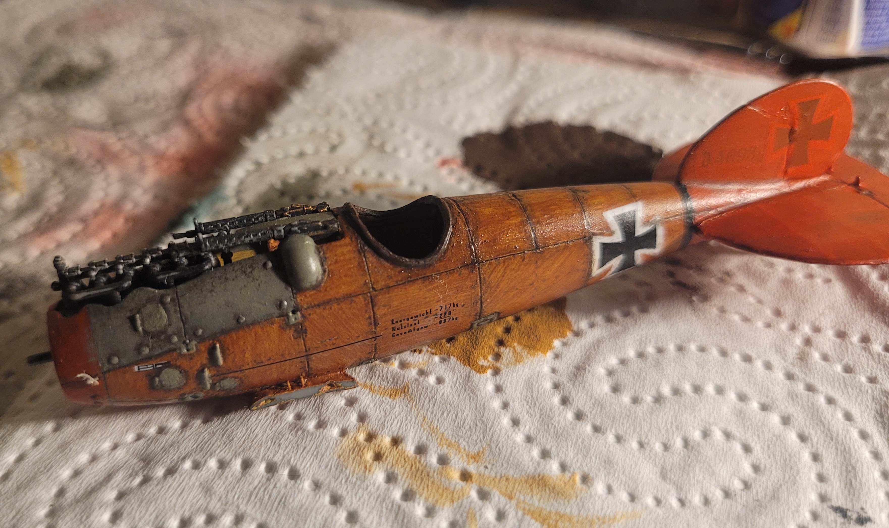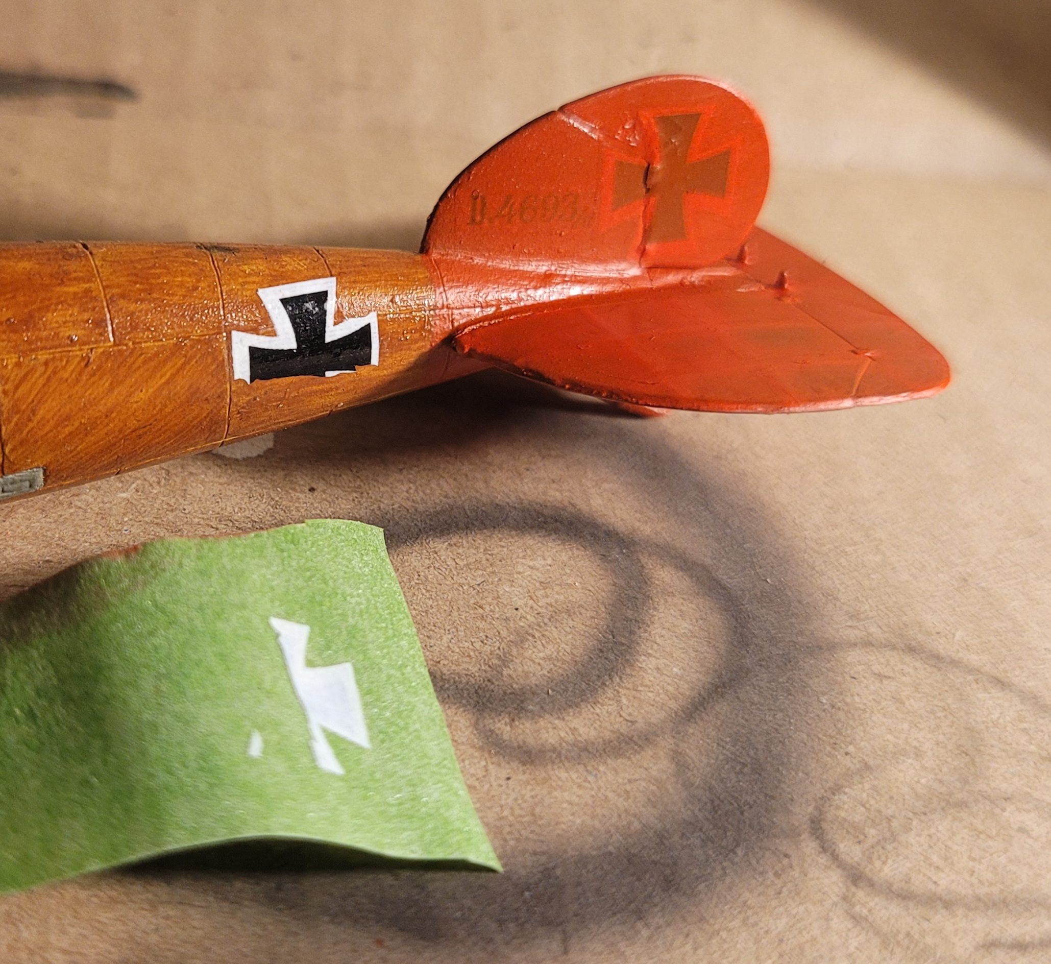 Nach Roden-typischen Problemen, dazu mehrwöchigem Rumärgern mit einem leider namhaften Aftermarket-Zulieferer (Details verschwinden jetzt mal unter dem Mantel des Schweigens) und daraus resultierender Unlust das Modell überhaupt weiter zu bauen...heute der nächste Rückschlag (den ich dieses Mal selbst zu verschulden habe). Rumpf wie oben gesehen lackiert, bisschen am Heck weiter gearbeitet. Vor ein paar Tagen die ersten Decals drauf. Einen Tag darauf versiegelt. Heute die Heckpartie für den nächsten Schritt abgeklebt...Ende vom Lied: beim abziehen vom Tape glatt ein wichtiges Decal halb mit weg gerissen.
