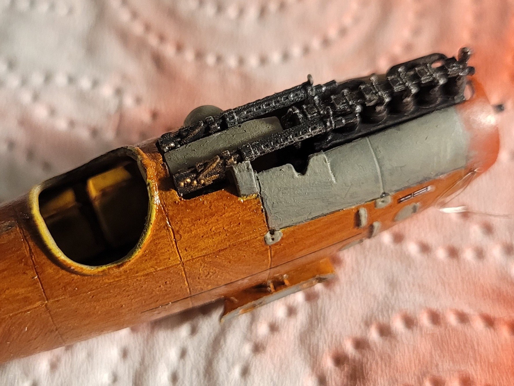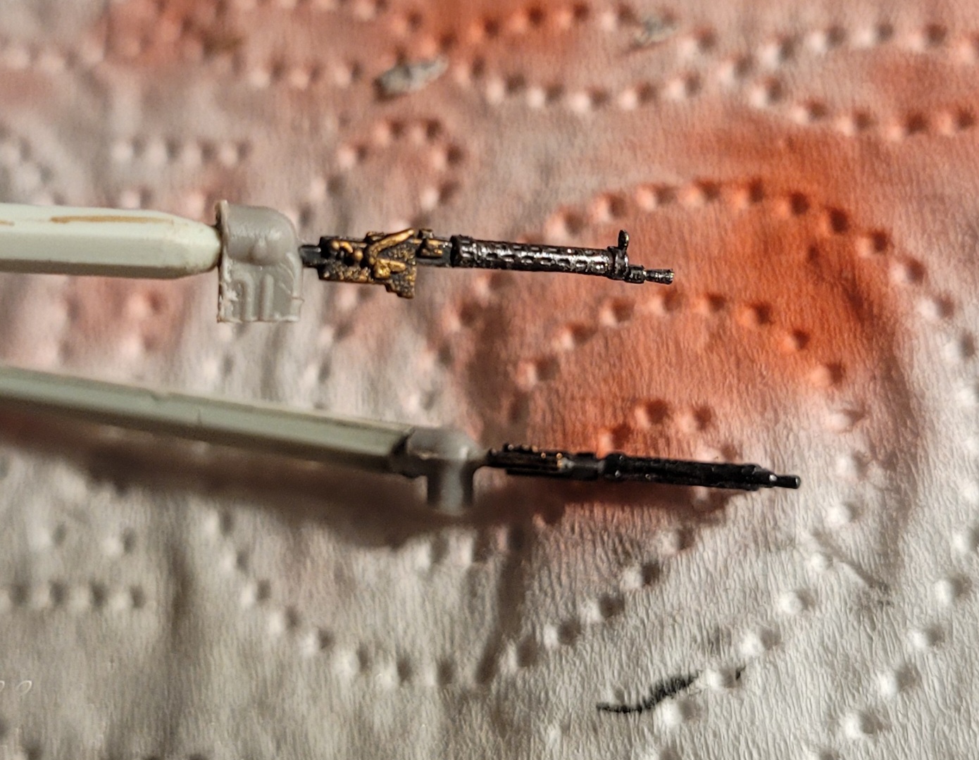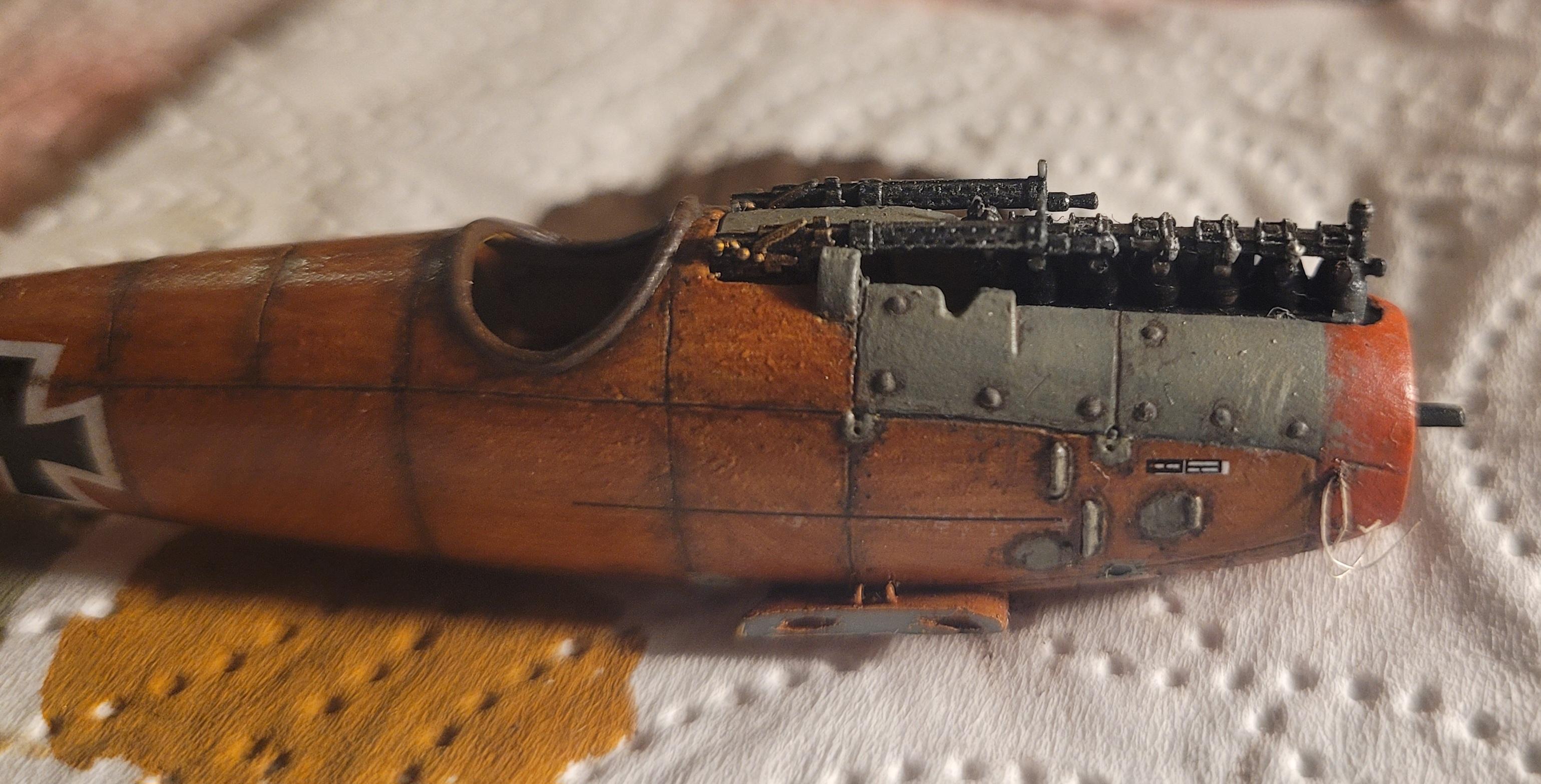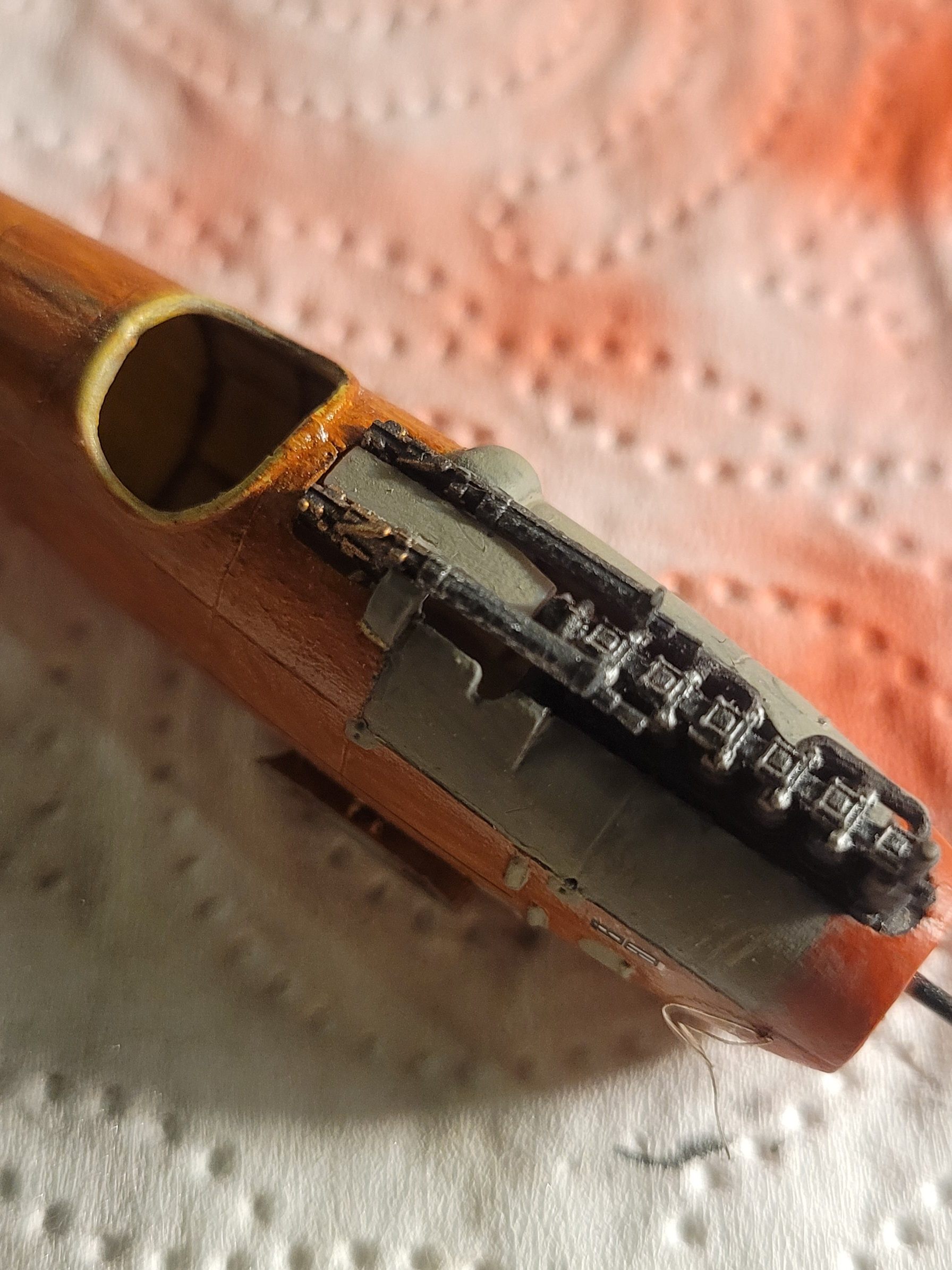 Dieser Bausatz bringt mich noch zur Verzweiflung. Jetzt hab ich geschlagene zwei Abende damit verbracht, ein winziges Bauteil so zurecht zu pfriemeln, dass es endlich seinen Zweck erfüllt (die Rede ist von der Abdeckung zwischen den beiden MGs) . Hier passt kaum was vernünftig zusammen