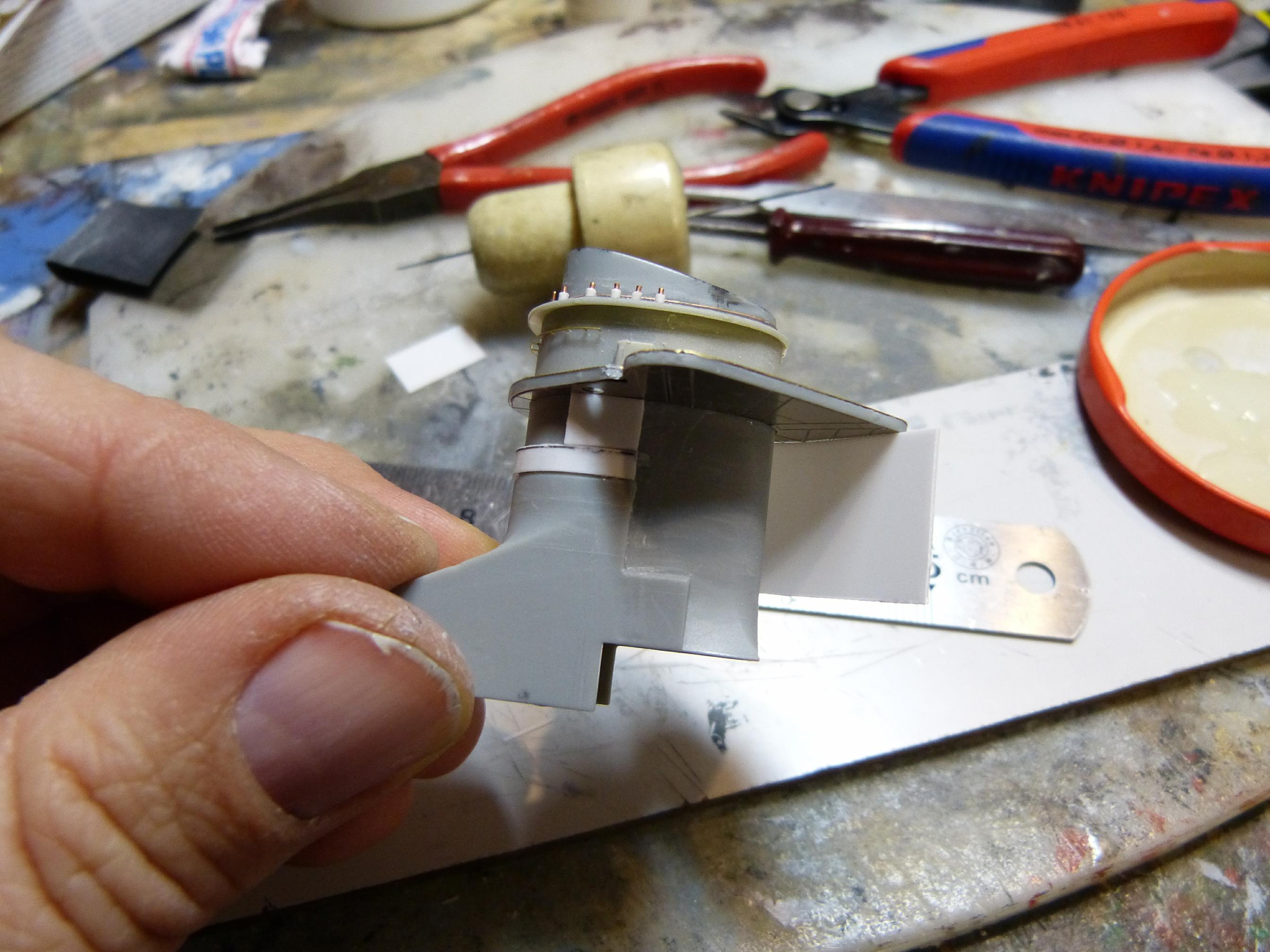 Dann ging’s los mit den Änderungen, der GU-Schornstein hat unterhalb der Plattform vorne so eine Aussparung, die gab es bei SH so nicht. Daher mit Plastiksheet herausgearbeitet.