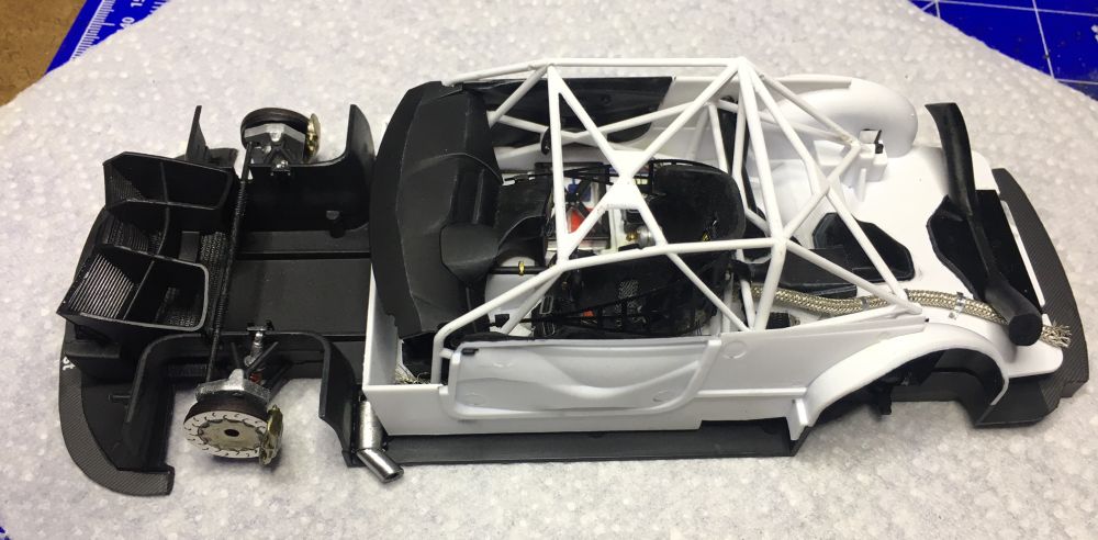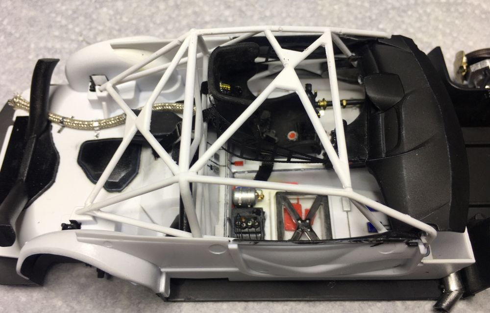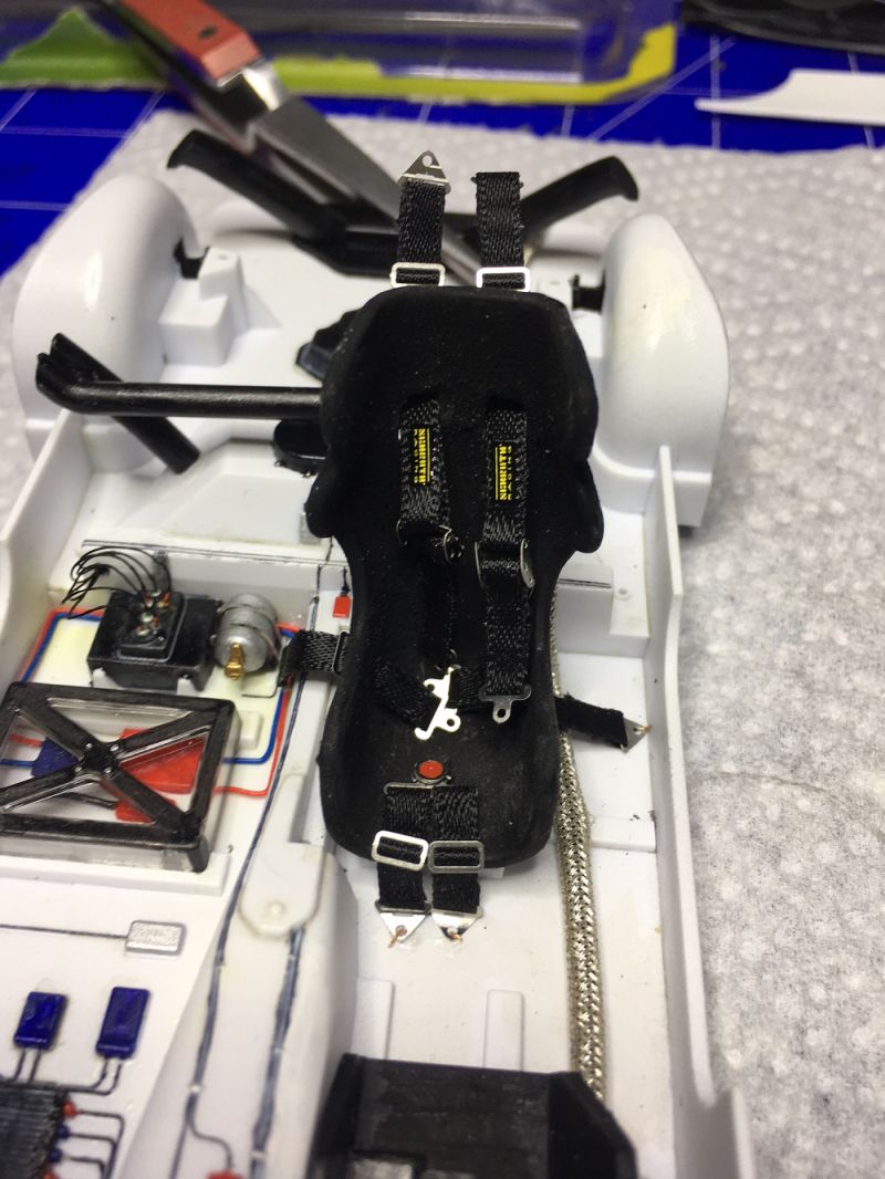 Die langen Gurtenden sind noch lose, da sie nach dessen Einbau am Käfig montiert werden. Für die Befestigungen habe ich kleine Löcher gebohrt und sehr dünnen Kupferdraht eingesetzt. So waren die Dinger gut anzubringen. Wenn die Karosse drauf ist, wird man die Drähte nicht mehr sehen.