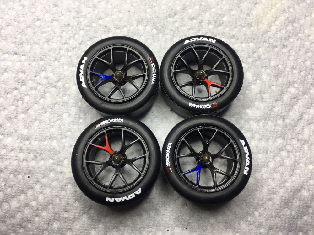 Für die Fertigstellung der Räder hat es jedoch gereicht. Die blauen und roten Markierungen sind Decals und die Ventile aus gezogenem Gussast. Ich werde noch versuchen, ob ich die Reifenbeschriftung mit Lack versiegelt bekomme, da sie etwas silbern. Die Felgen sind gesprüht mit Gunze Metall Black und an den Kanten mit Pulver von Uschi v.d.R. poliert. Das kommt leider auf den Fotos nicht richtig rüber.