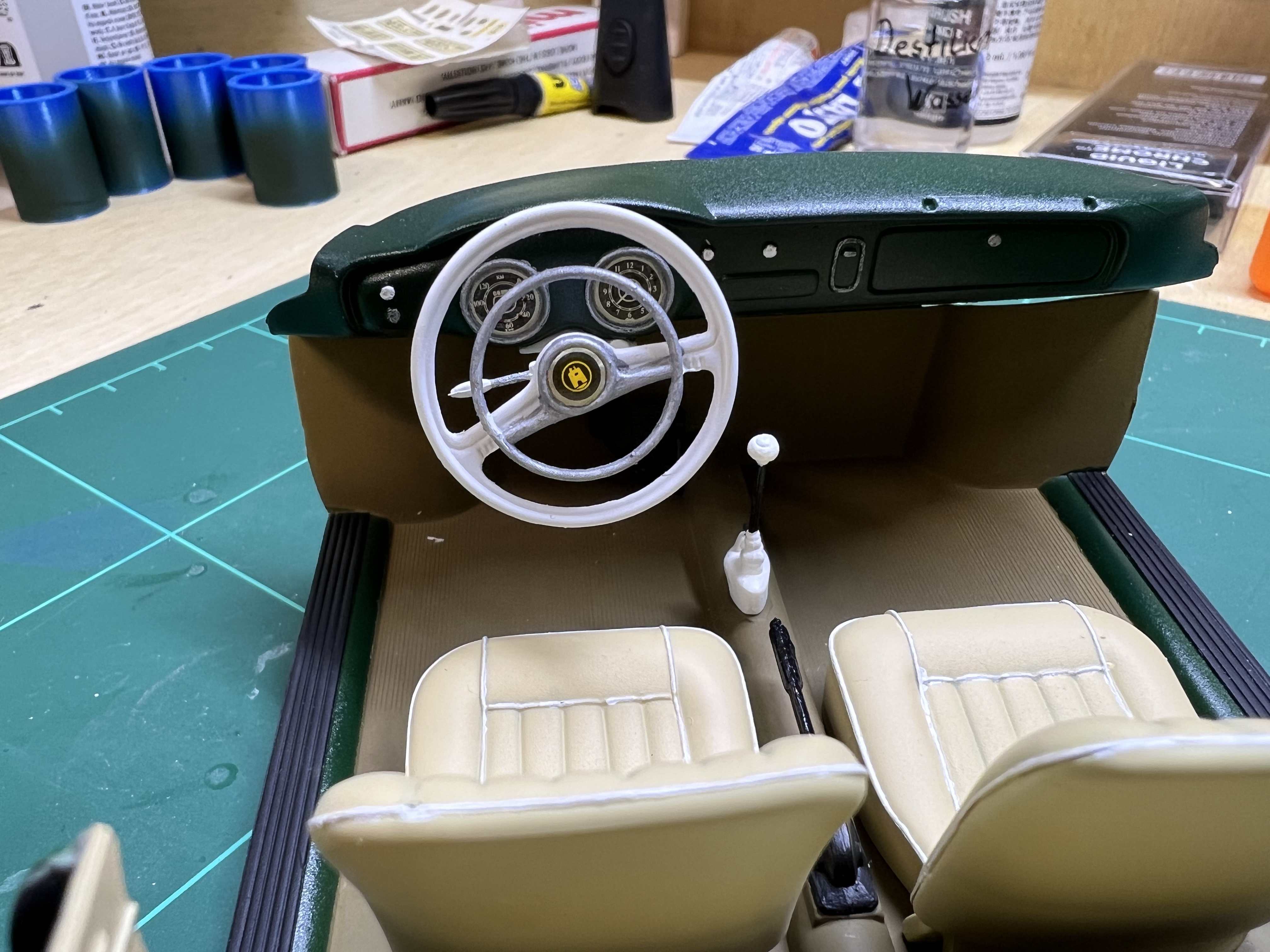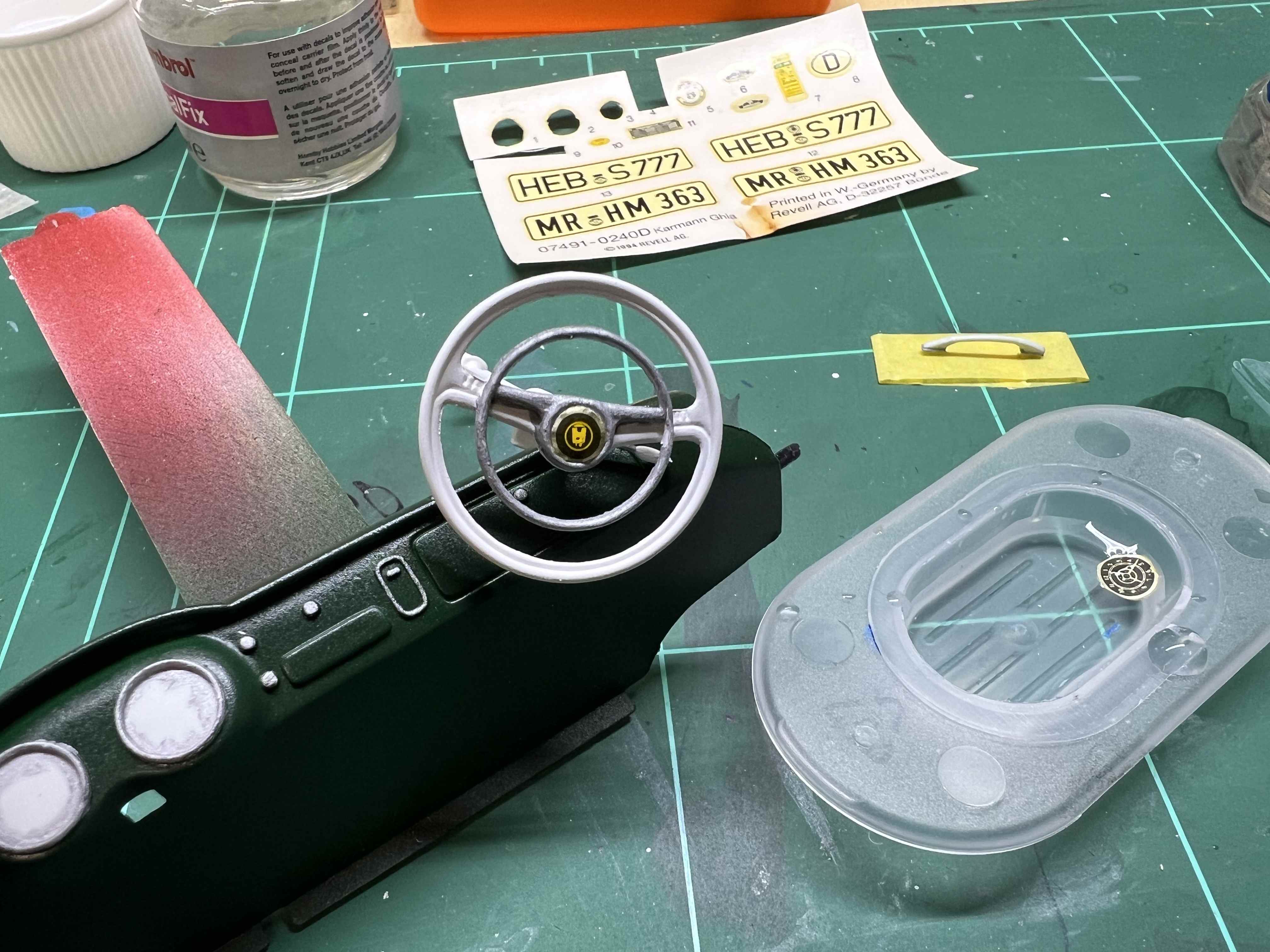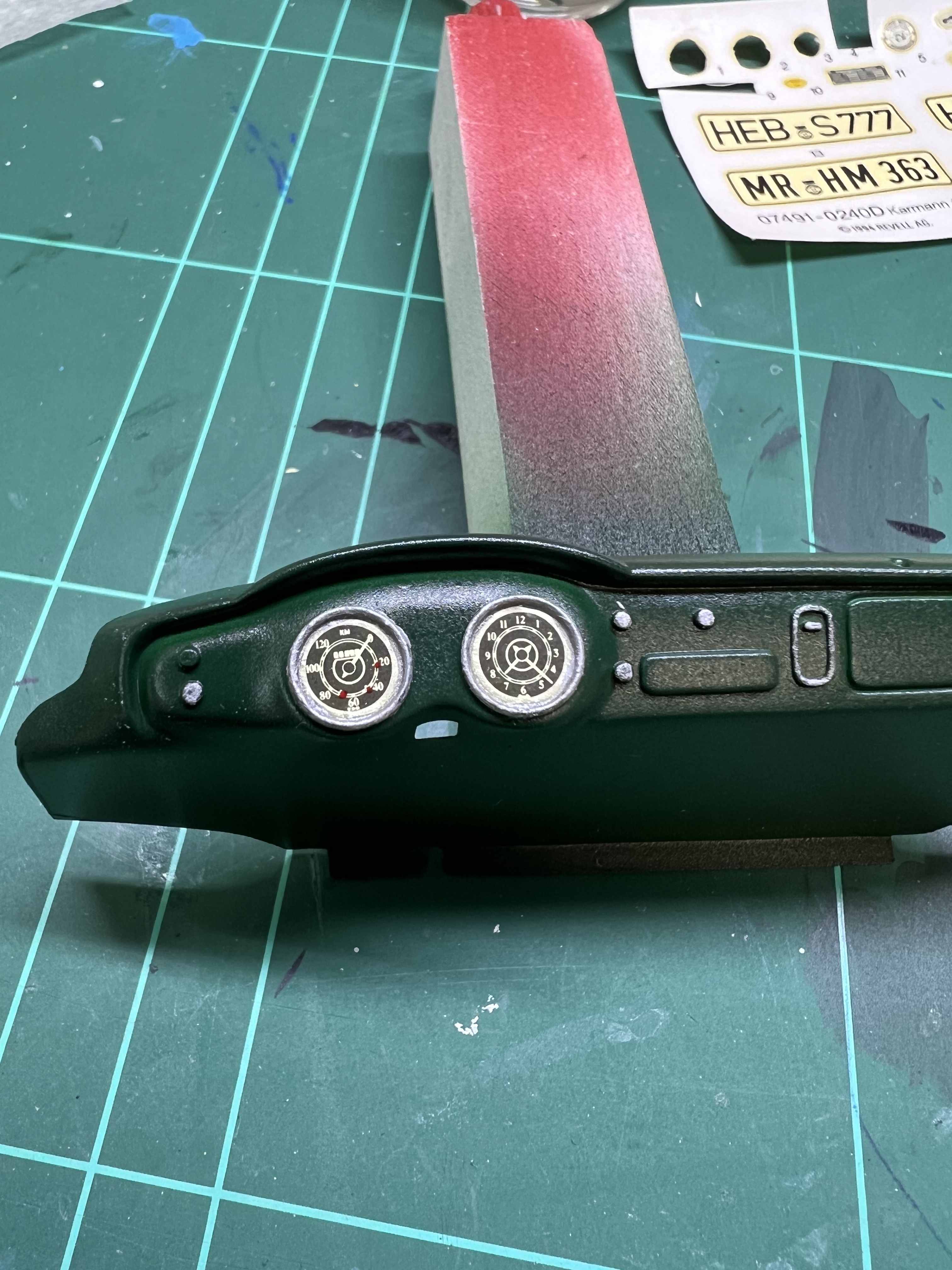 Nach dem das Armaturenbrett lackiert und ein paar Schichten Klarlack gesehen hat. Habe ich die Details bemalt und mich an die Decals gemacht.