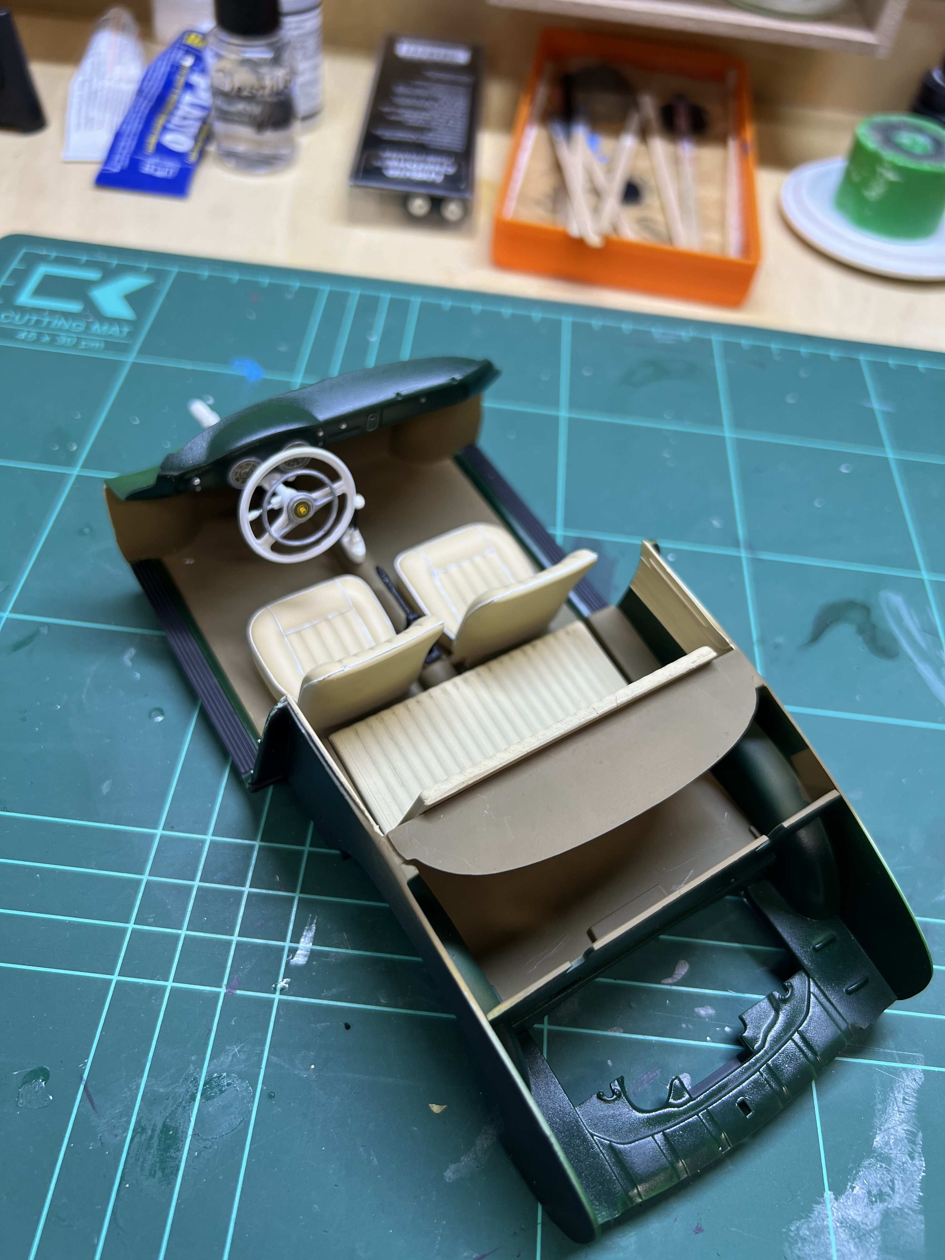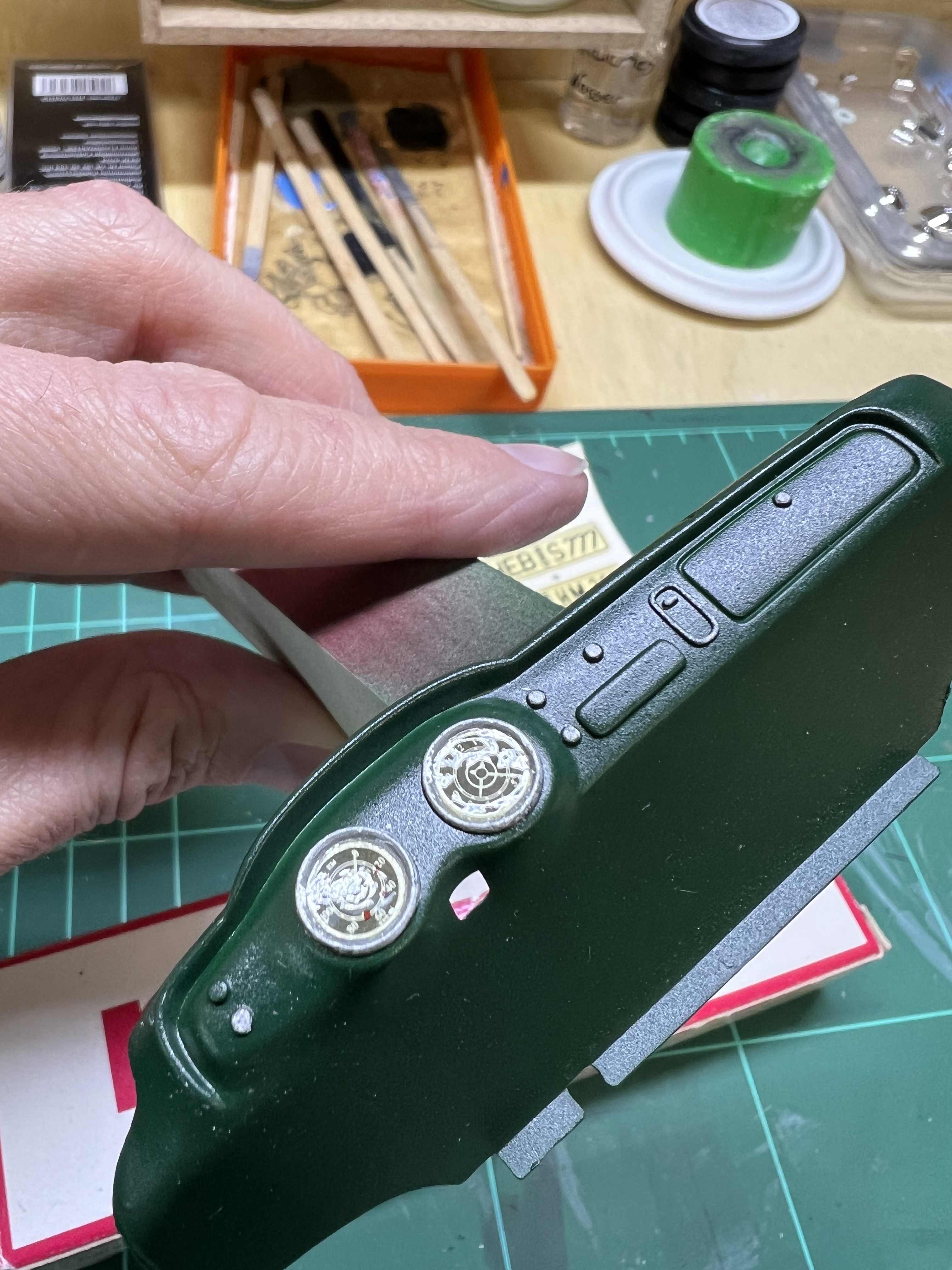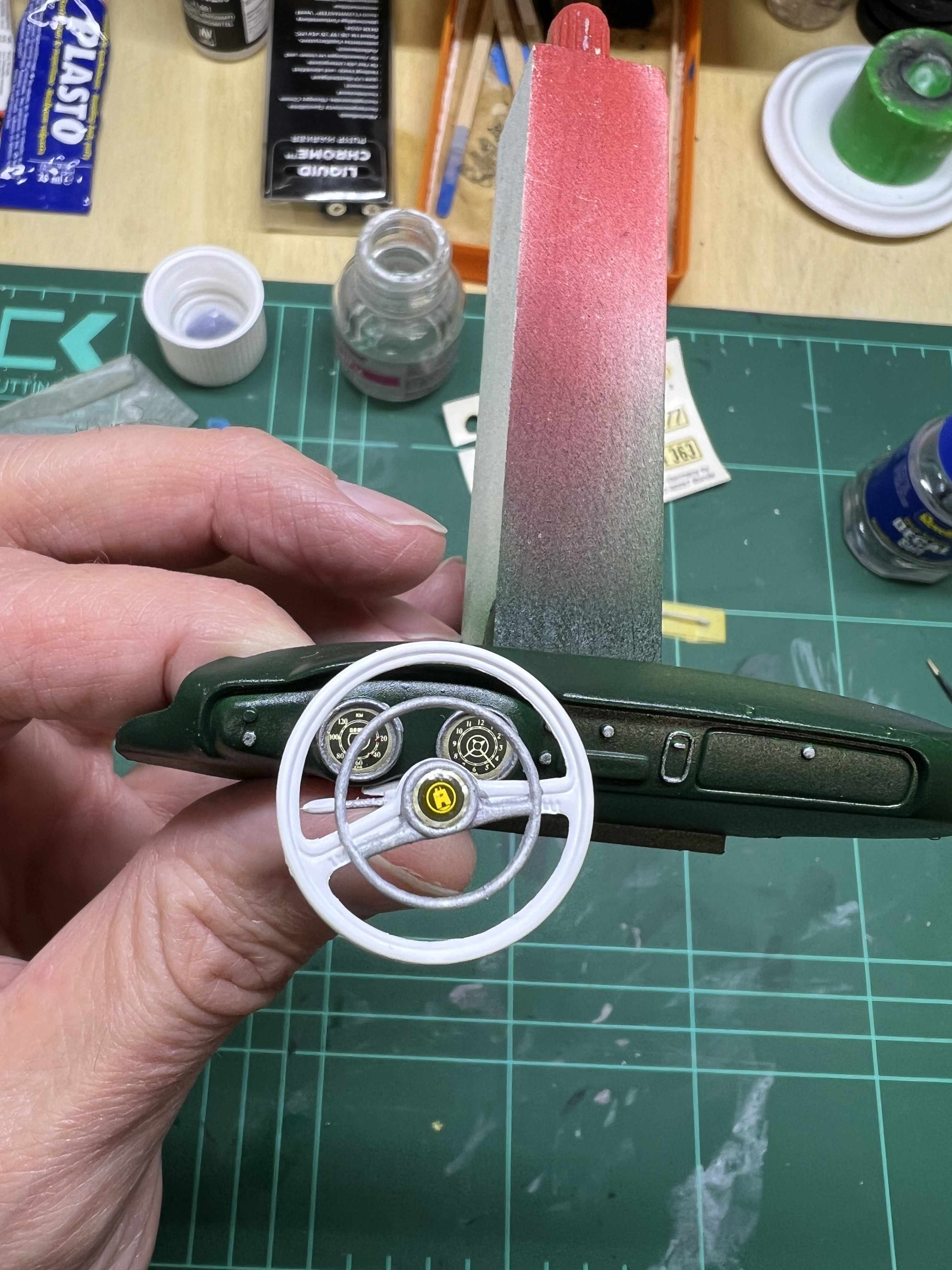 Nach dem das Armaturenbrett lackiert und ein paar Schichten Klarlack gesehen hat. Habe ich die Details bemalt und mich an die Decals gemacht.