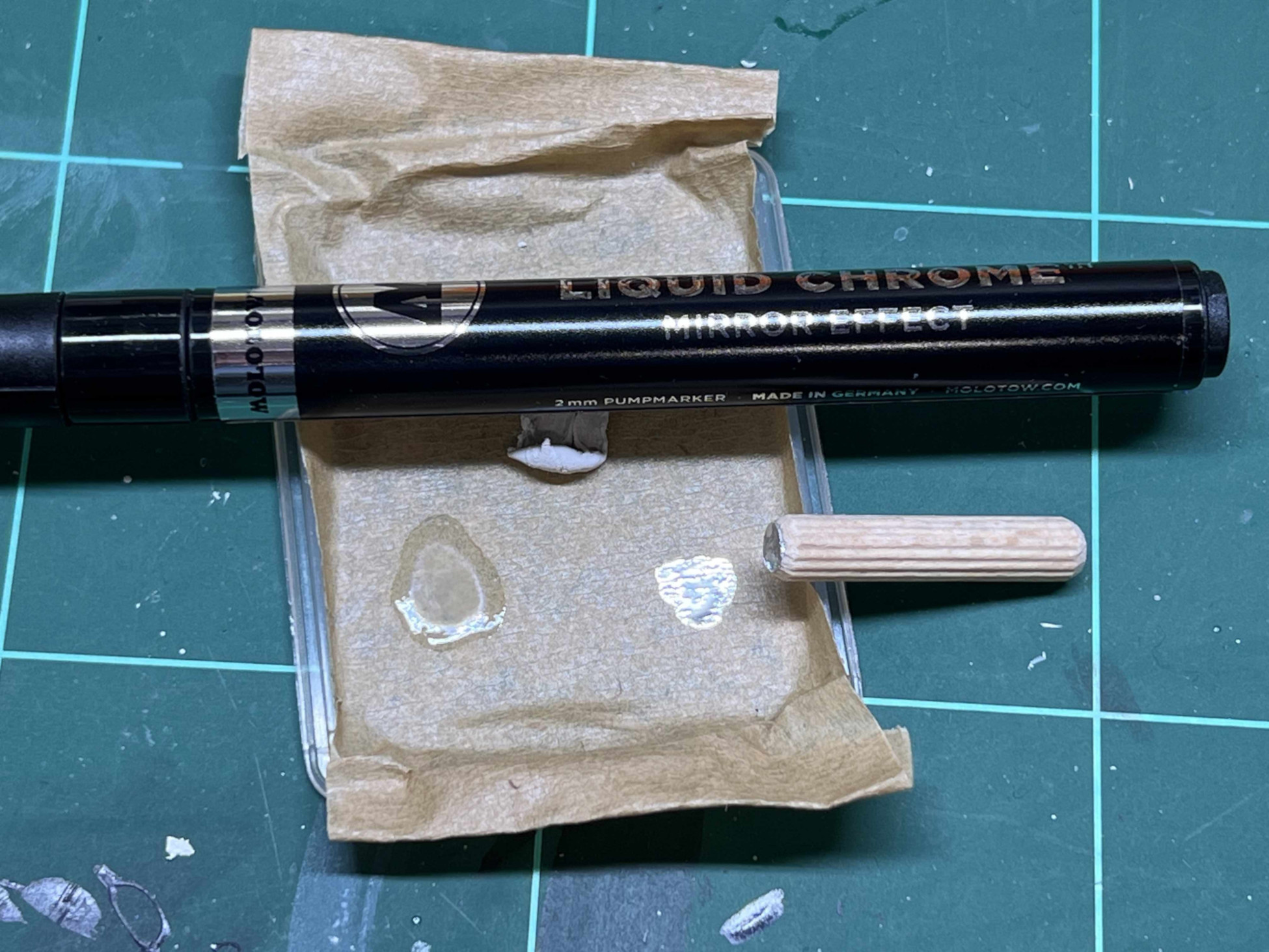 Also habe ich mir Chromstifte besorgt. Die Stifte sind wie die meisten Lackstifte zum Pumpen. Das heißt durch mehrmaliges eindrücken der Spitze fließt vorne der Lack raus. Diesen habe ich auf eine Unterlage tropfen lassen.