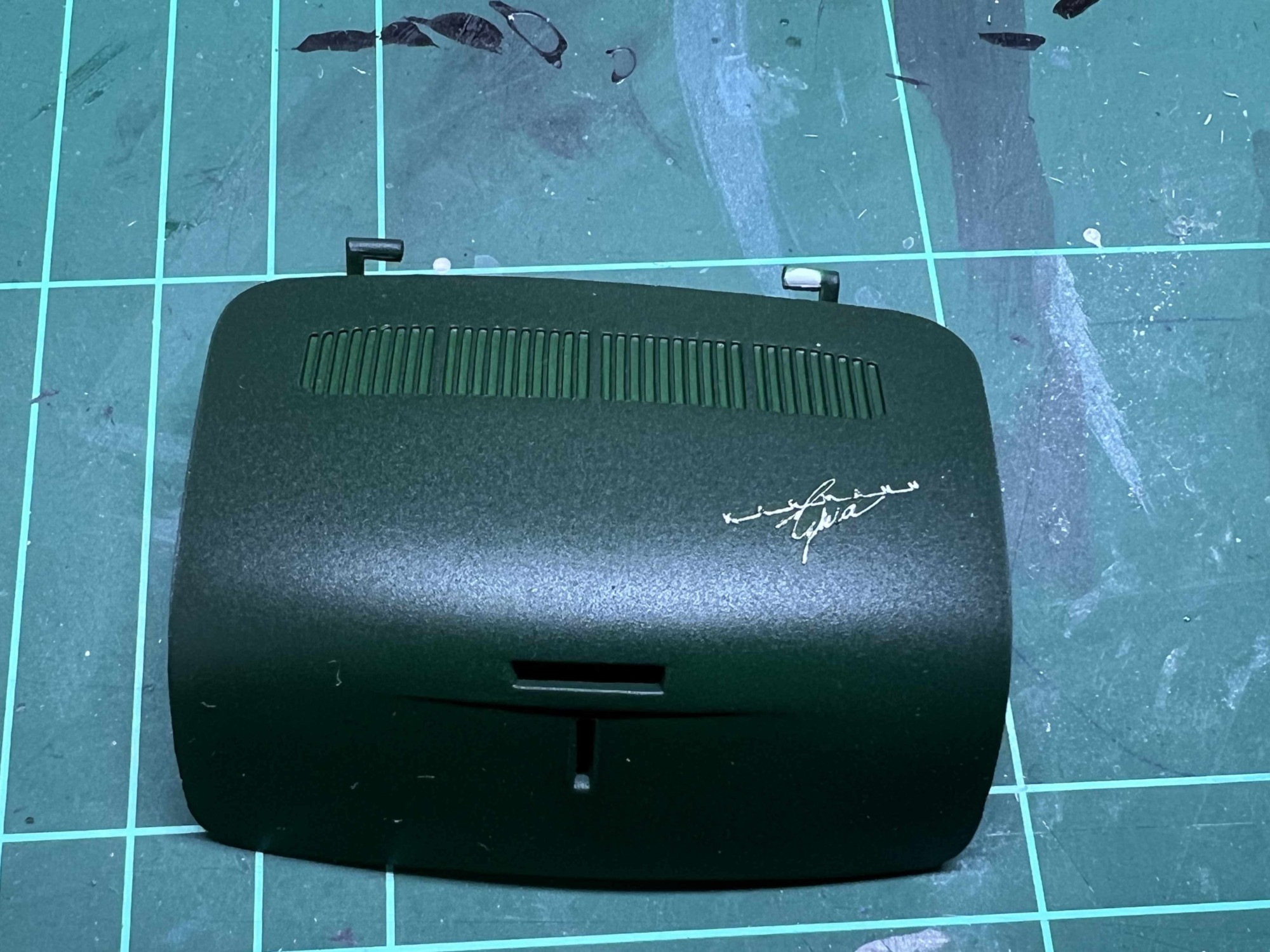 Die Lüftungsschlitze werde ich noch schwarz machen, aber das passiert ganz zum Schluss. Ich werde das wahrscheinlich mit einer sehr verdünnten Farbe machen. Vorher wird der Klarlack noch geschliffen und poliert.